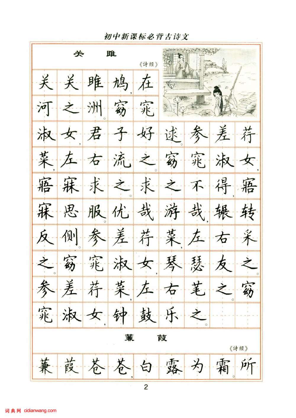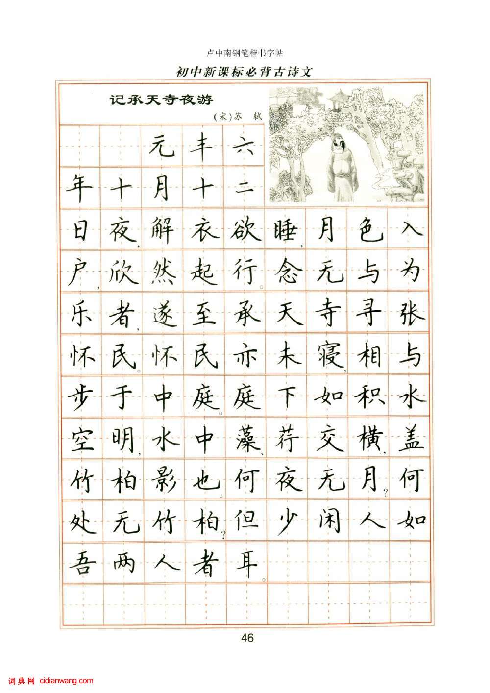 盧中南鋼硬筆書字帖《國中新課標必背古詩文》,本字帖是盧中南的一本硬筆楷書書法字帖,45頁,高清字帖,集合了國中新課標的必備古詩文,如《記承天寺夜遊》、《關雎》、《蒹葭》、《游山西村》等等,既學了古詩也學了鋼筆書法。