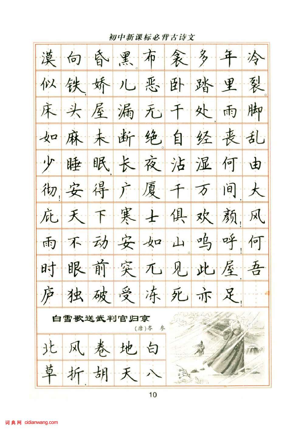 資源下載魏晉書法唐朝書法宋朝書法元朝書法明朝書法清朝書法近現代書法字典網>> 歷代書法>> 近現代>> 盧中南硬筆楷書字帖《國中新課標必背古詩文》(4)正文 盧中南硬筆楷書字帖《國中新課標必背古詩文》(4)作者:盧中南 書體:楷書 首 頁 上一頁 1 2 3 4 5 6 7 8 9 10 下一頁 尾 頁 全文2017-9-16 13:45:06 盧中南的相關書法作品:盧中南楷書《蘭亭序》 盧中南硬筆楷書字帖《國中新課標必背古詩文》 盧中南《故宮百聯》 盧中南楷書《題衛夫人筆陣圖後》 盧中南硬筆楷書《臨歐陽詢皇甫誕碑》 盧中南鋼筆臨歐陽詢《虞恭公溫彥博碑》 盧中南楷書《中國成語300句》 盧中南楷書《書法雅言》 盧中南硬筆《楷書5000常用字》 相關文章:張鳳翼·題周天球《桃花書屋書法卷》 (行書)張鳳翼題周天球《桃花書屋書法卷》,行書。米芾《清和帖》 (不詳)【釋文】芾啟。久違傾仰,夏序清和,起居何如?衰年趨召,不得久留,伏惟珍愛。米一斛...唐人草書《月儀帖》 (草書)《唐人月儀帖》黃麻紙本墨跡,無款,傳唐人書,又名《唐人二十月友朋相聞書》。鈐有“...漢碑隸書之精品《肥致碑》 (隸書)《肥致碑》全稱《河南梁東安樂肥君之碑》建於東漢建寧二年(一六九)五月,碑高九十七...練毛筆字入門常識:怎么選毛筆學寫毛筆字之前,首先得準備必備工具,那就是古人稱之為“文房四寶”的筆、墨、紙、硯...蔡襄楷書《萬安橋記》碑 (楷書)北宋蔡襄《萬安橋記》全文共153字,用楷體書寫,記載造橋的時間、年代、橋的長寬、...王守仁行草《若耶溪送友詩稿》冊 (行草)王守仁《若耶溪送友詩稿》冊 行草書 27×12cm×15 紐約蘇富比2014...林散之《贈朱小平草書脫俗寫生七言聯》 (草書)林散之《贈朱小平草書脫俗寫生七言聯》紙本草書 1976年 釋文:脫俗書成一家法,...蔡翛·致子通都監尺牘 (行書)【釋文】翛啟 辱手畢 伏承尊候萬福 至以感慰 承薰修未畢 來日不得晤見 豈任馳情...阮元·行書卷 (行書)《行書卷》,阮元。 阮元(1764-1849),字伯元,號芸台,江蘇儀征(今揚...
