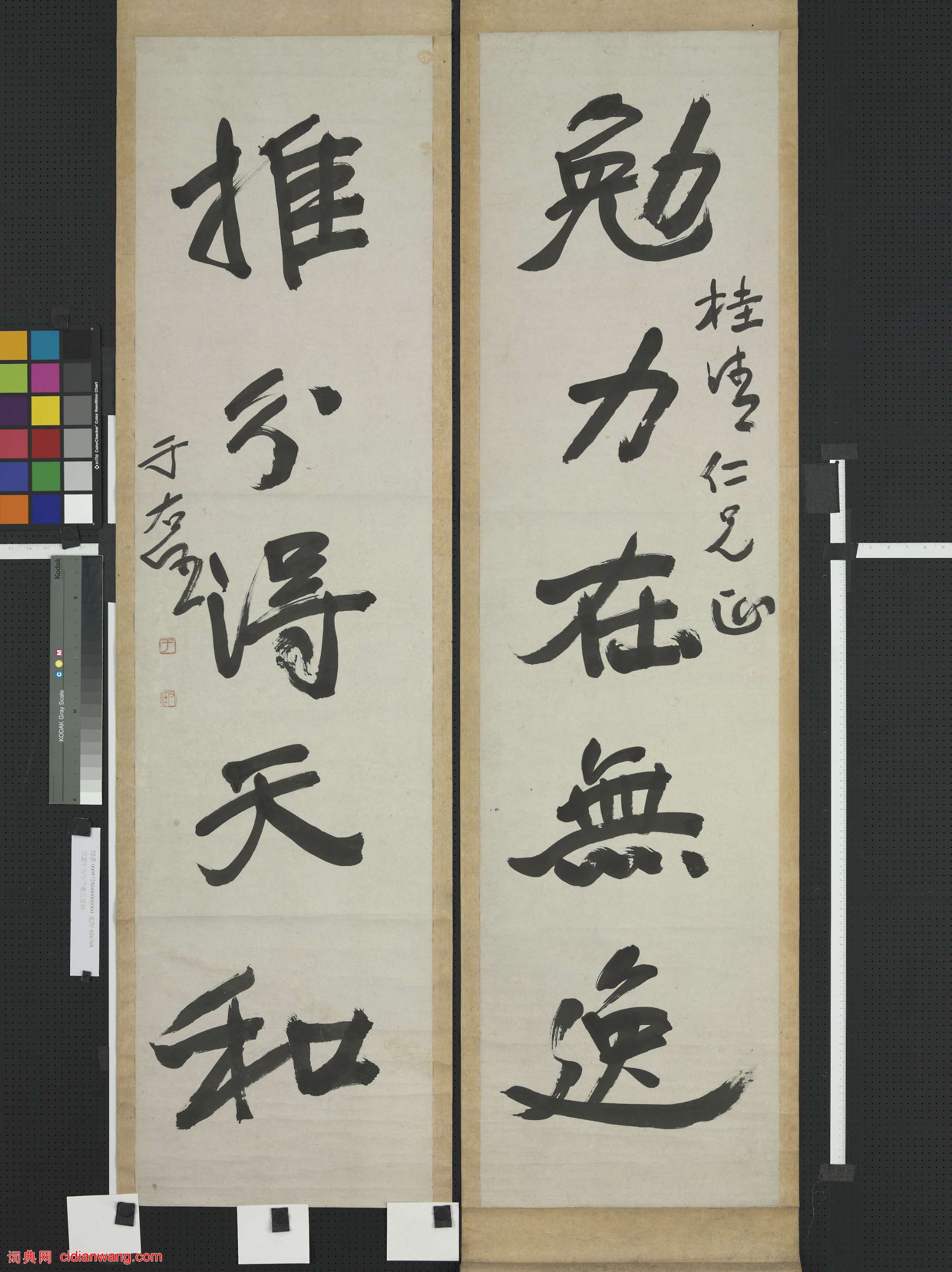 于右任《行書勉力推分五言聯》絹本行書 165.6×42cm 台北故宮博物院藏