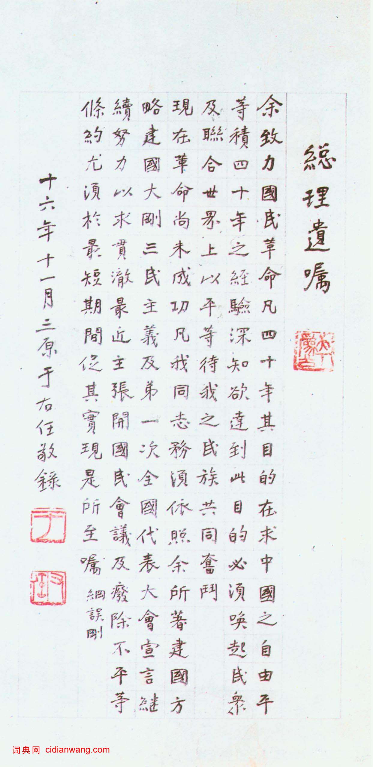 現在革命尚未成功,凡我同志,務須依照余所著《建國方略》、《建國大綱》、《三民主義》及《第一次全國代表大會宣言》,繼續努力,以求貫徹。最近主張開國民會議及廢除不平等條約,尤須於最短期間,促其實現。是所至囑!(綱誤剛)