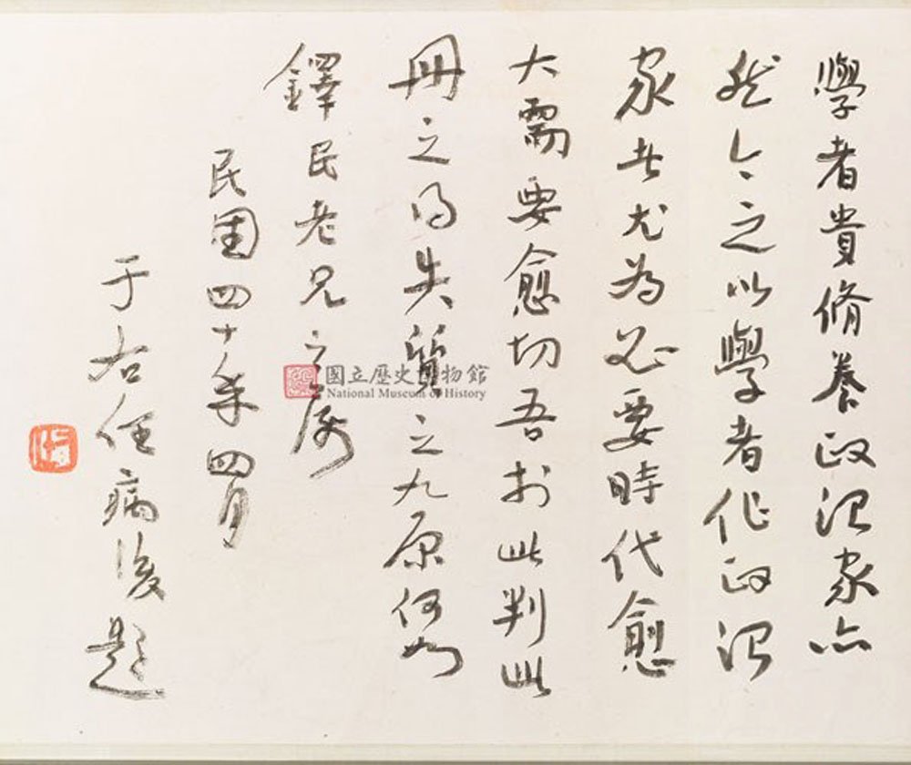 書法欣賞魏晉書法唐朝書法宋朝書法元朝書法明朝書法清朝書法近現代書法字典網>> 歷代書法>> 近現代>> 于右任《題章太炎祭黎元洪文稿跋》正文 于右任《題章太炎祭黎元洪文稿跋》作者:于右任 書體:草書 于右任《題章太炎祭黎元洪文稿跋》(1951年)縱27cm 台北國立歷史博物館藏 【資料來源】來自於《中國書法》1998.6 台北國立歷史博物館2018-1-19 9:20:49 于右任的相關書法作品:于右任《楷書胡勵生墓志銘》 于右任《行書詩句》 于右任《行書翠亨村紀事詩之一詩軸》 于右任《草書杜牧詩一首》 于右任《標準草書草聖千文》 于右任《行書志士故人五言聯》 于右任《草書無極顯仁五言聯》 于右任行書《願持常與五言聯》 于右任《行書桑麻慧業五言聯》 相關文章:郭畀·青玉荷盤詩 (行書)【釋文】 太常金奉禮宴翰苑諸公,出青玉荷盤,色奇古。盤之上擎杯,象蓮蓬,下屈為柄...王鐸《草書冊》 (草書)王鐸《草書冊》 海外華裔私人藏釋文:當秋暮雨煙欲飛,鶴來亭樹, 攜榼登嘯,殊開...王知敬《明徵君碑》篆書題額 (篆書)王知敬唐代懷州河內(今河南沁陽)人。 官太子家令。望出太原,歷任秘書郎、少府監丞...倪元璐行書《致台翁手札》 (行書)倪元璐《致台翁手札》行書 此札內容為慰亡,寫得沉痛哀婉,但又以通脫之觀點為生者解...斷臂人張文佑書法欣賞 (行書)張文佑,字德輔,號月台經生。1970年生,河南襄城人,中國書法家協會會員。張文佑...于右任行書《願持常與五言聯》 (行書)于右任行書《願持常與五言聯》釋文:願持山作壽,常與鶴為群于右任題識:作彬先生法家...董其昌行草跋《張旭草書古詩四帖卷》 (行草)明代董其昌行書題跋《張旭草書古詩四帖卷》,遼寧省博物館藏。釋文:唐張長史書庾開府...楊維楨草書《張氏通波阡表卷》 (草書)元代楊維楨晚年草書的代表作品《張氏通波阡表》,章草書法長卷,至正25年(1365...鄧石如隸書《少學琴書冊》 (隸書)鄧石如《少學琴書冊》這本隸書冊這本隸書冊,作於嘉慶己未(1799)年。體勢值由雅...顏真卿行草《裴將軍詩》 (行草)浙江省博物館藏宋拓忠義堂法帖:顏真卿行草書《裴將軍詩》 ,又稱《送裴將軍北伐詩卷...