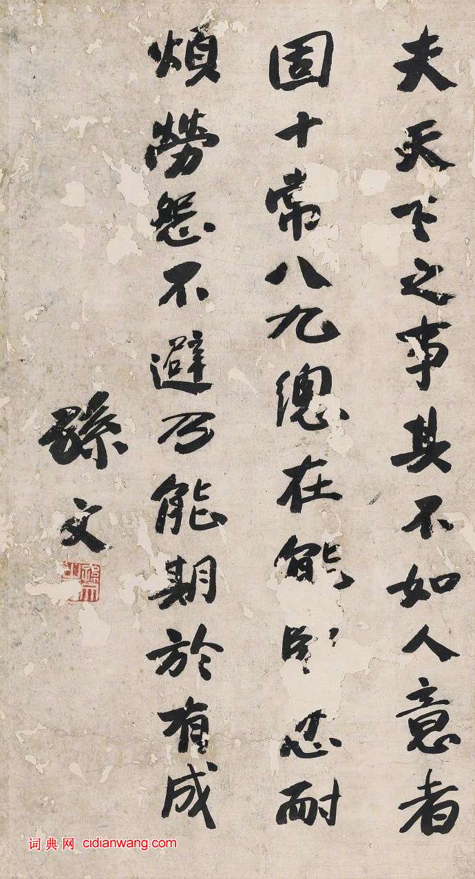 書法欣賞魏晉書法唐朝書法宋朝書法元朝書法明朝書法清朝書法近現代書法字典網>> 歷代書法>> 近現代>> 孫文楷書醒世格言正文 孫文楷書醒世格言作者:孫文 書體:楷書 釋文:夫天下之事,其不如人意者,固十常八九。總在能堅忍耐煩勞怨不避,乃能期於有成。款識:孫文鈐印:孫文之印 2018-2-9 19:21:10 孫文的相關書法作品:孫文楷書醒世格言 孫文楷書《天下為公》 相關文章:釋擔當·行草書四言詩軸 (行草)【釋文】即心是佛,砒霜狠毒。起死回生,不消一服。擔當。釋擔當《行草書四言詩軸》,...金農《為馬曰琯作畫詩》 (隸書)金農《為馬曰琯作畫詩》,紐約大都會博物館藏。東漢隸書《漢郎中鄭固碑》 (隸書)全稱《漢郎中鄭固碑》,東漢延熹元年(158年)四月立,隸書。15行,行29字。 ...唐寅行書《千金良夜七言律詩軸》 (行書)唐寅《“千金良夜”七言律詩軸》紙本行書 140×25.2cm 台北故宮博物院藏...王寵草書《送李願歸盤谷序》 (草書)王寵 草書《送李願歸盤谷序》灑金紙本 縱25.8公分 橫1103.6公分 台北故...柯九思·行楷題趙孟頫補書唐人臨王右軍瞻漢二帖 (行楷)柯九思《行楷題趙孟頫補書唐人臨王右軍瞻漢二帖》,來自北京匡時國際拍賣有限公司20...馮桂芬《六言聯》 (行書)釋文:結德言而為佩,援雅範以自綏。大意是:集結美好的名聲作為人身的飾品,更以優雅...倪瓚題《修竹圖軸》 (小楷)倪瓚題《修竹圖軸》1374年 釋文:二月六日夜宿幻住精舍。明日寫竹枝遺無學上人。...陸潤庠《行書疏林高閣七言聯》 (行書)陸潤庠《行書疏林高閣七言聯》紙本行書 124×28.5cm×2 上海博物館藏...唐楷書《等慈寺碑》 (楷書)全稱《大唐皇帝等慈寺之碑》。唐顏師古撰。無書人姓名。無立碑年月。宋趙明誠《金石錄...