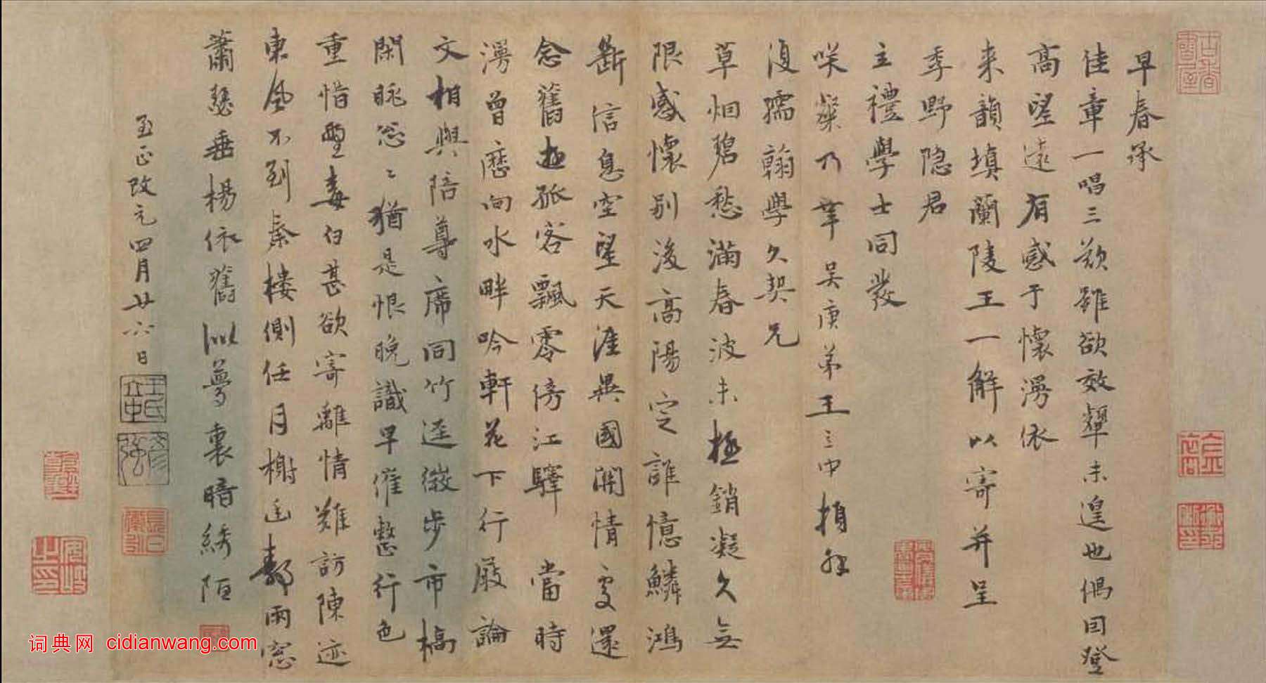 早春承佳章,一唱三嘆,雖欲效顰,未逞也。偶因登高望遠,有感於懷,漫依來韻,填蘭陵王一解以寄,並呈季野隱君、立禮學士同發笑粲,乃幸。吳庚弟王立中頓拜。復儒翰學久契兄:草煙碧,愁滿春波未極。銷凝久,無限感懷,別後高陽定誰憶。鱗鴻斷信息,空望天涯異國。關情處,還念舊遊,孤客飄零傍江驛。當時漫曾歷。向水畔吟軒,花下行屐,論文相與陪尊席。同竹逕微步,市橋閒眺,總總猶是恨晚識。早催整形色。重惜野毒白甚,欲寄離情,難訪陳跡。東風不到秦樓側,任月榭幽靜,雨窗蕭瑟,垂楊依舊。似夢裡,暗繡陌。至正改元四月廿六日。
