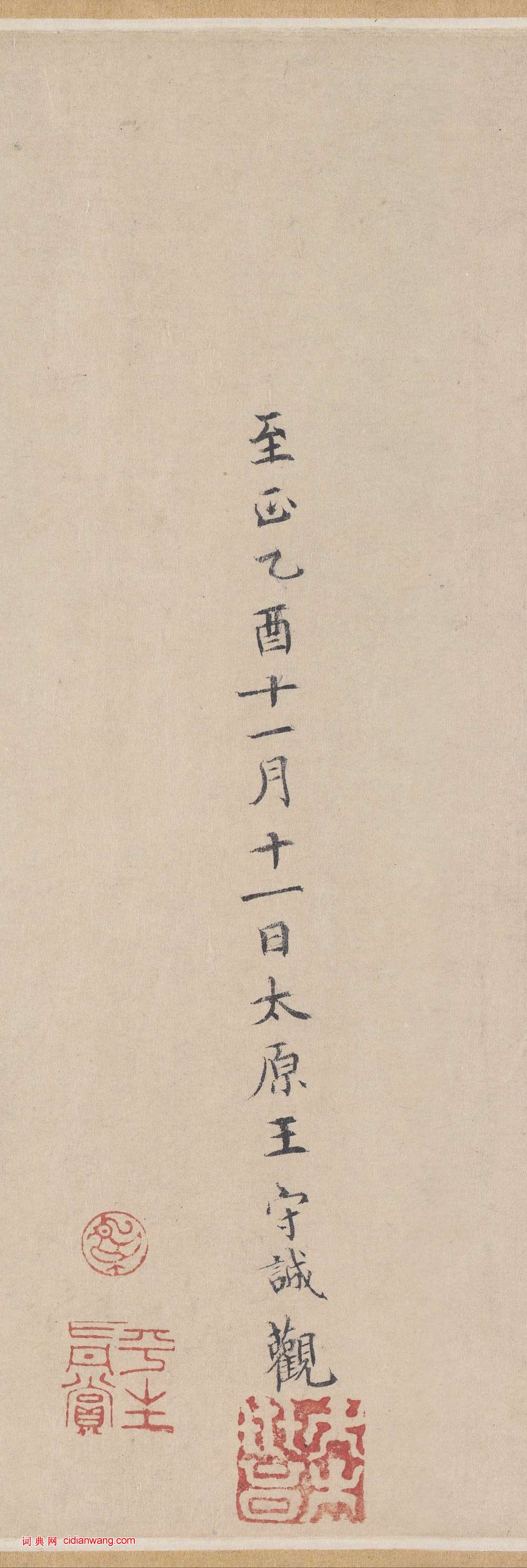 書法欣賞魏晉書法唐朝書法宋朝書法元朝書法明朝書法清朝書法近現代書法字典網>> 歷代書法>> 近現代>> 王守誠《神龍本蘭亭序觀款》正文 王守誠《神龍本蘭亭序觀款》作者:王守誠 書體:小楷 元 王守誠《神龍本蘭亭序觀款》 北京故宮博物院藏 釋文:至正乙酉十一月十一日太原王守誠觀2018-3-23 17:11:35 王守誠的相關書法作品:王守誠《跋唐人臨王獻之飛鳥帖》 王守誠《神龍本蘭亭序觀款》 相關文章:林散之《隸書世界人間八言聯》 (隸書)林散之《隸書世界人間八言聯》紙本隸書 168×27cm×2 1962年 馬鞍...沙孟海《楷書繡簾寒藻五言聯》 (楷書)沙孟海《楷書繡簾寒藻五言聯》 68×32cm 1983年釋文:繡簾垂籙簌,寒...黃庭堅行書《齊君帖》 (行書)黃庭堅《齊君帖》 紙本行書 27.8×48.5cm 崇寧三年(1104年) 台...倪元璐草書《“章華宮人夜上樓”七言詩軸》 (草書)倪元璐《“章華宮人夜上樓”七言詩軸》 紙本行草書,134×50.8cm。日本東...實用《西狹頌》集聯《西狹頌》全稱《漢武都太守漢陽阿陽李翕西狹頌》,亦稱《李翕頌》《黃龍碑》,位於甘...鄭燮《行書李白詩軸》 (行書)鄭燮《行書李白詩軸》紙本行書 183.5×94.3cm 1763年 湖南省博物...趙孟頫行書臨褚遂良《枯樹賦》 (行書)趙孟頫行書臨褚遂良《枯樹賦》,大德三年(1299)九月二日書。大德三年(1299...鄭簠《隸書蘇軾跋句軸》 (隸書)鄭簠《隸書蘇軾跋句軸》紙本隸書 127×56.7cm,天津博物館藏 ...趙之謙《書畫扇面合景軸設色芍藥扇面》 (行書)趙之謙《書畫扇面合景軸——設色芍藥扇面》 51.5×18cm 西泠印社藏 款署...吳昌碩《篆書臨散氏盤銘軸》 (篆書)吳昌碩《篆書臨散氏盤銘軸》紙本篆書 149.8×25.5cm 1922年 浙江...