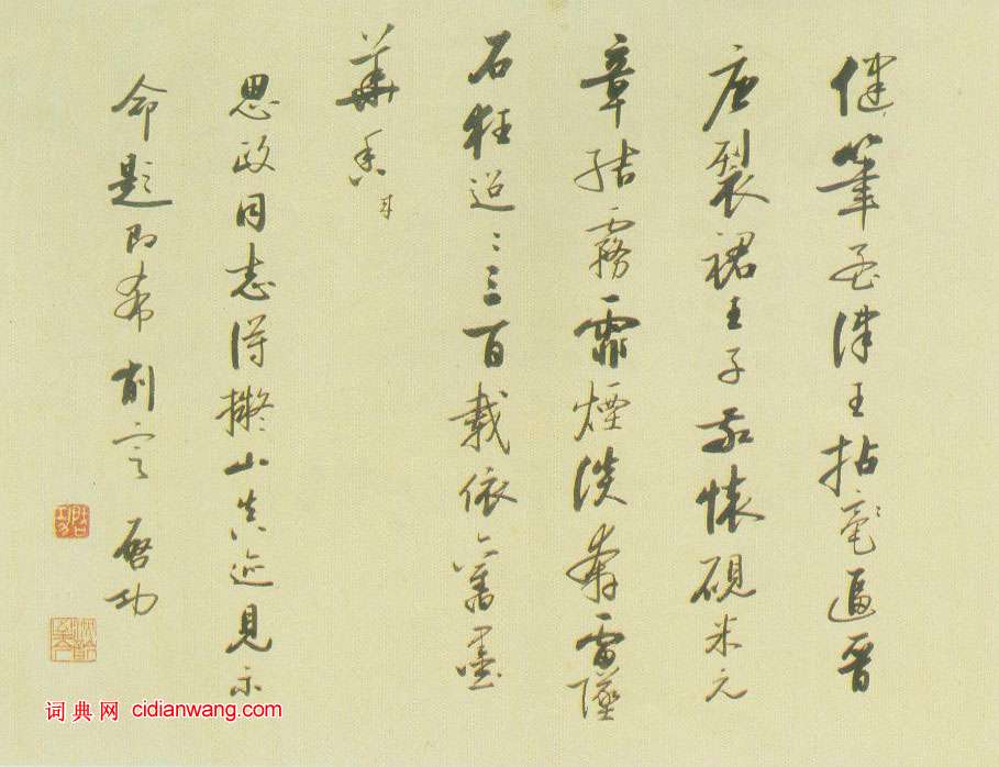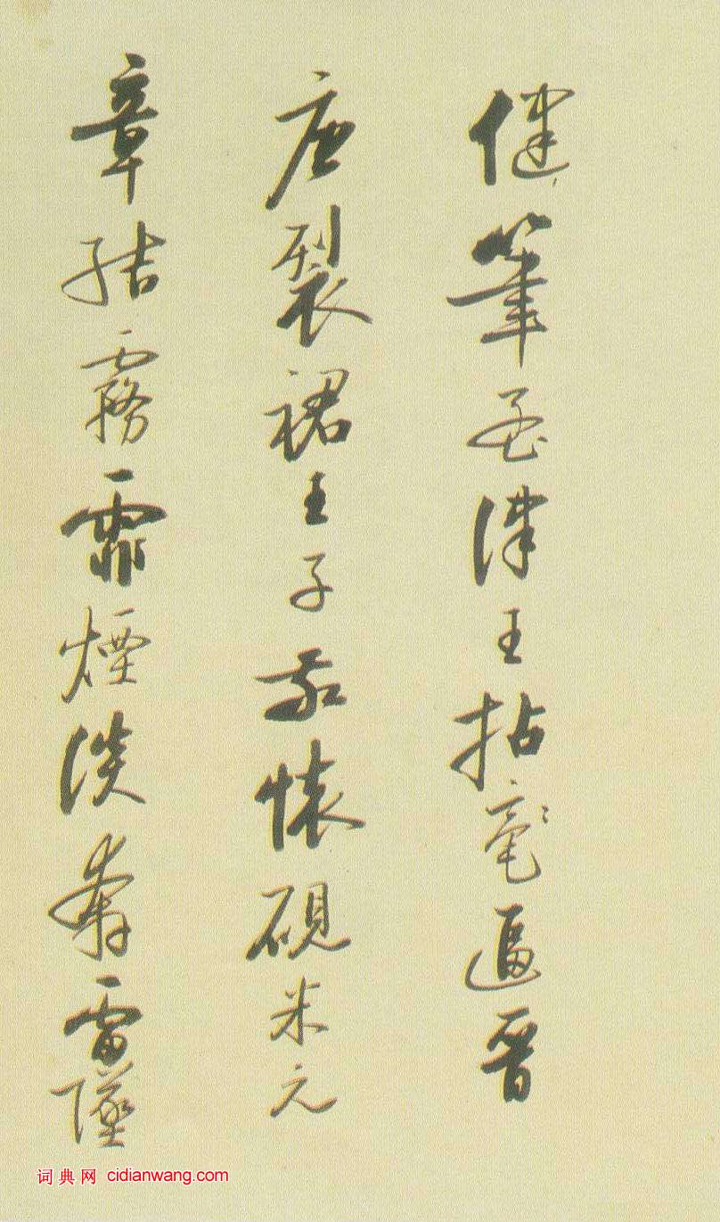 健筆孟津王,拈來逼晉唐。裂裙王子敬,懷硯米元章。結霧霏煙淡,奔雷墜石狂。迢迢三百載,依舊墨華香。