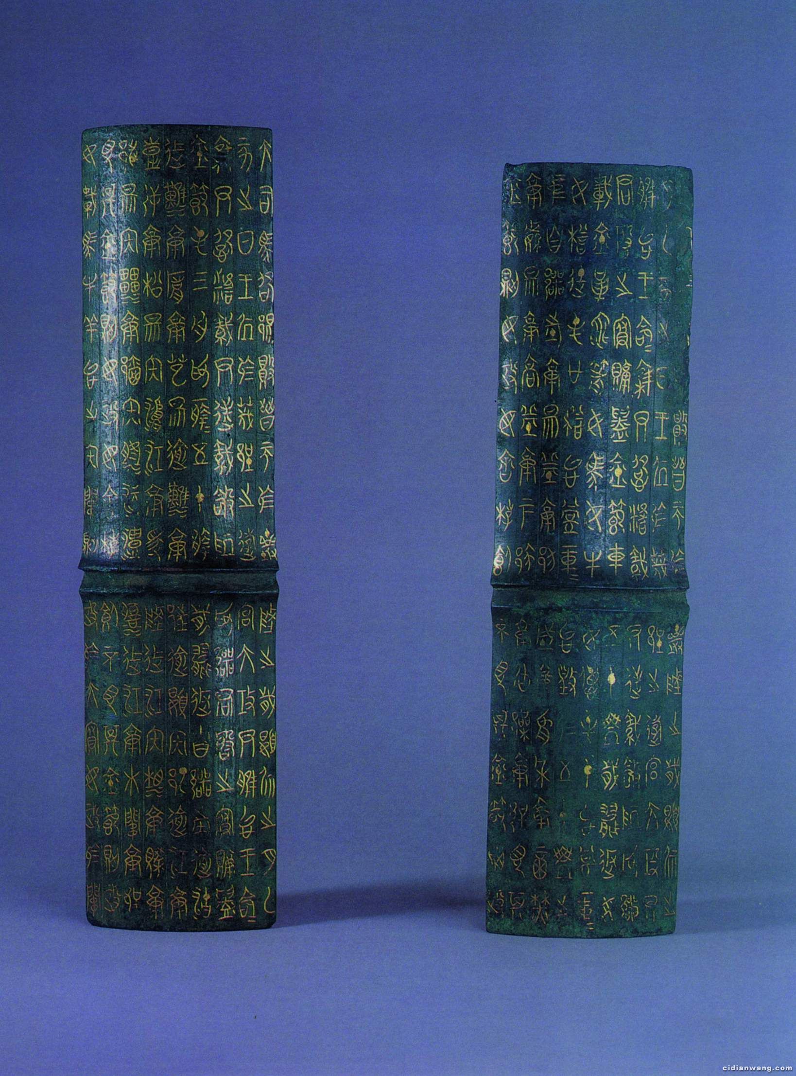 一九五七年出土於安微省壽縣,是戰國中期楚國器,青銅製成,形似剖開的竹節,是當時楚懷王(公元前三二八——前二九九年)發給受封在湖北鄂城的鄂君啟的水、陸通行符節。節上刻文圓潤秀勁,莊嚴肅穆,是錯金銘文中的精品。