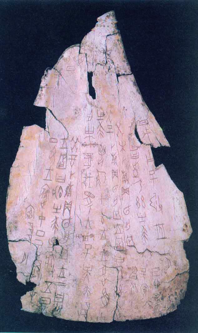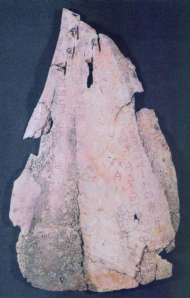 此骨系河南安陽出土,長32.2厘米,寬19.8厘米。是甲骨文斷代第一期商武王時期的一塊牛胛骨版記事刻辭。骨版巨大且完整,正反兩面共有一百六十餘字,背面字內填朱,色彩炫麗,內容為商代社會生活和天氣等方面情況,有重要的文史價值。字型瘦硬勁直,工整端嚴。 風格豪放,字形大小錯落,生動有致,各盡其態,富有變化而又自然瀟灑。不愧為甲骨文書法中的傑作。