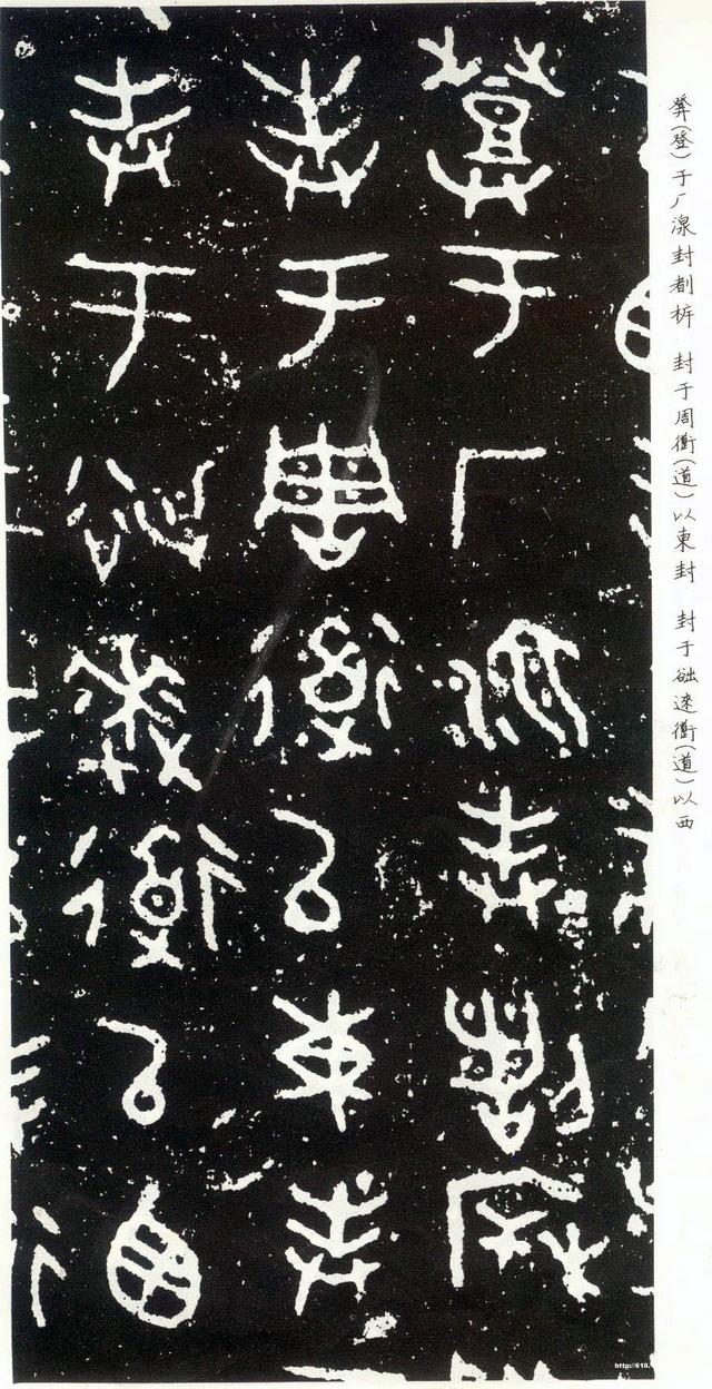 第三時期為春秋戰國時期的金文。春秋戰國時期,因特殊的政治因素,諸侯分裂、小國林立、思想活躍,藝術風格多姿多彩,從而帶來書風上的濃郁的地域色彩。陳振濂先生在其之書法史教程》中把金文的風格分為四大類,用在此處的東周列國時期更有實際的意義,“第一種類型是齊魯型、在山東一帶。