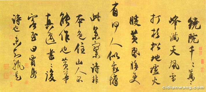 王庭筠《李山畫風雪杉松圖卷跋》,(畫)29.7×79.2cm,(全幅)31.2×1003.4cm。墨跡紙本,共十一行,六十字。現藏美國。王庭筠書法宗米芾,行筆疾速,富於變化。但不儘是米芾的風格,有他其自身的特點,書寫作風十分嚴謹。用筆中鋒、側鋒並使,點線豐腴厚實,絕少枯筆飛白;筆致俊逸,神氣超邁。章法方面,這幅字首尾布白相應,行距勻稱妥貼,對行與行的處理,注意揖讓呼應,達到相安相得。