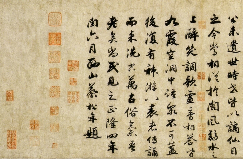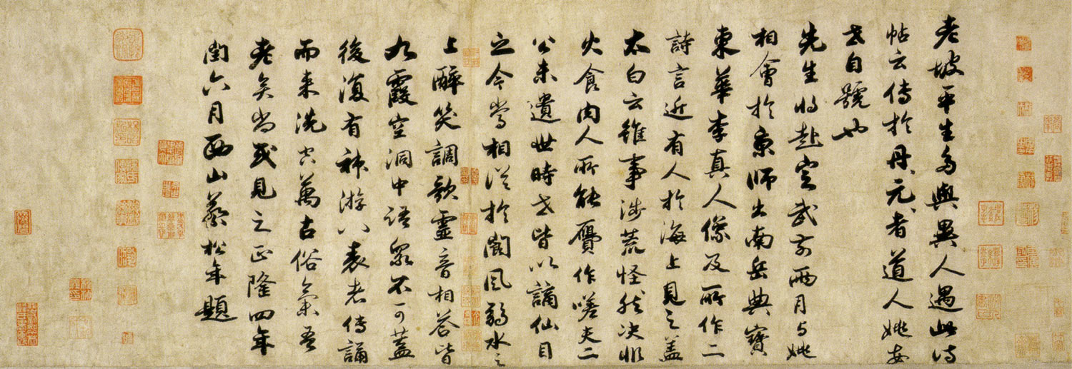 書法欣賞魏晉書法唐朝書法宋朝書法元朝書法明朝書法清朝書法近現代書法字典網>> 歷代書法>> 遼金元>> 蔡松年·跋蘇軾李白仙詩卷正文 蔡松年·跋蘇軾李白仙詩卷作者:蔡松年 書體:行書 蔡松年《跋蘇軾李白仙詩卷》,行書,有蘇東坡筆意。現藏日本大阪市立美術館。相關文章:歐陽玄楷書《春暉堂記》 (楷書)歐陽玄《春暉堂記》卷,紙本,楷書,縱29cm,橫102.9cm。北京故宮博物院藏...安弘嵩《大智度論殘卷》 (隸楷)安弘嵩《大智度論殘卷》(局部)紙本,隸楷書 25.1×342.5厘米 北京故宮...林散之行書《生天成佛》 (行書)林散之《生天成佛》紙本行書 75×20cm 1989年作 馬鞍山林散之藝術館藏...唐楷書《鞏賓墓誌》 (楷書)《鞏賓墓誌》,也稱《鞏賓暨妻陳氏墓誌》,全稱《周驃騎將軍右光祿大夫雲陽縣開國男鞏...孫過庭《草書千字文第五本卷》 (草書)孫過庭《草書千字文第五本卷》 白麻紙本 包首錦為宋紫鈐鸞鵲譜緙絲 縱25.7厘米...何紹基《楷書杜甫詩三首橫披》 (楷書)何紹基《楷書杜甫詩三首橫披》釋文:當代論才子,如公復幾人。驊騮開道路,鷹隼出風塵...鮮于樞·跋顏真卿祭侄文稿 (楷書)【釋文】唐太師魯公顏真卿書祭姪季明文稿,天下行書第二。余家法書第一。至元壬午春,...褚遂良《雁塔聖教序》 (楷書)《雁塔聖教序》亦稱《慈恩寺聖教序》,唐代褚遂良書。楷書,共1463字。公元653...左宗棠行書《一室四時七言聯》 (行書)左宗棠《行書“一室四時”七言聯》 長沙博物館藏釋文:一室莊嚴妻子佛,四時經濟米鹽...白玉蟾·足軒銘卷 (草書)【釋文】寄題足軒。奉似吾友周長高士,紫清白玉蟾。一丘一壑志願足,始縫掖時文史足。...