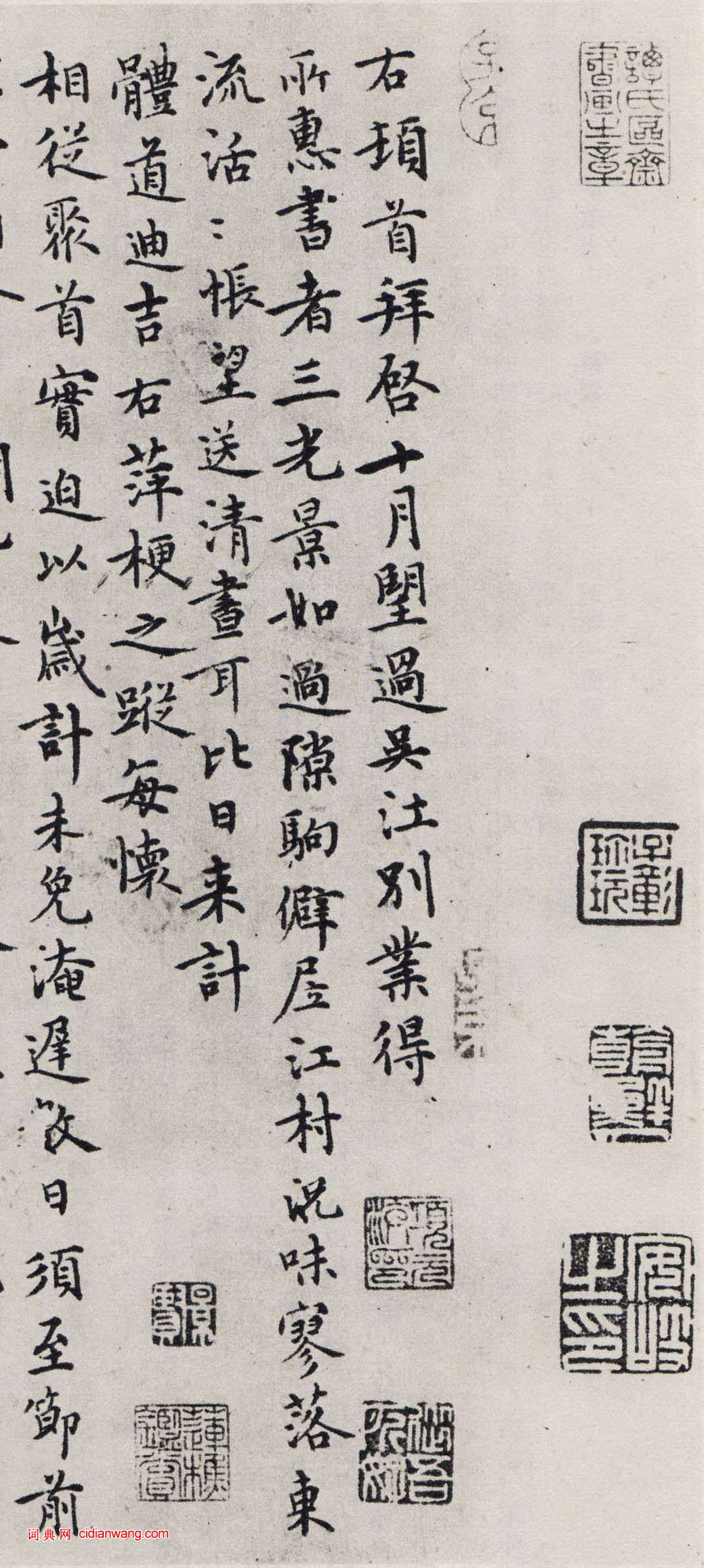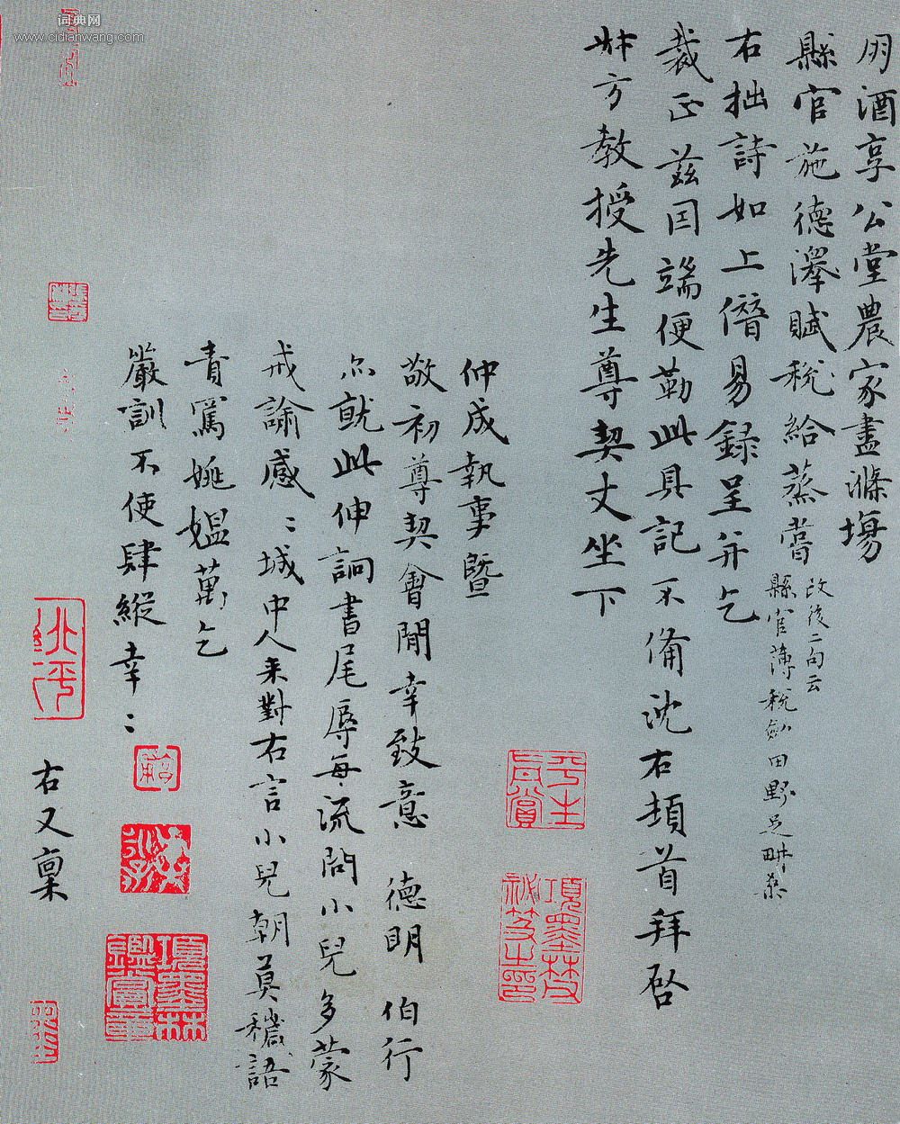 此帖是沈右寫給陳植的書信並詩5首。帖中提到了敬初(陳基)、明德(鄭元佑)、伯行(錢逵)3人,他們都是擅名當時的文人和書法家。有元一代,吳越地區是文人薈萃之地,這些文人在政治傾向、個人經歷、藝術創作等方面往往有相同或相似之處,因此彼此詩酒唱和,往來十分密切。這種現象在元代後期尤為明顯。沈右此帖便涉及了當時文人日常生活和彼此交往的某些方面。 沈右小楷以精緻、遒媚、古澹見稱,自成一家面目。此帖體勢端緊,筆筆妥貼,通篇自然協調,極具藝術品味。 《鐵網珊瑚》、《式古堂書畫匯考》、《平生壯觀》、《墨緣匯觀》、《三虞堂書畫目》等書著錄。