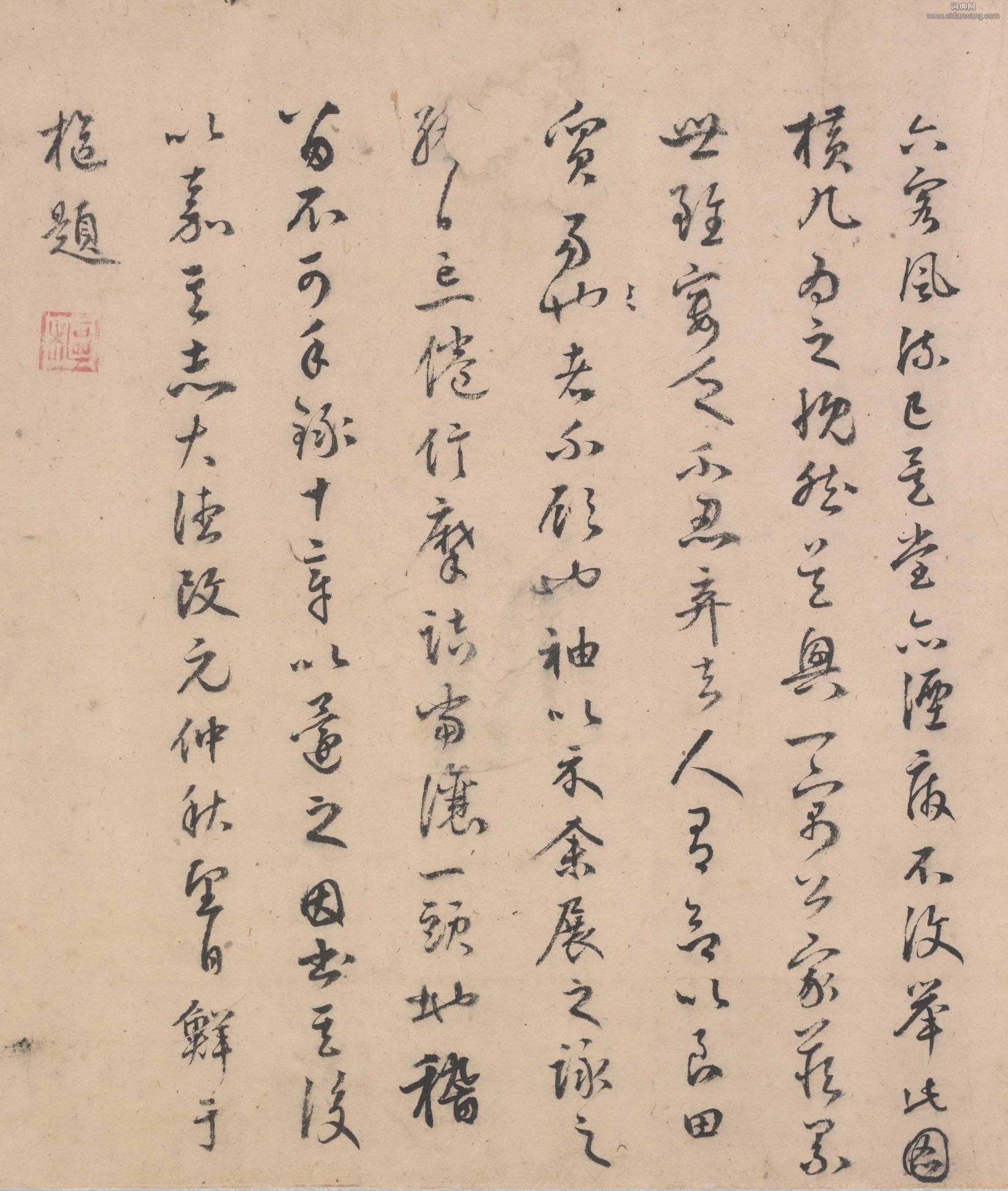書法欣賞魏晉書法唐朝書法宋朝書法元朝書法明朝書法清朝書法近現代書法字典網>> 歷代書法>> 遼金元>> 鮮于樞·跋張先《十詠圖》正文 鮮于樞·跋張先《十詠圖》作者:鮮于樞 書體:行草 鮮于樞跋張先《十詠圖》,故宮博物館藏。《十詠圖》卷,宋,張先繪,絹本,淡設色,畫心縱52cm,橫125.4cm。此圖是一幅山水人物畫,畫卷的開首部分便是吳興南園一角,主體建築為一座重檐歇山頂的樓閣,相配小亭欄桿迴環曲折,花草樹木掩映,庭中有鶴,亭角有花一株,環境幽雅而氣象恢宏。樓閣內,馬太守正陪二老對坐弈棋;小亭內,二老手扶欄桿,一面賞景一面閒話;另二老或攜琴或曳杖,款款而來。此外有童僕衙役陪伴侍候。鮮于樞的相關書法作品:鮮于樞·跋張先《十詠圖》 鮮于樞行草《醉時歌等唐人詩十二首》 鮮于樞小楷《老子道德經卷》 鮮于樞草書《韓愈進學解》 鮮于樞·跋顏真卿祭侄文稿 鮮于樞行書《韓愈送李願歸盤谷序卷》 鮮于樞《行草詩讚卷》 鮮于樞草書《杜甫魏將軍歌詩》 鮮于樞行草《書蘇軾海棠詩卷》 相關文章:康里巎巎行書題周朗《杜秋娘圖卷》 (行書)康里巎巎 題周朗《杜秋娘圖卷》 紙本 縱32.3cm 至元二年(1336) 北...黃道周行書《偶答張湛虛大理詩軸》 (行書)黃道周《偶答張湛虛大理詩軸》紙本 行書 244×71cm 首都博物館藏釋文:王...傅山楷書《竹雨茶煙聯》 (楷書)傅山《竹雨茶煙聯》軸 楷書 紙本 225×44cm×2 山西晉祠博物館藏 ...趙孟頫《洛神賦》 (行書)點擊查看《洛神賦》高清大圖《洛神賦》紙本,縱29.5公分,橫192.6公分,現藏...趙之謙《行書七言古詞四屏》 (行書)趙之謙《行書七言古詞四屏》 虎斑箋 各縱166.0cm 橫34.0cm 日本東京...草書之美,任何欣賞草書草書,是為了書寫便捷而產生的一種書體。《說文解字》中說:“漢興有草書”。草書始於...王文治·跋李隆基《鶺鴒頌》 (行書)王文治跋李隆基《鶺鴒頌》,紙本。台北故宮博物院收藏。黃道周行草《讀倪鴻寶疏五律詩軸》 (行草)黃道周《讀倪鴻寶疏五律詩軸》綾本 行草書 166×55cm 天津市博物館藏釋文...段天祐《安和帖》 (行書)【釋文】天佑頓首書奉起善賢契友執事:小林回,領書,承近候安和為喜。賤疾回杭又兩發...卞永譽·跋《褚摹蘭亭序》 (行書)卞永譽跋《褚摹蘭亭序》,題跋前後共五段。北京故宮博物院藏。卞永譽(1645-17...