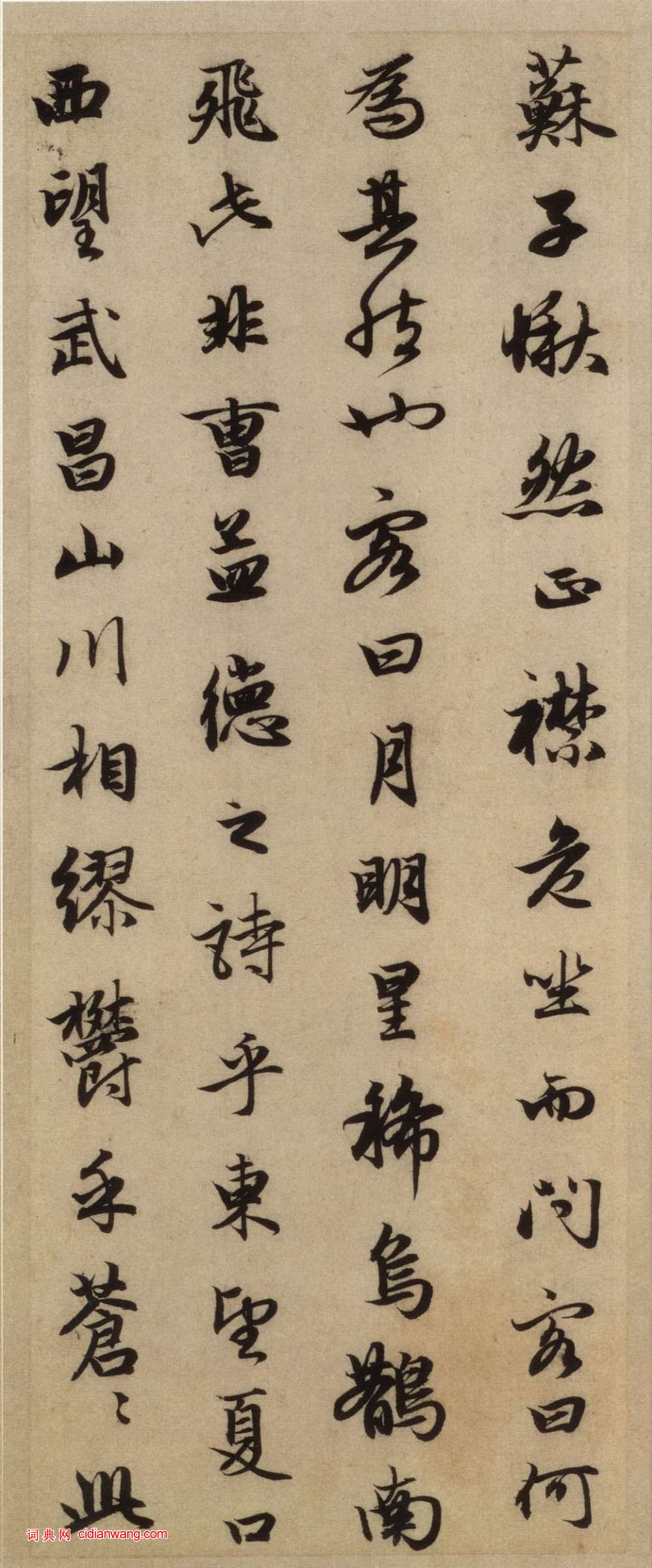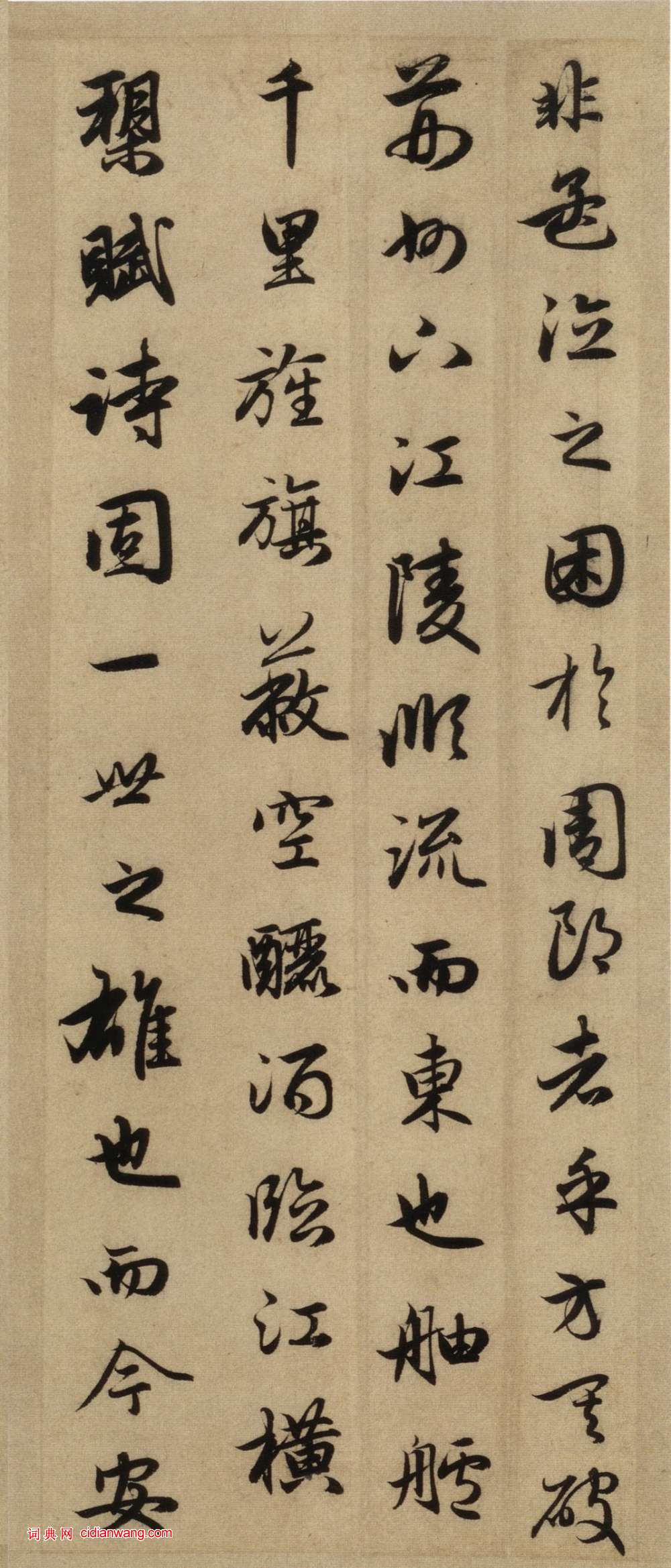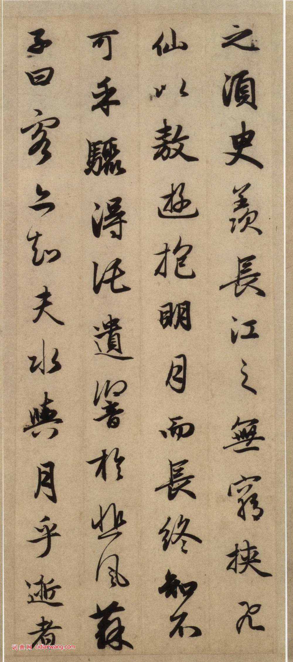 趙孟頫書蘇軾《前後赤壁賦》,並作東坡像於卷首。台北故宮博物院藏。《前後赤壁賦》紙本冊裝,共11開21頁,每頁縱27.2厘米,橫11.1厘米。帖共81行,935字。末署“大德辛丑正月八日,明遠弟以此紙求書二賦,為書於松雪齋,並作東坡像於卷首。子昂。”辛丑為大德五年(公元1301年)時趙孟頫48歲。這裡僅選《前赤壁賦》部分。該帖分行布白疏朗從容,用筆圓潤遒勁,宛轉流美,風骨內含,神彩飄逸,盡得魏晉風流遺韻。