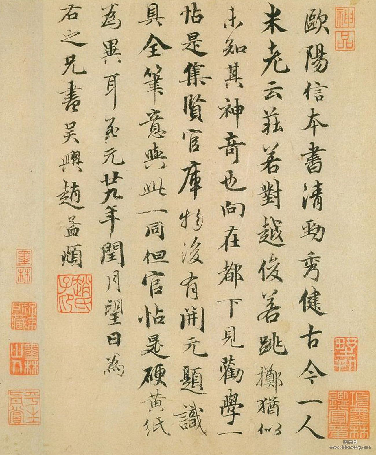 書法欣賞魏晉書法唐朝書法宋朝書法元朝書法明朝書法清朝書法近現代書法字典網>> 歷代書法>> 遼金元>> 趙孟頫·跋歐陽詢《仲尼夢奠帖》正文 趙孟頫·跋歐陽詢《仲尼夢奠帖》作者:趙孟頫 書體:行書 趙孟頫跋歐陽詢《仲尼夢奠帖》,現藏於遼寧省博物館。趙孟頫的相關書法作品:趙孟頫楷書《玄妙觀重修三門記》 趙孟頫行書《文賦》 趙孟頫行書《光福寺重建塔記》 趙孟頫小楷《高上大洞玉經》 趙孟頫行書《昔尋李願詩卷》 趙孟頫行書《半畝田帖》 趙孟頫行草《寄題杜尊師白雲庵瓊秀亭》二首 因為愛情,趙孟頫寫下這篇《洛神賦》 趙孟頫·跋蘇軾《治平帖》 相關文章:王洽·手札 (草書)東晉王洽《手札》,草書。王洽(323-358),琅琊臨沂(今山東臨沂)人,東晉書...鄧散木《五體書正氣歌》 (五體)鄧散木《五體書正氣歌》 上海書畫出版社 出版趙世駿楷書臨《褚遂良雁塔聖教序》 (楷書)趙世駿楷書欣賞臨《褚遂良雁塔聖教序》趙氏所處時代,是書風丕變的急轉期。康有為持論...趙孟頫楷書《壽春堂記》 (楷書)趙孟頫楷書欣賞《壽春堂記》拓本 ,遼寧省博物館藏。《壽春堂記》書於元仁宗延祐三年...黃道周行書《贈眉仲戴蓬萊即事詩軸》 (行書)黃道周《贈眉仲戴蓬萊即事詩軸》絹本行書 192.5×49.5cm 崇禎十七年(...陳洪綬《行書大夫生辰逢大雨七絕詩》 (行書)陳洪綬《行書大夫生辰逢大雨七絕詩》扇面 泥金紙 16.7×51.7cm 約順治...吳寬行書《跋黃庭堅諸上座帖》 (行書)吳寬《跋黃庭堅“諸上座帖”》紙本行書 縱33cm 北京故宮博物院藏 ...祝允明《草書懷知詩卷》 (草書)祝允明《草書懷知詩卷》 紙本草書 上海博物館藏釋文: 懷知識詩 臥病泊然,緬懷平...莊麟·題《翠雨軒圖》 (章草)【釋文】持敬以翠雨名其軒,諸名公為詩文題卷。余因隨牒京師,與持敬會於朝天宮,出此...吳昌碩行書《風波塵土五言聯》 (行書)吳昌碩 行書五言聯 紙本 130X32cmX2 西泠印社藏 釋文:風波即大道 塵...