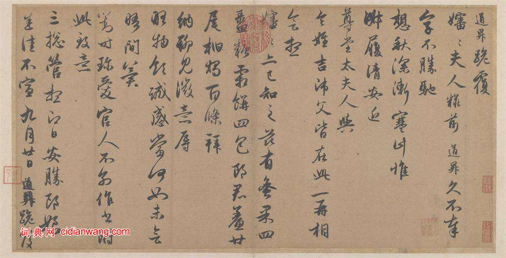 道昇跪復嬸嬸夫人妝前,道昇久不奉字,不勝馳想,秋深漸寒,計惟淑履請安。近尊堂太夫人與令侄吉師父,皆在此一再相會,想嬸嬸亦已知之,茲有蜜果四盝,糖霜餅四包,郎君鯗廿尾,?燭百條拜納,聊見微意,辱略物領,誠感當何如。未會晤間,冀對時珍愛,官人不別作書,附此致意,三總管想即日安勝,郎娘悉佳。不宣,九月廿日,道昇跪復。