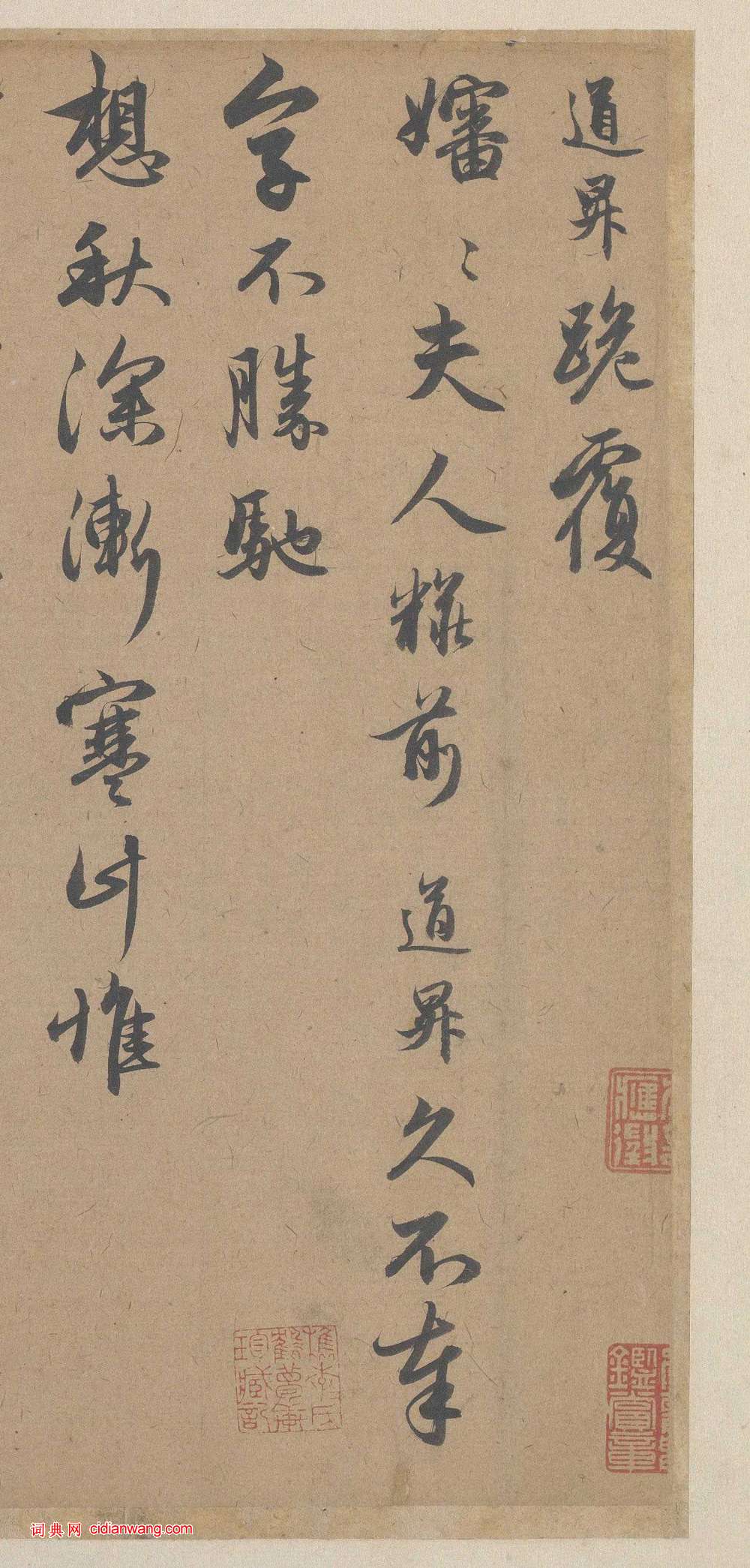 書法欣賞魏晉書法唐朝書法宋朝書法元朝書法明朝書法清朝書法近現代書法字典網>> 歷代書法>> 遼金元>> 趙孟頫《秋深帖》(2)正文 趙孟頫《秋深帖》(2)作者:趙孟頫 書體:行書 趙孟頫《秋深帖》高清大圖欣賞:首 頁 上一頁 1 2 3 下一頁 尾 頁 全文2015-1-15 9:16:46 趙孟頫的相關書法作品:趙孟頫《前赤壁賦》 趙孟頫《行草陶淵明五言詩頁》 趙孟頫臨《定武蘭亭序》 趙孟頫行草《致中峰和尚札》冊 趙孟頫小楷《吳叡篆〈張渥九歌圖卷〉》 趙孟頫·跋歐陽詢《仲尼夢奠帖》 趙孟頫小楷《跋陳琳浮鳧圖》 趙孟頫楷書《膽巴碑》 趙孟頫行書《書蘇軾西湖詩》 相關文章:林散之行草《其大我志八言聯》 (行草)林散之《其大我志八言聯》紙本行草書 91.2×16.3cm×2 1961年 ...查士標《行書西泠橋七絕詩軸》 (行書)查士標《行書西泠橋七絕詩軸》綾本行書 181×50cm 南京市文物商店藏釋文:...李應禎《行書述子病狀札》 (行書)李應禎《行書述子病狀札》 湖北省博物館藏釋文:賤子大小便去不調適,不快活,頭亦微...吳雯《行書過河上道院五言詩軸》 (行書)吳雯《行書過河上道院五言詩軸》紙本行書 149.2×46.6cm 湖南省博物館...祁寯藻草書《臨十七帖軸》 (草書)祁寯藻《草書臨十七帖軸》紙本行書 102×37cm 山東省博物館藏釋文:諸從並...王羲之行書《孔侍中帖》 (行書)王羲之《孔侍中帖》摹本, 紙本。縱26.9厘米。6行,42字。行書。釋文:九月十...何焯《七言詩軸》 (行書)何焯七言詩軸,行書。釋文:不知天隱在何鄉,且欲煙霞跡暫雙。鶴廟未能齊月馭, 鹿門...李宗諤·送士龍詩 (楷書)李宗諤《送士龍詩》,楷書,台北故宮博物院藏。宗諤工隸書,為西崑體詩人之一。著有文...呂公弼行書《子安帖》 (行書)呂公弼 尺牘《子安帖》 紙本 26.7×40.8cm 台北故宮博物院藏釋文:子...長沙窯詩文壺《古今車馬不謝》 (行書)行書——青釉褐彩“古今車馬不謝”題記壺 高17.8厘米 口徑9.4厘米 底徑9...