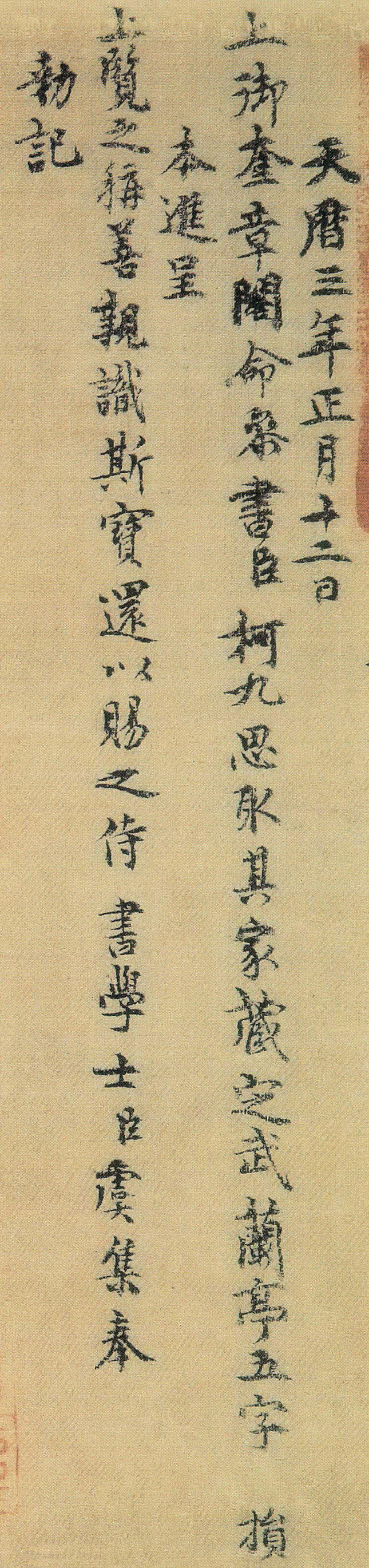 書法欣賞魏晉書法唐朝書法宋朝書法元朝書法明朝書法清朝書法近現代書法字典網>> 歷代書法>> 遼金元>> 虞集·跋定武蘭亭正文 虞集·跋定武蘭亭作者:虞集 書體:行書 【釋文】天曆三年正月十二日 上御奎章閣命參書臣柯九思取其家藏定武蘭亭五字 損 本進呈 上覽之稱善親識斯寶還以賜之侍書學士臣虞集奉 勅記虞集的相關書法作品:虞集行書《致丹丘博士公尺牘》 虞集·跋趙孟頫《鵲華秋色圖》 虞集·跋定武蘭亭 虞集·跋何澄歸莊圖卷 虞集·白雲法師帖 相關文章:張穀行楷《七言絕句三首》 (行楷)張穀《七言絕句三首》 紙本行楷書 23.1×27.4cm 台北故宮博物院藏釋文...為什麼你寫的字不耐看?有人的字,好看但不耐看。其實,字如女人,我們在欣賞一件作品的時候,就像在觀賞一個...吳大澂行書手札 (行書)吳大澂畫像吳大澂|初名大淳,為避清穆宗諱改名,字止敬,又字清卿,號恆軒,又別號白...吳大澂篆書《臨段敦(簋)》 (篆書)吳大澂《臨段敦(簋)》釋文:唯王十又四祀,十又一月丁卯,王真畢,烝。戊辰,曾(贈...褚遂良《伊闕佛龕碑》宋拓全本 (楷書)《伊闕佛龕碑》亦稱“三龕記”“龍門三龕碑”“伊闕佛龕之碑”,唐貞觀十五年十一月(...魏之璜《行書春陰雜興二十首詩卷》 (行書)魏之璜《行書春陰雜興二十首詩卷》 紙本行書 46.4×1220厘米 北京故宮博...仇遠行書《莫景行詩引》 (行書)仇遠《莫景行詩引》紙本 35.6×84.3cm 北京故宮博物院藏 ...鄭簠《隸書五言詩》 (隸書)鄭簠《隸書五言詩》,香港藝術館虛白齋藏。釋文:仙宮雲箔卷,露出玉簾鉤。清光無所贈...趙孟頫行書 《煙江疊嶂圖》 (行書)《煙江疊嶂圖》是宋代大畫家王冼的作品,蘇東坡在欣賞王冼的這件作品之後寫下了《書王...趙孟頫《趵突泉詩》 (行書)趙孟頫《趵突泉詩》,紙本,行書,縱33.1cm,橫83.3cm。台北故宮博物院藏...