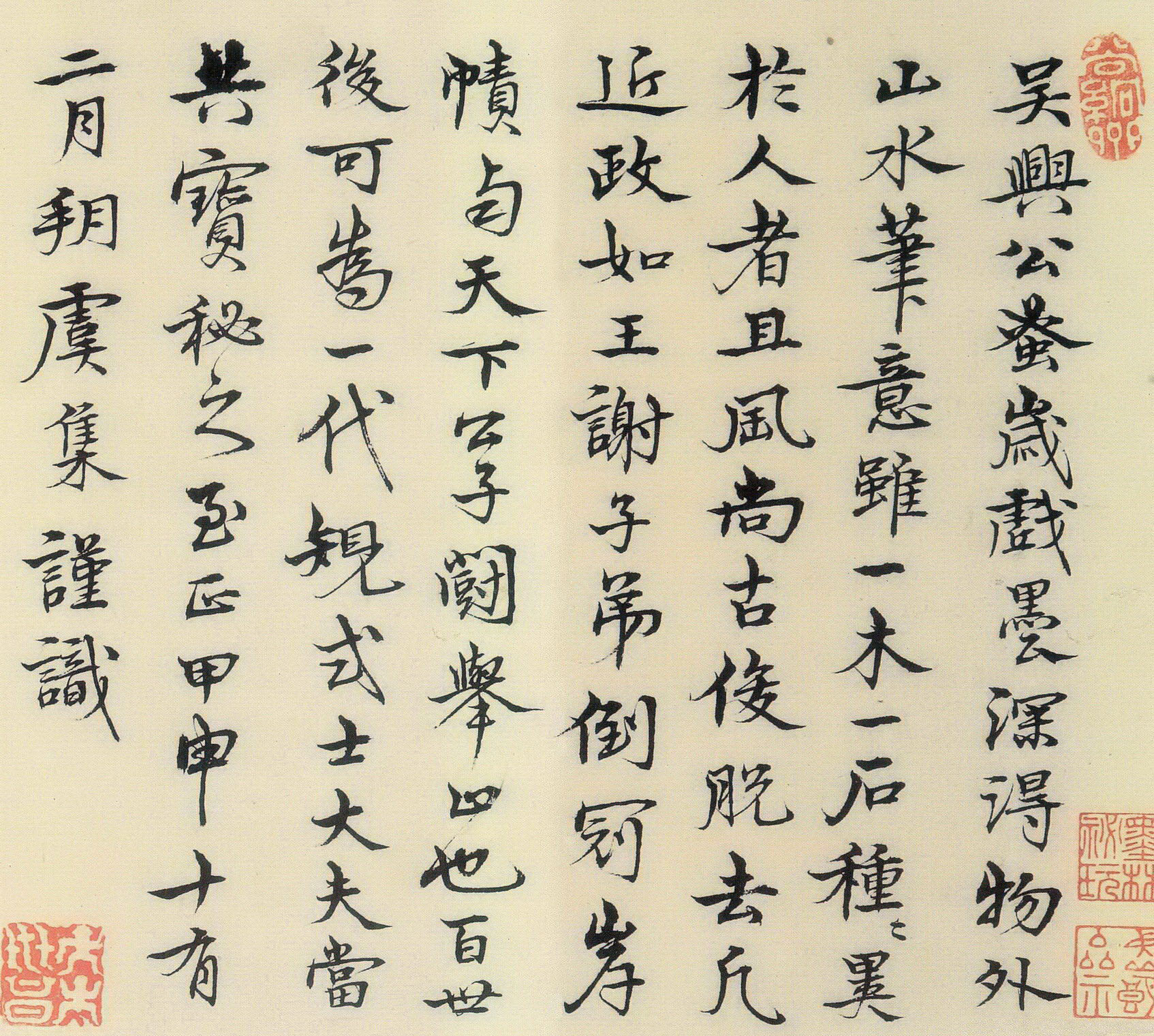 書法欣賞魏晉書法唐朝書法宋朝書法元朝書法明朝書法清朝書法近現代書法字典網>> 歷代書法>> 遼金元>> 虞集·跋趙孟頫《鵲華秋色圖》正文 虞集·跋趙孟頫《鵲華秋色圖》作者:虞集 書體:行書 虞集跋趙孟頫《鵲華秋色圖》,紙本行書 縱:28.4cm,現藏台北故宮博物院。釋文:吳興公蚤歲戲墨,深得物外山水筆意。雖一木一石,種種異於人者。且風尚古俊,脫去凡跡。政如王謝子弟,倒冠岸幘,與天下公子斗舉止也。百世後可為一代規式,士大夫當共寶秘之。至正甲申十有二月朔,虞集謹識。 2015-5-4 12:34:36 虞集的相關書法作品:虞集·跋趙孟頫《鵲華秋色圖》 虞集·白雲法師帖 虞集隸書《跋趙孟頫書陶詩》 虞集《題胡虔汲水蕃部圖畫詩》 虞集·跋定武蘭亭 虞集隸書《跋任仁發飲中八仙圖》 虞集行書《致丹丘博士公尺牘》 虞集·跋何澄歸莊圖卷 相關文章:乾隆御筆《斗鹿賦》 (行書)乾隆在《斗鹿賦》中體現出三個重要的文學價值:一是體現出乾隆聖心天眷的仁義之心;二...老印套怎么做,印套的做法今天給大家介紹一下印套的做法:工具:乳膠;剪子;尺子;牛角或骨簽(用於整形壓邊磨...田英章楷書《顏氏家訓》 (楷書)《顏氏家訓》是漢民族歷史上第一部內容豐富,體系宏大的家訓,也是一部學術著作。作者...趙孟頫行書《天冠山題詠詩帖》 (行書)趙孟頫書法《天冠山題詠詩帖》(清人錢泳刻本)天冠山在江西省貴溪市城南1公里處,有...趙孟頫《行草陶淵明五言詩頁》 (行草)趙孟頫《行草陶淵明五言詩頁》 縱32.7厘米 橫45.8厘米 北京故宮博物院藏書...龔鼎孳《行書七絕詩軸》 (行書)龔鼎孳《行書七絕詩軸》綾本行書 272×47cm 安徽省博物館藏 釋文:棗花香...文徵明《行書七律詩軸》 (行書)文徵明《行書七律詩軸》 紙本 122×59.6cm 上海博物館藏此件為《憶昔四...胡公壽《行書月影雲起七言聯》 (行書)胡公壽《行書月影雲起七言聯》紙本行書 102×19.5cm×2 上海博物館藏...蔡襄《京居帖》 (行草)【釋文】襄啟:去德於今,蓋已*(氵存)歲。京居鮮暇,無因致書,第增馳系。州校遠來...故宮牌匾,猜猜出自誰的手筆?書法家:故宮大殿上的匾額書法,集中反映了封建帝制的最高治國理想和策略。這些書法,...