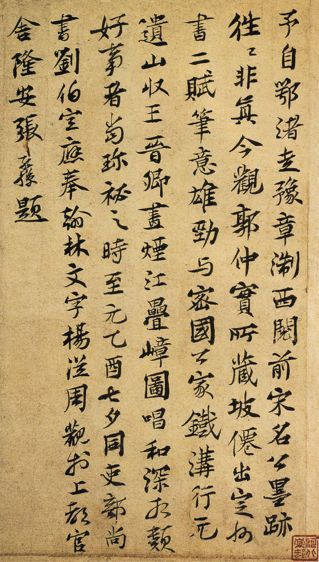 書法欣賞魏晉書法唐朝書法宋朝書法元朝書法明朝書法清朝書法近現代書法字典網>> 歷代書法>> 遼金元>> 張孔孫·跋蘇軾洞庭春色中山松醪二賦正文 張孔孫·跋蘇軾洞庭春色中山松醪二賦作者:張孔孫 書體:行楷 張孔孫《跋蘇軾洞庭春色中山松醪二賦》,行楷,紙本,縱28厘米,橫25厘米,吉林省博物館藏。此件題跋,具有重要的史料價值,不僅對鑑定蘇軾《二賦》的真偽及流傳經過有重要作用,同時也對研究金代書畫收藏史有一定的幫助。題跋字數不多,行楷字跡安排妥帖,筆畫錯落有致,純熟流暢。相關文章:東漢《王平君闕銘》 (隸書)東漢 王平君闕銘 闕高220cm 寬57cm 四川成都市出土馬士達談篆刻馬士達(1943--2012)書法篆刻家。別署驥者、老馬、玄廬。祖籍漣水,195...唐寅行書《落花詩冊》蘇州市博物館藏本 (行書)唐寅《落花詩冊》蘇州市博物館藏本 行書 紙本冊頁,三十四開,每開尺寸27cm x...菅氏夫人墓碑 (隸書)西晉《菅氏夫人墓碑》(碑陽) 西安碑林博物館藏 《菅氏夫人墓碑》碑陰 《菅氏夫人...蘇軾小楷《金剛經》 (小楷)《金剛經》是佛教的重要經典,根據不同譯本,全名略有不同。《金剛經》,全稱為《金剛...董其昌·題黃公望《富春山居圖》 (行書)董其昌題黃公望《富春山居圖》,行書。富春山居圖:張方平《名茶帖》 (行書)【釋文】賢郎在侍下 留錢塘也 今有慰疏 告為附達 寵惠名茶 不任愧感愧感 中間示...張惠言《篆書八言聯》 (篆書)張惠言《篆書八言聯》 常州博物館藏 1991年上海陳松茂先生捐張惠言(1761年...趙之謙論鈐印之法趙之謙(1829年-1884年),中國清代著名的書畫家、篆刻家。漢族,浙江紹興人...丁敬《行書七律詩軸》 (行書)丁敬《行書七律詩軸》 紙本 127×30cm 西泠印社藏 資料來自《西泠印社百...