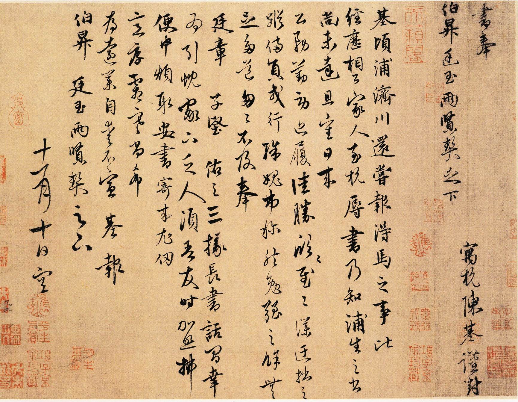 書法欣賞魏晉書法唐朝書法宋朝書法元朝書法明朝書法清朝書法近現代書法字典網>> 歷代書法>> 遼金元>> 陳基《致伯升廷玉尺牘》正文 陳基《致伯升廷玉尺牘》作者:陳基 書體:行草 陳基《致伯升廷玉尺牘》,元代,行草,紙本。陳基元末明初詩人,書法家。生於1314年(宗延祐元年),卒於1370年(明太祖洪武三年),字敬初,臨海(元末蘇州)人。據史料記載:“嘗為人草諫章,幾獲罪,引避歸。南州用兵,起參張士誠太尉府軍事。士誠稱王,為他諫止。官至學士院學士。軍旅倥傯,飛書走檄,多出其手。吳平,明太祖召入預修元史;賜金而還。基嘗受業於黃溍,詩文皆操縱馳騁,而自有雍容揖讓之度。著有《夷白齋稿》三十五卷,外集一卷,《四庫總目》行於世。”陳基的相關書法作品:陳基《賢郎帖》 陳基行草《苦雨帖》 陳基行草《寢喜帖》 陳基行書《致伯升廷玉札》 陳基行書《相見帖》 陳基《致伯升廷玉尺牘》 陳基·贈雪坡詩札 陳基《懷存齋詩帖》 相關文章:徐枋行書《錄常建五言詩軸》 (行書)徐枋《錄常建五言詩軸》紙本行書 136.6×62.6cm 上海博物館藏 釋文:...奚岡《草書軸》 (草書)奚岡《草書軸》紙本草書 167.2×44.8cm 湖北省博物館藏 釋文:五湖春...曹鴻勛楷書《重修玉清宮碑銘》 (楷書)曹鴻勛長於書法,專攻歐陽詢《九成宮醴泉銘》,兼工漢隸,偶作墨竹亦善。原立於濰縣城...趙孟頫·前赤壁賦 (行書)趙孟頫書蘇軾《前後赤壁賦》,並作東坡像於卷首。台北故宮博物院藏。《前後赤壁賦》紙...楊法《隸書五言詩軸》 (隸書)楊法《隸書五言詩軸》 來源不詳邢慈靜《行書五言詩》 (行書)邢慈靜生卒年代不詳。臨邑(今屬山東)人。邢侗之妹。號蒲團主人、蘭雪齋主。貴州左布...齊白石閒章精選 (篆書)齊白石篆刻初學浙派的丁敬、黃易,後學趙之謙、吳昌碩。從漢《祀三公山碑》得到啟發,...金農《隸書陳野水事軸》 (隸書)金農《隸書陳野水事軸》紙本隸書 124.1×42.9cm 上海博物館藏釋文:陳...顏真卿楷書《顏氏家廟碑》 (楷書)碑陽篆額及碑陰楷額 顏真卿《顏氏家廟碑》建於建中元年(780年)。楷書,碑文一通...楊絳小楷《槐聚詩存》 (小楷)2013年,楊絳先生出版了250萬字的文集八卷,這不僅是文學的奇觀,也是生命的奇...