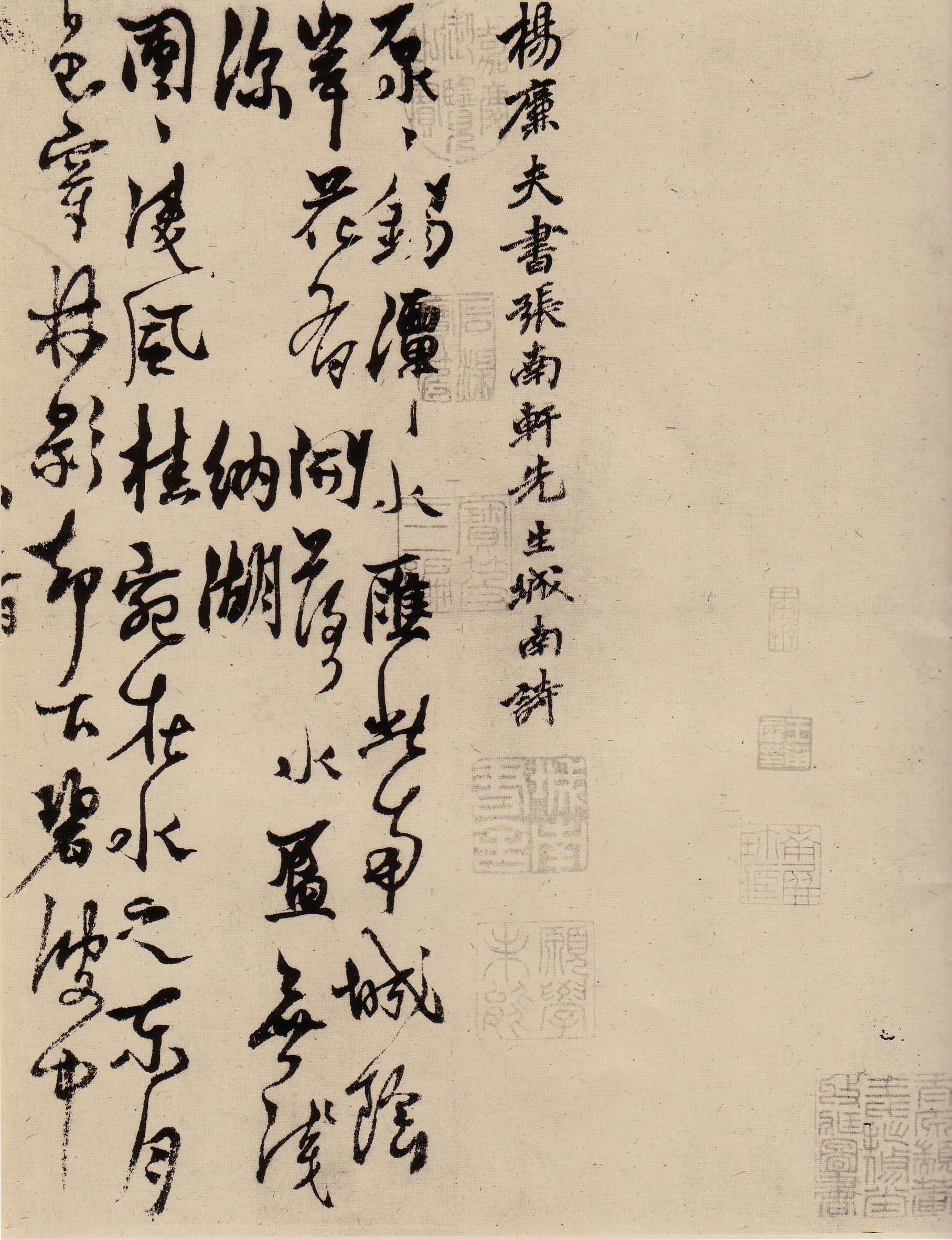 【釋文】原原錫潭水,匯此南城陰。岸花有開落,水盈無淺深。納湖 團團凌風桂,宛在水之東。月色穿林影,卻下碧波中。東渚 四序有佳趣,今古蓋共茲。橋邊獨微吟,回首忘所之。詠歸橋 窗低蘆葦秋,便有江湘思。久矣倦垂綸,游魚不須避。船齋 長喔伐木篇,竚立以望子。日暮飛鳥歸,門前長春水。麗澤藝蘭北磵側,磵曲風紆餘。願言植根固,芳芬長慰予。蘭澗 迭石小崢嶸,修篁高下生。地偏人跡罕,古井轆轤鳴。山齋 高樓出林杪,中有千載書。昔人不可見,倚檻竟何如。書樓 開軒僅尋丈,水竹亦蕭踈。客來須起敬,題榜了翁書。蒙軒 流泉自清寫,觸石短長鳴。窮年竹根底,和我讀書聲。石瀨 雲生山氣佳,雲卷山色靜。隱几亦何心,此意相與永。捲雲亭 前年種垂柳,已復如許長。長條莫攀折,留待映滄浪。柳堤 危欄明倒景,面面涌金波。何處無佳月,惟應此地多。月榭 夫容豈不好,濯濯清漣漪。采之不盈把,惆悵暮忘飢。濯清亭 繫舟西岸邊,幅巾自來去。島嶼花木深,蟬鳴不知處。西嶼 幽谷竹成陰,懸流著石清。不妨風月夕,來此聽琮琤。琮琤谷 亭亭堤上梅,歷歷波間影。歲晚憶夫君,寂寞煙渚靜。梅堤 風吹渡頭雨,摵摵篷上聲。忻然會心處,端復與誰評。聽雨舫 散策下亭阿,水清魚可數。卻上采菱舟,乘風過南浦。采菱舟 湘水接洞庭,秋山見遙碧。南阜時一登,搔首意無斁。南阜右張宣公城南雜詠二十首,子朱子嘗所屬和者也。南沙虞子賢氏,受朱子詩翰於其眷棣錢廣,而宣公真跡逸矣。余來婁,賢介其友王師道,持捲來征余言。適於宣公集中得其元唱,賢且躬至余邸次,請余追和,未及,先為補書宣公詩。時至正壬寅冬十二月,東維叟楊楨謹再拜書。余既寫詩已,賢復索余評兩前哲詩。朱子之辭不敢評,不意張荊州為乾道道學君子,而矢口小章,亦有古風人思致。如“岸花有開落,水流無淺深”,“日暮飛鳥歸,門前長春水”,又如“古井轆轤鳴”,雖開元詩人不能到。至捲雲一章,惟許晉處士作之,詞人不敢企也。楨贅評。