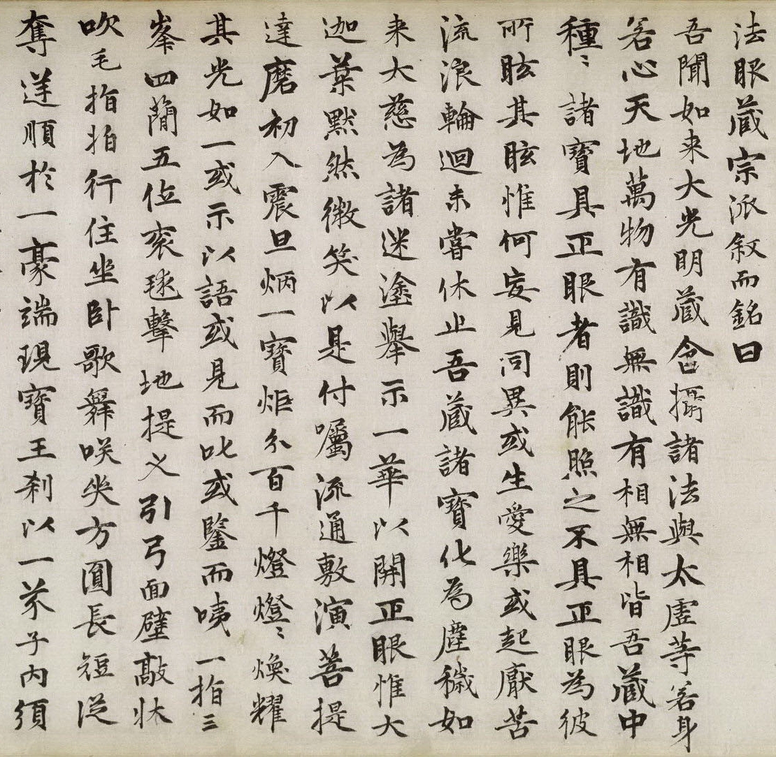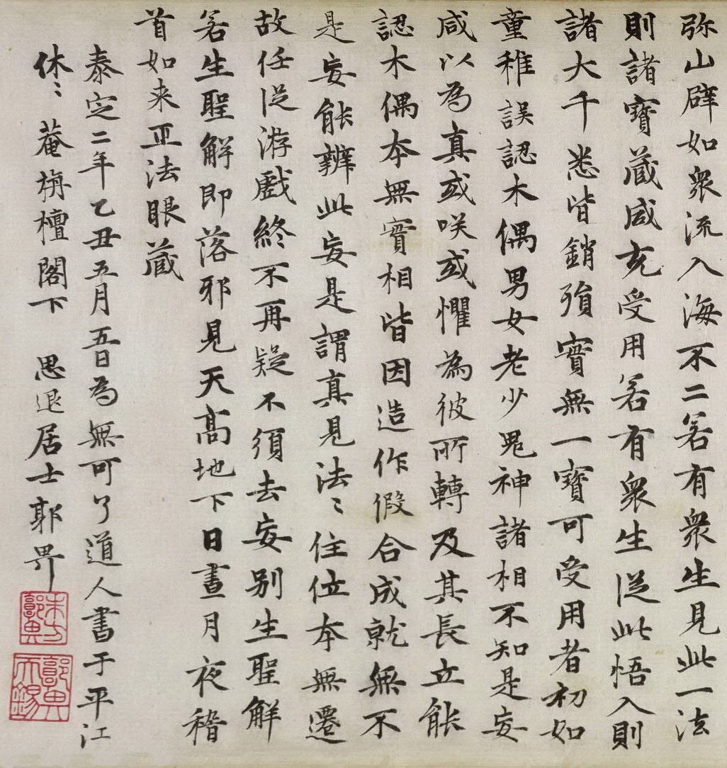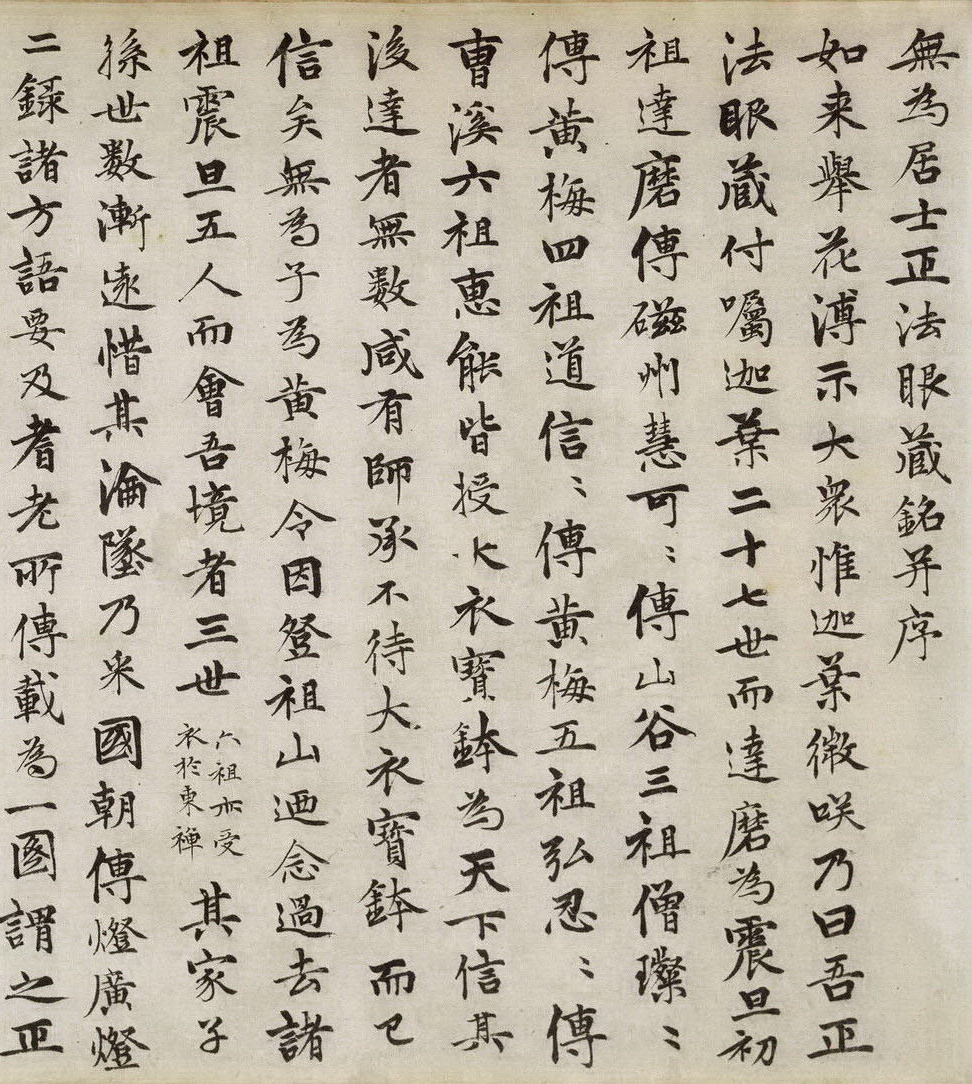 書法欣賞魏晉書法唐朝書法宋朝書法元朝書法明朝書法清朝書法近現代書法字典網>> 歷代書法>> 遼金元>> 郭畀·跋趙光輔番王禮佛圖正文 郭畀·跋趙光輔番王禮佛圖作者:郭畀 書體:楷書 郭畀《跋趙光輔番王禮佛圖》,楷書,泰定二年(1325)書。克里夫蘭藝術博物館藏。郭畀的相關書法作品:郭畀·青玉荷盤詩 郭畀《陸游自書詩卷跋》 郭畀·跋趙光輔番王禮佛圖 相關文章:米芾行書《張季明帖》 (行書)米芾行書《張季明帖》約元祐元年(1086年)紙本 縱26.0厘米 橫34.5厘米...吳鎮《草書心經卷》 (草書)吳鎮《草書心經卷》紙本 29.3×203厘米 1340年 北京故宮博物院藏 可...蔣璨·跋懷素《自敘帖》 (行書)【釋文】辯老方艱難時流離轉徙江湖間猶能致意於此可見志尚又獲觀伯考少師品題並以嘉嘆...奚岡《隸書傅玄席銘橫幅》 (隸書)奚岡《隸書傅玄席銘橫幅》紙本隸書 114×150cm 安徽省博物館藏款署:鶴渚...吳昌碩《篆書臨散氏盤銘軸》 (篆書)吳昌碩《篆書臨散氏盤銘軸》紙本篆書 149.8×25.5cm 1922年 浙江...趙之謙《篆書萬物七情七言聯》 (篆書)趙之謙《篆書萬物七情七言聯》紙本篆書 台北故宮博物院藏 釋文:萬物不平有風俗。七...李流芳行書《戲贈上方老僧似公實兄七言詩扇》 (行書)李流芳《行書"戲贈上方老僧似公實兄"七言詩扇》 上海博物館藏 釋文:楞伽山下薇村...田蘊章楷書字帖300字 (楷書)《田蘊章楷書300字》里大多數的字在之前的每日一題每日一字里都有講到,而且都帶有...曹寶麟行書《米襄陽研山銘歸漢歌並序》 (行書)曹寶麟《米襄陽研山銘歸漢歌並序》此為晏廬曹寶麟先生作《米襄陽研山銘歸漢歌並序》。...白珽·墨竹詩冊 (行書)【釋文】墨竹無師承。所師在真竹。牆頭風露枝。日夜看爛熟。李侯心獨苦。一筆不啻足。...