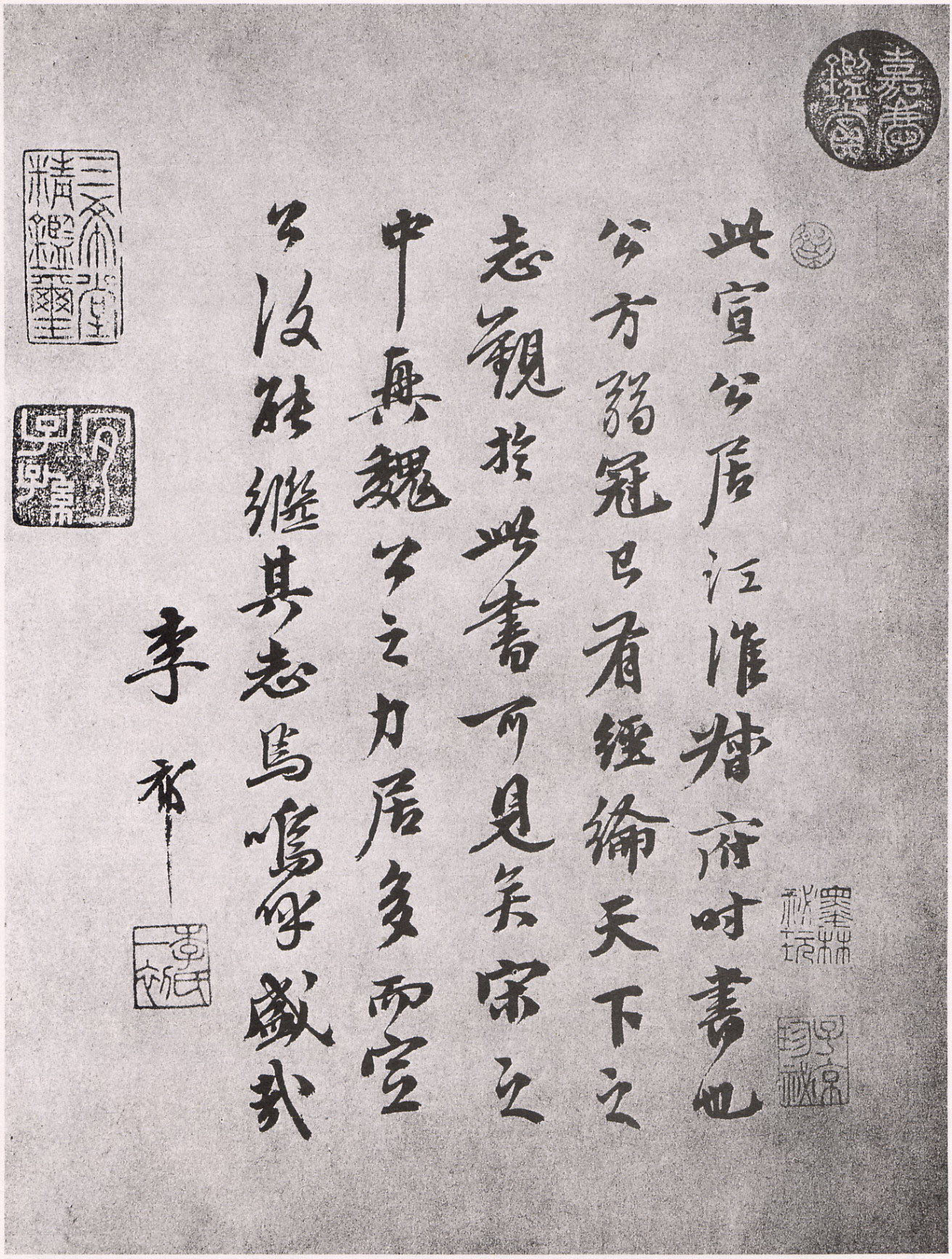 書法欣賞魏晉書法唐朝書法宋朝書法元朝書法明朝書法清朝書法近現代書法字典網>> 歷代書法>> 遼金元>> 李祁·書札正文 李祁·書札作者:李祁 書體:行書 【釋文】此宣公居江淮督府書也。公方弱冠。已有經綸天下之志。觀於此書可見矣。宋之中興。魏公之力居多。而宣公復能繼其志焉。嗚乎盛哉。李祁。元 李祁《書札》,行書。相關文章:傅山行草《丹楓閣記》臨本 (行草)傅山《丹楓閣記》,此帖共有兩種,真跡本共八板。前七板每板七行,最後一板八行。藏山...張瑞圖行草《書王建宮詞等四首條屏》 (行草)張瑞圖《書王建宮詞等四首條屏》 綾本行草書 261×94.5cm×4條 日本...王寵草書《李白詩卷》 (草書)王寵《李白詩卷》,金粟藏經紙本,草書,縱28.8厘米,橫771厘米,卷末有裘日修...北魏《馬鳴寺根法師碑》 (楷書)《馬鳴寺根法師碑》,亦稱《馬鳴寺碑》,北魏正光四年立於今山東省東安縣大王橋。碑文...范成大草書《雪後帖》 (草書)范成大《雪後帖》紙本 31.9×51.3cm 台北故宮博物院藏 范成大《雪後帖...趙孟頫行書《宗陽宮帖》 (行書)趙孟頫行書《宗陽宮帖》 紙本,縱27.5厘米,橫28.7厘米。 北京故宮博物院藏...張雨行書《致方鳳札》 (行書)天曆元年(1328) 張雨《致方鳳札》紙本 24.5×22.5cm 美國程可庵...王鴻緒·跋柳公權《蘭亭詩》 (行書)王鴻緒跋柳公權《蘭亭詩》,行書。北京故宮博物院藏。別有味道的樓蘭殘紙殘紙與孔侍中帖比較樓蘭出土西晉十六國簡紙書跡研究文/王曉光一、曹魏末期至西晉前期...高士奇《行書皇甫冉詩軸》 (行書)高士奇《行書皇甫冉詩軸》紙本行書 350×120cm 安徽省博物館藏 釋文:閒...