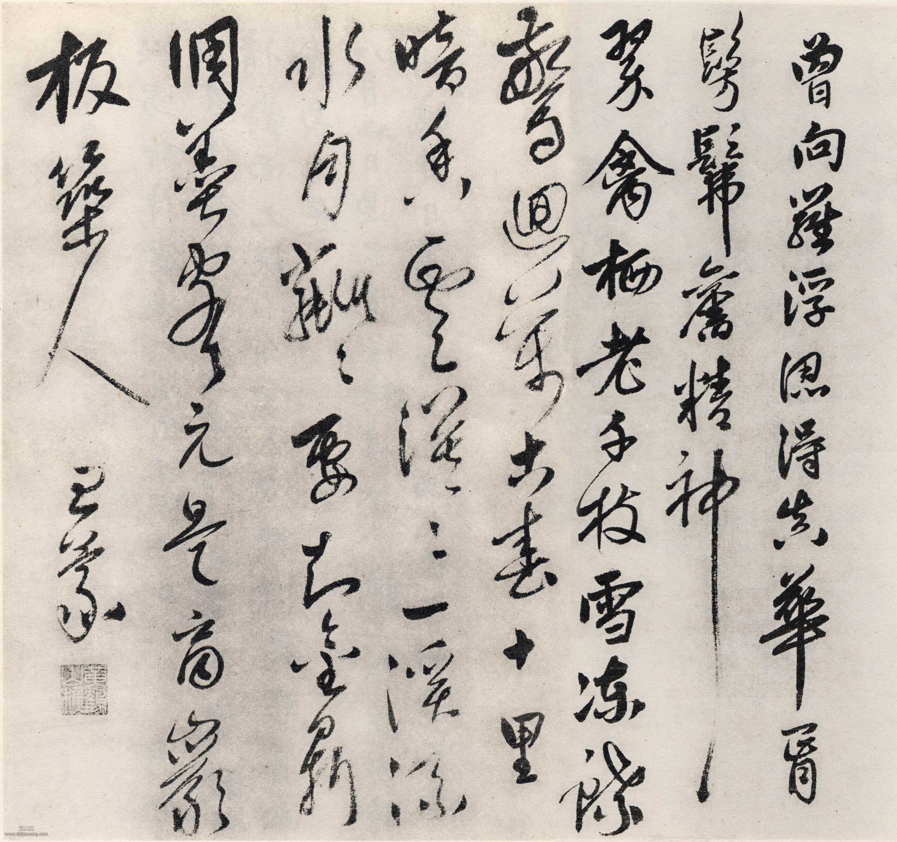 書法欣賞魏晉書法唐朝書法宋朝書法元朝書法明朝書法清朝書法近現代書法字典網>> 歷代書法>> 遼金元>> 王蒙《夢梅花詩卷》正文 王蒙《夢梅花詩卷》作者:王蒙 書體:行草 王蒙《夢梅花詩卷》,行草,北京故宮博物院藏。這是一件最能反映王蒙書法風格的作品。此為王蒙與楊維楨、張光弼、劉時可等名士聚會時的即興唱和之作。是卷散逸簡淡,絕去華采,所謂真率處見真精神,是一幅不可多得的佳作。風格完全脫離趙孟頫藩籬,已顯其廬山真面,惜不多見。釋文:曾向羅浮認得真,華胥仿佛舊精神。翠禽棲老千枝雪,凍蝶驚回萬古春。十里暗香雲漠漠,一溪流水月粼粼。要知金鼎調羹客,元是商岩版築人。王蒙的相關書法作品:王蒙《愛厚帖》 王蒙《夢梅花詩卷》 相關文章:王羲之草書《七月帖》 (草書)王羲之《七月帖》又名《秋月帖》,草書,台北故宮博物院藏作品,紙本。釋文:七月一日...劉炳森隸書字帖《岳陽樓記》 (隸書)劉炳森隸書字帖《岳陽樓記》欣賞,書法名家書名文系列之范仲淹岳陽樓記:王羲之草書《行穰帖》 (草書)王羲之《行穰帖》,原跡已失傳。此為初唐時期的雙鉤填墨摹本,硬黃紙本,傳為米芾再臨...趙孟頫《般若波羅蜜多心經》 (行書)趙孟頫所寫《般若波羅蜜多心經》非只一本,此冊是寫給中峰和尚的。中峰釋名明本,號中...林散之《隸書俾壽八言聯之一》 (隸書)林散之《隸書俾壽八言聯之一》132×31 三十年代 林生若藏釋文:俾壽而藏書傳...張旭《晚復帖》 (草書)張旭《晚復帖》,草書,見於宋《淳化閣帖》。徐渭《墓表賦七律詩》 (草書)【釋文】朝廷久罷孝廉科,只尺公車奈若何。墓道且須鐫石去,關門終見棄儒過。寸心落日...蔣之奇《北客帖》 (行書)【釋文】之奇頓首啟:改朔,伏惟台候萬福。北客少留,方此甚熱,又房室隘窄,良不易處...北魏《元萇墓誌》 (楷書)洛陽邙山地區為北魏皇室的墓葬地,曾先後出土過大批墓誌。這些墓誌的最大特點便是書體...李流芳行書《戲贈上方老僧似公實兄七言詩扇》 (行書)李流芳《行書"戲贈上方老僧似公實兄"七言詩扇》 上海博物館藏 釋文:楞伽山下薇村...