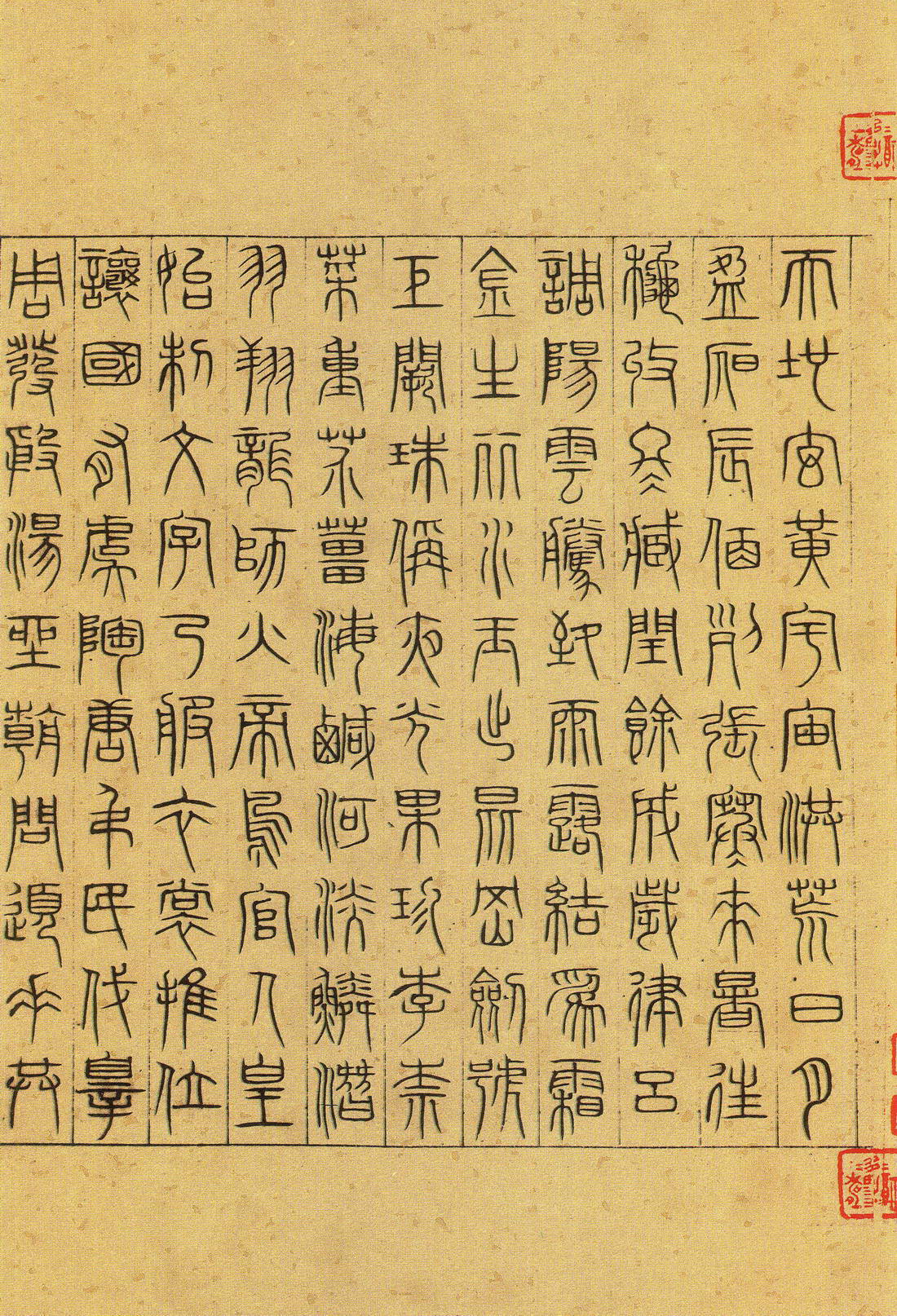 書法欣賞魏晉書法唐朝書法宋朝書法元朝書法明朝書法清朝書法近現代書法字典網>> 歷代書法>> 遼金元>> 吳叡篆書·千字文正文 吳叡篆書·千字文作者:吳叡 書體:篆書 此《千字文》書於元統二年(1334)。其時吳氏年僅47歲,可謂風華正茂。但見行筆結體老到穩健,布局精微,結構別致,法度嚴謹,字字不苟,是一件流傳有緒的佳作,但古樸不足。1 2 3 4 5 6 下一頁 尾 頁 全文2016-1-6 12:40:28 吳叡的相關書法作品:吳叡隸書《離騷》 吳叡篆書《千字文》 吳叡隸書《道德經》 吳叡篆書·千字文 相關文章:汪士鋐行書《杜甫“陪鄭廣文游何將軍山林”其九》 (行書)汪士鋐《杜甫“陪鄭廣文游何將軍山林”其九》紙本行書 170.7×44cm 南京...王獻之《中秋帖》 (草書)【釋文】中秋不復不得相還為即甚省如何然勝人何慶等大軍 《中秋帖》草書,紙本,北京...米芾草書《臈白帖》 (草書)米芾草書作品欣賞《臈白帖》 紙本,縱30.5厘米;橫23.7厘米。哲宗元佑七年(...曾熙楷書《臨張黑女墓誌軸》 (楷書)曾熙《臨張黑女墓誌軸》紙本楷書 176.5×82cm 1919年作 常州博物館...張即之楷書《度人經帖》 (楷書)張即之《楷書度人經帖》 紙本楷書 59頁 每頁30.7×14.lcm 北京故宮...漢隸《大吉買山地記》摩崖刻石 (隸書)《大吉買山地記》 釋文:昆弟六人,共買山地。建初元年,造此冢地,...王世鏜章草《草訣歌》 (草書)王世鏜,近代著名書法家,字魯生,自號積鐵子,晚號積鐵老人。祖籍河北天津。生於清同...王羲之草書《長風帖》臨摹本 (草書)王羲之《長風帖》(臨摹本)紙本草書 27.5×40.9cm 台北故宮博物院藏長...釋擔當·草書大痴畫訣手卷 (草書)【釋文】山水之法,在乎隨機應變。先記皴法,不雜布置,遠近相映,大概與寫字一般,以...徐悲鴻給齊白石的拜節信 (行書)下面這封信,是上世紀50年代初端午節的前一天,徐悲鴻附帶著拜節的禮品差人送給齊白...