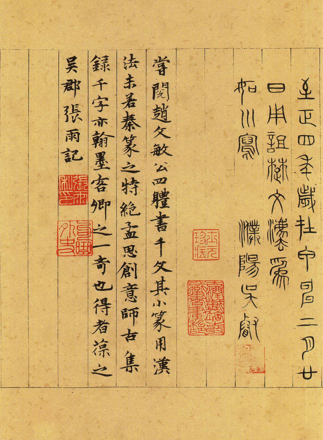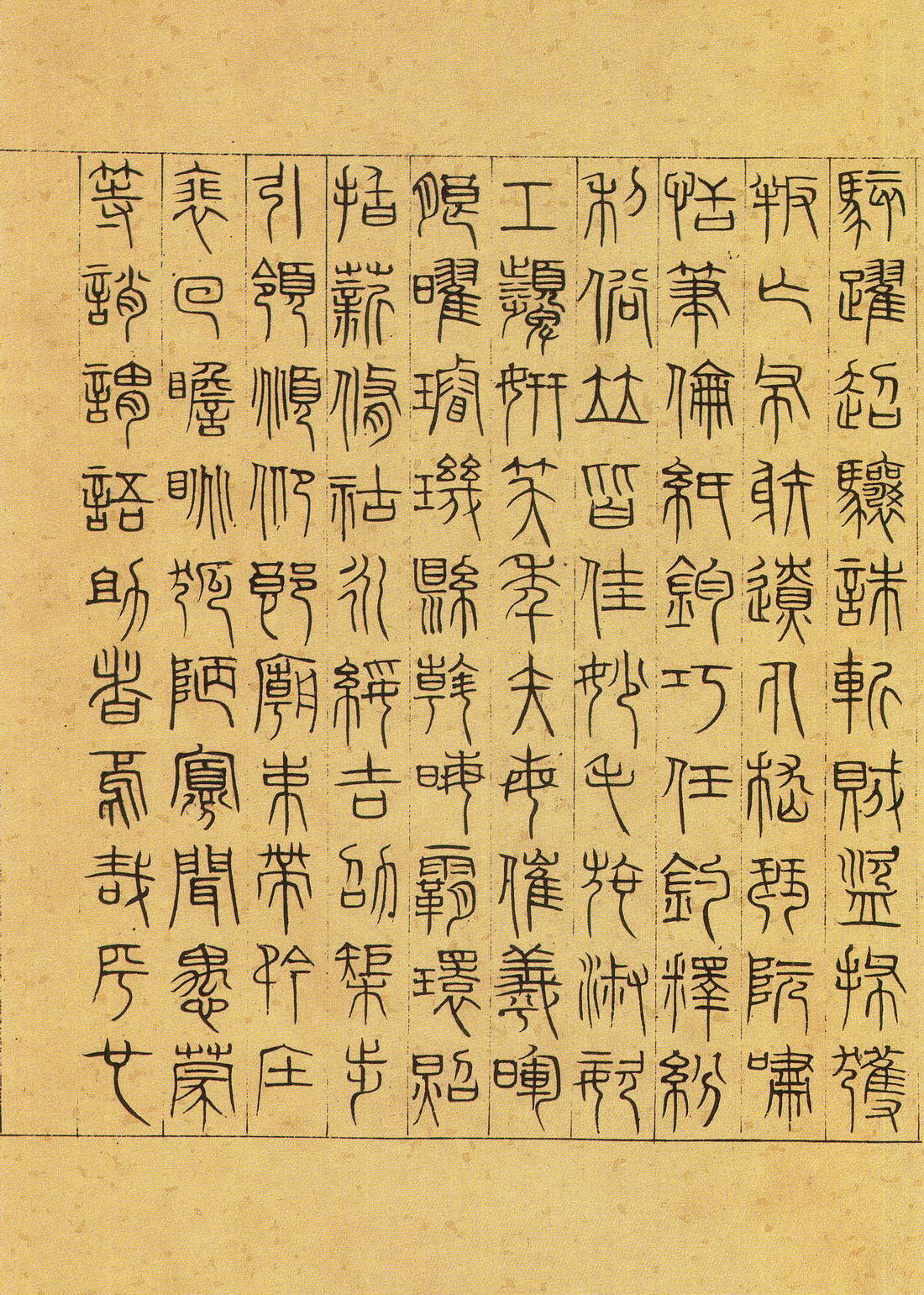 書法欣賞魏晉書法唐朝書法宋朝書法元朝書法明朝書法清朝書法近現代書法字典網>> 歷代書法>> 遼金元>> 吳叡篆書·千字文(6)正文 吳叡篆書·千字文(6)作者:吳叡 書體:篆書 首 頁 上一頁 1 2 3 4 5 6 全文2016-1-6 12:40:28 吳叡的相關書法作品:吳叡隸書《離騷》 吳叡篆書·千字文 吳叡篆書《千字文》 吳叡隸書《道德經》 相關文章:李鱓·七言題畫詩 (行書)李鱓《七言題畫詩》,行書。李應禎《行書致儲巏札》之一 (行書)李應禎《行書致儲巏札》之一 23.5×31.7cm 上海博物館藏釋文:少間奉請...張雨《獨游龍井方圓庵行書詩卷》 (行書)張雨《獨游龍井方圓庵行書詩卷》行書 30.5cm×77.5cm 至正二年(13...黃自元楷書《朱柏廬先生治家格言》 (楷書)黃自元(1837--1918),字敬輿,號澹叟,湖南安化縣龍塘鄉人,清末書法家,...王守仁《楷書客座私祝冊》 (楷書)王守仁《楷書客座私祝冊》楷書 44.0.5×36.5cm×20 嘉靖六年(1...歐陽詢《 千字文》 (行書)歐陽詢書《千字文》,見於著錄的共有三本:一為蔡襄題識過的《草書千字文》,一為南宋...王鐸論書法 王鐸的書法筆記 (行書)▶ 書法貴得古人結構。近觀學書者,動效時流。古難今易,古深奧奇變,今嫩弱俗雅,易...田英章楷書《顏氏家訓》 (楷書)《顏氏家訓》是漢民族歷史上第一部內容豐富,體系宏大的家訓,也是一部學術著作。作者...柳公權行書《辱問帖》 (行書)柳公權《辱問帖》 行書 【釋文】:辱問卻送及碑本兼虛獎逾涯但深反側因見趙張如虛獎...查昇《行書摘錄羅浮圖志軸 》 (行書)查昇《行書摘錄羅浮圖志軸 》綾本行書 141.8×42.5cm 湖南省博物館...