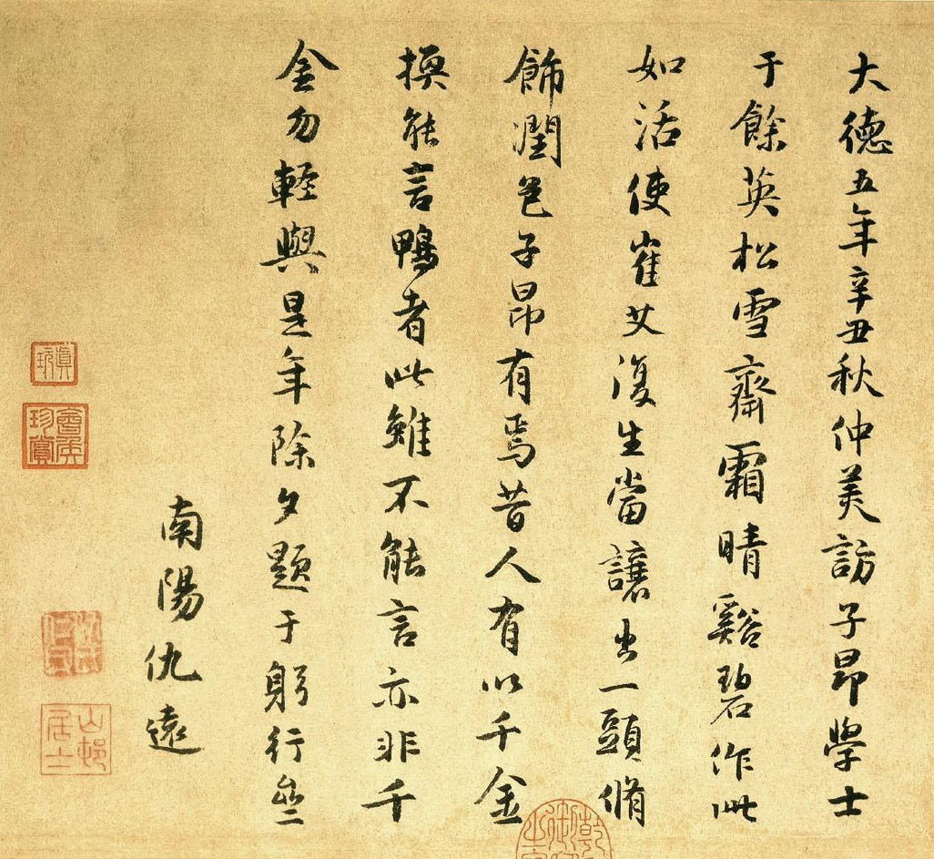 書法欣賞魏晉書法唐朝書法宋朝書法元朝書法明朝書法清朝書法近現代書法字典網>> 歷代書法>> 遼金元>> 仇遠·跋陳琳《溪鳧圖》正文 仇遠·跋陳琳《溪鳧圖》作者:仇遠 書體:行書 仇遠跋陳琳《溪鳧圖》,行書,台北故宮博物院藏。仇遠的相關書法作品:仇遠行書《自書詩》卷 仇遠行楷《和義山元旦詩》 仇遠·跋陳琳《溪鳧圖》 仇遠行書《莫景行詩引》 相關文章:周亮工行楷《自書五律四首詩軸》 (行楷)周亮工《行楷書自書五律四首詩軸》紙本行楷書 208×49cm 北京故宮博物院藏...楊妹子·七言詩一首 (楷書)楊妹子《七言詩一首》,楷書,美國普林斯頓大學附屬圖書館藏。王羲之小楷精品《樂毅論》 (小楷)《樂毅論》是三國時期魏夏侯玄(泰初)撰寫的一篇文章,文中論述的是戰國時代燕國名將...李建中·同年帖 (行書)【釋文】金部同年,載喜披風,甚慰私抱,殊為款曲。鏇值睽離,必然來晨朝車行邁,適蒙...趙孟頫小楷《跋陳琳浮鳧圖》 (小楷)趙孟頫 小楷《跋陳琳浮鳧圖》據《珊瑚網·名畫》載,大德五年夏八月,陳啉訪孟頫於...陳孚恩《行書老彭管樂七言聯》 (行書)陳孚恩《行書老彭管樂七言聯》紙本行書 124×29 cm×2 淮安市博物館藏...倪元璐《行草“共曉承明貴”五言律詩軸》 (行草)倪元璐《行草“共曉承明貴”五言律詩軸》 北京故宮博物院藏釋文:共曉承明貴,漢臣殊...蔡卞《雪意帖》 (行書)【釋文】卞拜覆 雪意殊濃 甿畝大洽 殊為可慶 蒙賜答誨 尤以感慰適行首司呈賀雪笏...吳昌碩《隸書村里家中五言聯》 (隸書)吳昌碩《隸書村里家中五言聯》紙本隸書 127.9×33.5cm×2 1924...張從申·茅山玄靜碑 (楷書)元拓張從申茅山玄靜碑《元拓張從申茅山玄靜碑》簡介:張從申茅山玄靜碑,全名《唐茅山...
