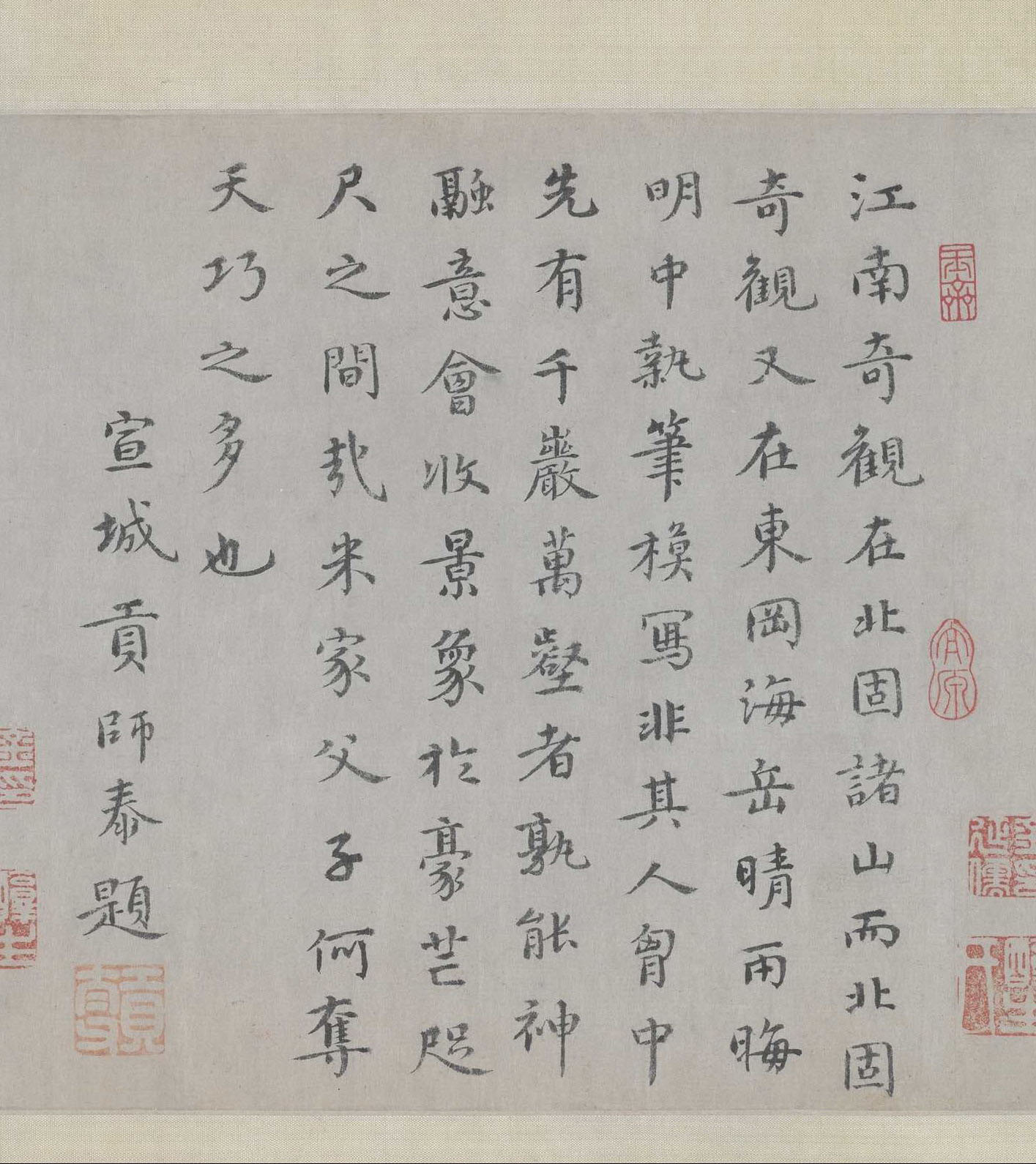 書法欣賞魏晉書法唐朝書法宋朝書法元朝書法明朝書法清朝書法近現代書法字典網>> 歷代書法>> 遼金元>> 貢師泰·跋米友仁《瀟湘奇觀圖》正文 貢師泰·跋米友仁《瀟湘奇觀圖》作者:貢師泰 書體:楷書 【釋文】江南奇觀在北固諸山,而北固奇觀又在東崗海岳,晴雨晦明中執筆模寫,非其中胸中先有千岩萬壑者,孰能神融意會收景象於豪芒咫尺之間哉,米家父子何奪天巧之多也。宣城貢師泰題。 貢師泰跋米友仁《瀟湘奇觀圖》,縱19.8cm,故宮博物館藏。相關文章:黃侃《篆書陽明手跡橫披》 (篆書)黃侃《篆書陽明手跡橫披》37×130cm 1930年作 湖北省博物館藏 釋文:...龔自珍行書《致吳六老爺書札》 (行書)致吳六老爺書札。 釋文:弟行有日矣,不復能商榷文字,而自客夏到今,所過眼之拓本已...程敏政·跋陸游《懷成都十韻詩卷》 (行書)程敏政跋陸游《懷成都十韻詩卷》,行草書,縱34.6cm。故宮博物院藏。9幅趙孟頫書畫題跋 (行楷)9幅趙孟頫書畫題跋欣賞:草書之美,任何欣賞草書草書,是為了書寫便捷而產生的一種書體。《說文解字》中說:“漢興有草書”。草書始於...顧安行書《寄良輔徵君詩二首》 (行書)顧安《寄良輔徵君詩二首》 紙本行書 28.2×29.1cm 台北故宮博物院藏。...黃庭堅行書《酺池寺詩》 (行書)黃庭堅行書《酺池寺詩》小黠大痴螳捕蟬。有餘不足夔憐蚿。退食歸來北窗夢。一江春月趁...董美人墓誌 (楷書)全稱《美人董氏墓志銘》。隋開皇十七年刻,清嘉慶道光年間在陝西西安出土。撰文者為蜀...東晉《高崧夫人謝氏墓誌》 (楷書)東晉《高崧夫人謝氏墓誌》,長方形青灰大磚,單面雙刀陰刻,志長50.5厘米、寬25...張雨·發蛻庵詩札 (行書)【釋文】里社按樂於壽星院。奉陪山居牧山二兄。載酒勞之。因成二絕句以寫事寓懷。並發...