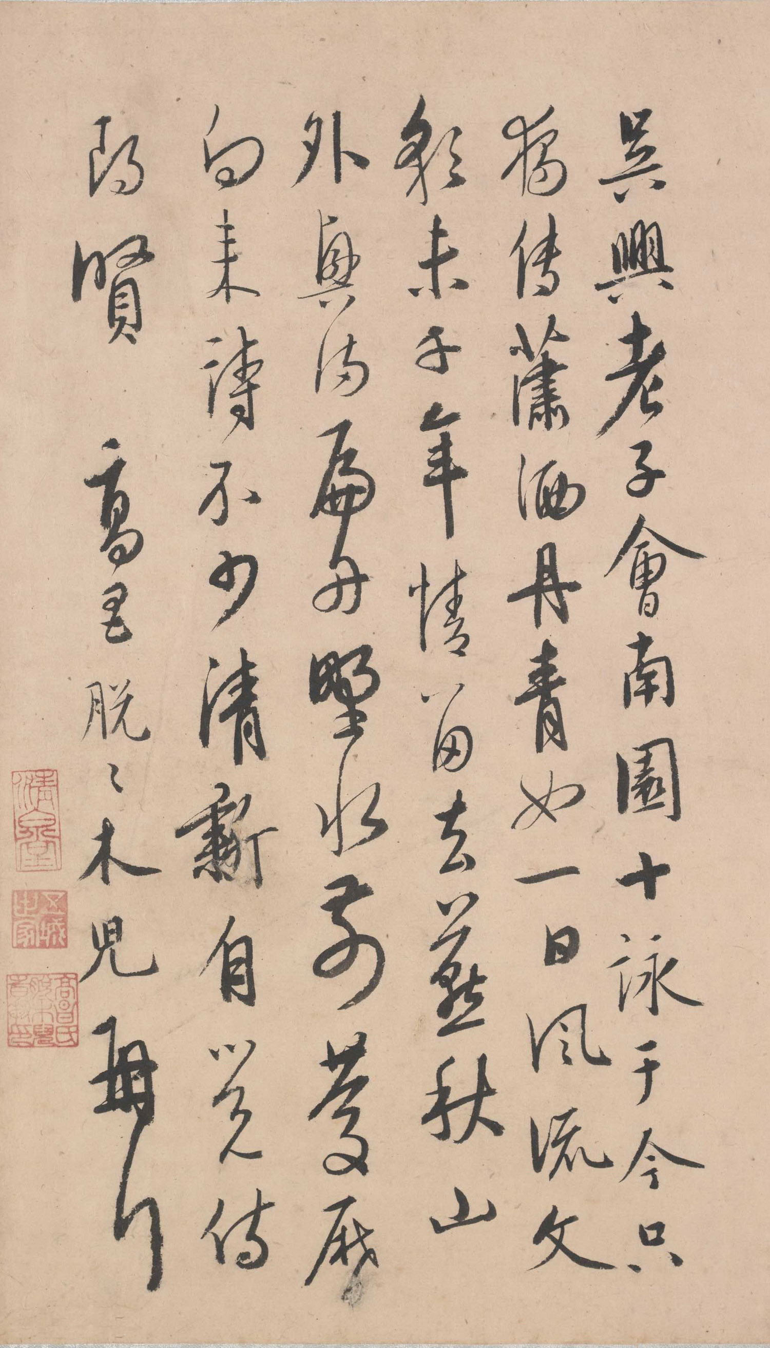 書法欣賞魏晉書法唐朝書法宋朝書法元朝書法明朝書法清朝書法近現代書法字典網>> 歷代書法>> 遼金元>> 脫脫木兒·跋張先《十詠圖》正文 脫脫木兒·跋張先《十詠圖》作者:脫脫木兒 書體:行書 【釋文】吳興老子會南園,十詠於今只獨傳。瀟灑丹青如一日,風流文彩未千年。情留去燕秋山外,興滿扁舟野水前。慶曆向來詩不少,清新自覺侍歸賢。高昌脫脫木兒再拜。脫脫木兒跋張先《十詠圖》,故宮博物館藏。鈐三方印章:“清白堂”、“五城世家”、“高昌氏脫脫木兒時敏印”。相關文章:曹有光·跋藍瑛《仿黃公望山水卷》 (行書)曹有光跋藍瑛《仿黃公望山水卷》,行書。趙孟頫草書《種松帖》 (草書)《種松帖》是他寫給老家的書信,信中提及自己顧念家鄉之事,但心有餘而力不足,難以事...陳淳·《荷花小鳥圖》題跋 (行書)陳淳《荷花小鳥圖》題跋,水墨紙本。蘇軾行書《獲見帖 》《致長官董侯尺牘》 (行書)此帖又名《致長官董侯尺牘》。蘇軾書於元豐五年(1082)。紙本。行書,信札一則。...張孔孫·跋蘇軾洞庭春色中山松醪二賦 (行楷)張孔孫《跋蘇軾洞庭春色中山松醪二賦》,行楷,紙本,縱28厘米,橫25厘米,吉林省...宋克《閒居詩》 (草書)宋克《閒居詩》,草書。《閒居詩》釋文:負郭堂成水竹列,平生筆硯是鋤犁;性田所喜無...周儀《桃花源記》 (小楷)周儀《桃花源記》,小楷。現藏愛爾蘭都柏林市切斯特·比蒂圖書館。此作題於顧符稹《...包世臣行書《致熙載札》 (行書)包世臣《致熙載札》紙本行書 23×13cm×2 日本私人藏【資料來源】《中國...米芾《米南宮十七帖》 (草書)米南宮十七帖為宋米芾《王羲之十七帖》臨摹本,真草對照,甚得原作精髓。原帖是傳世著...文徵明《草書詩卷》 (草書)文徵明草書詩卷 紙本 縱29.5厘米,橫133.4厘米。無錫市博物館藏釋文:“山...