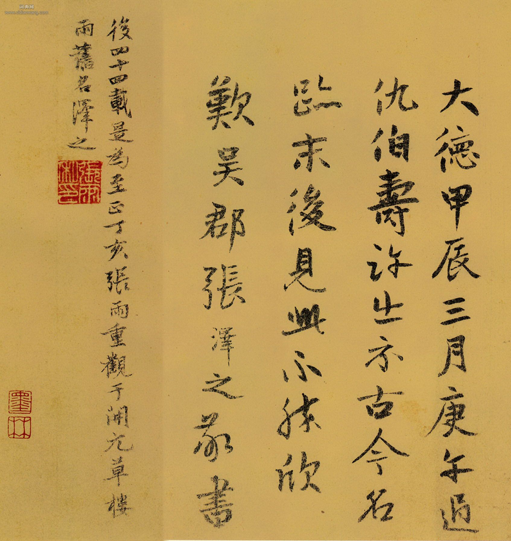 書法欣賞魏晉書法唐朝書法宋朝書法元朝書法明朝書法清朝書法近現代書法字典網>> 歷代書法>> 遼金元>> 張雨·跋《褚摹蘭亭序》正文 張雨·跋《褚摹蘭亭序》作者:張雨 書體:行書 【釋文】大德甲辰三月庚午遇仇伯壽許出示古今名跡,末後見此,不勝欣歡,吳郡張澤之敬書。後四十四載是為至正丁亥,張雨重觀於開元草樓,雨舊名澤之。張雨跋《褚摹蘭亭序》,題跋共二段。北京故宮博物院藏。張雨的相關書法作品:張雨行書《題張彥輔畫詩卷》 張雨小楷《跋吳叡篆書千字文》 張雨行書《論書帖》 張雨行書《自書詩冊》 張雨《寄彝齋、雲林諸公五言詩札》 張雨行書《澱湖社集尺牘》 張雨行書《自書雜詩冊》 張雨《獨游龍井方圓庵行書詩卷》 張雨行楷《鐵琴詩卷》 相關文章:高鳳翰《隸書聯捷詩軸》 (隸書)高鳳翰《隸書聯捷詩軸》綾本隸書 113.5cm×40.5cm 徐州市博物館藏釋...北魏《賀蘭汗造像記》 (楷書)龍門二十品之《賀蘭汗造像記》,全稱《廣川王祖母太妃侯為亡夫賀蘭汗造像題記》。屬“...楷書源頭到底是什麼?楷書又稱“真書”、“正書”,產生於漢末,盛行於魏晉南北朝,隋唐達到極致。楷書在歷...劉魁·跋范仲淹《道服贊》 (楷書)【釋文】黃山谷古今名書者猶推文正公小楷筆精而瘦勁自得古法世人可不知所重耶成化辛丑...盧中南楷書《白居易長恨歌》 (楷書)盧中南楷書《白居易長恨歌》寫於2010年12月。盧中南1950年生。中國書法家協...文同·跋范仲淹《道服贊》 (行書)文同跋范仲淹《道服贊》,行書,縱34.8cm,北京故宮博物院藏。東漢《王平君闕銘》 (隸書)東漢 王平君闕銘 闕高220cm 寬57cm 四川成都市出土趙孟頫行書《與山巨源絕交書》 (行書)趙孟頫《與山巨源絕交書》(1319) 綠絹本 21.8x254.7cm 北京故宮...杜瓊《榮登帖》 (行楷)【釋文】吳下辱知杜瓊奉書原博狀元修譔閣下:自閣下榮登二元,名聞天下,誠不負所學如...北魏《馬鳴寺根法師碑》 (楷書)《馬鳴寺根法師碑》,亦稱《馬鳴寺碑》,北魏正光四年立於今山東省東安縣大王橋。碑文...