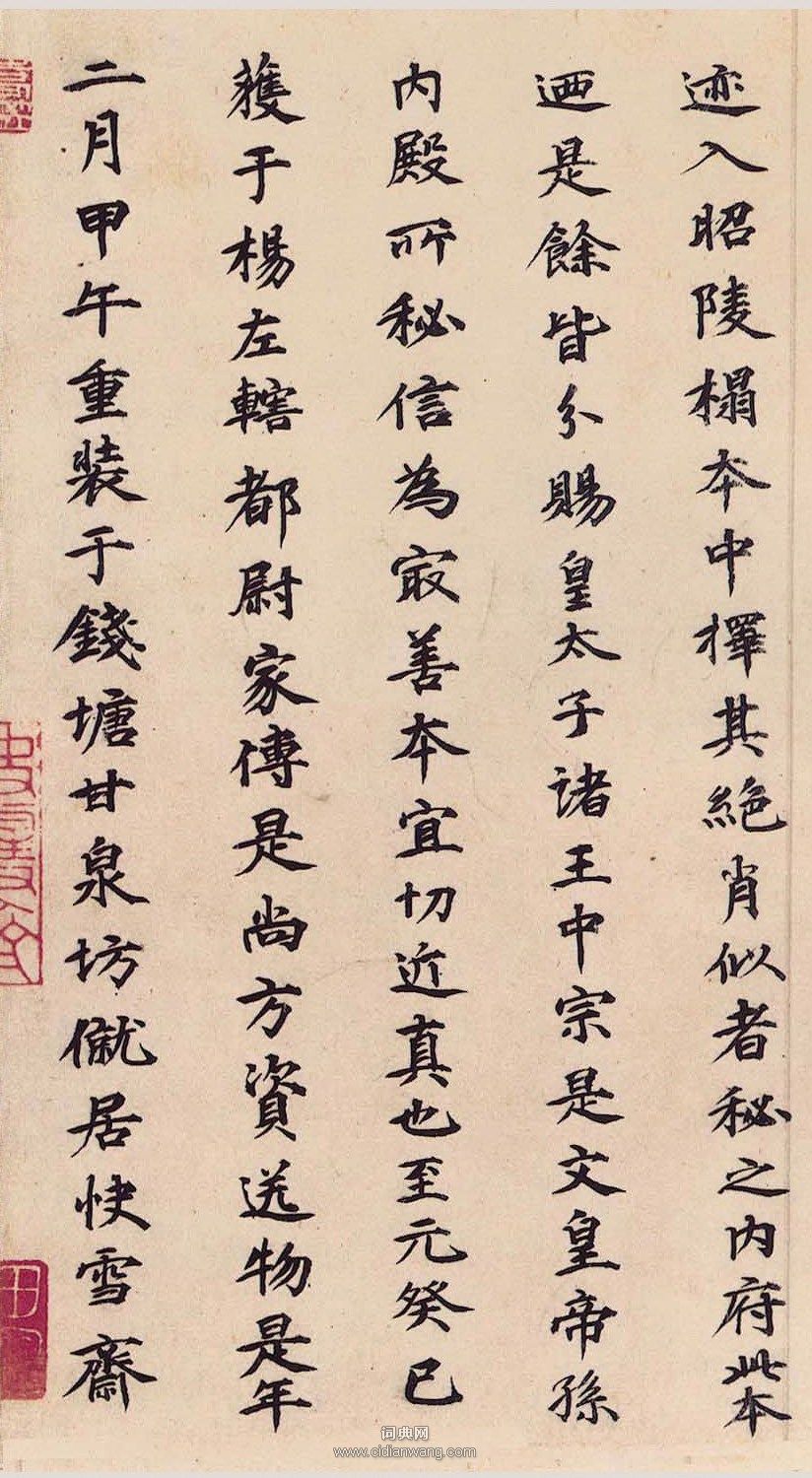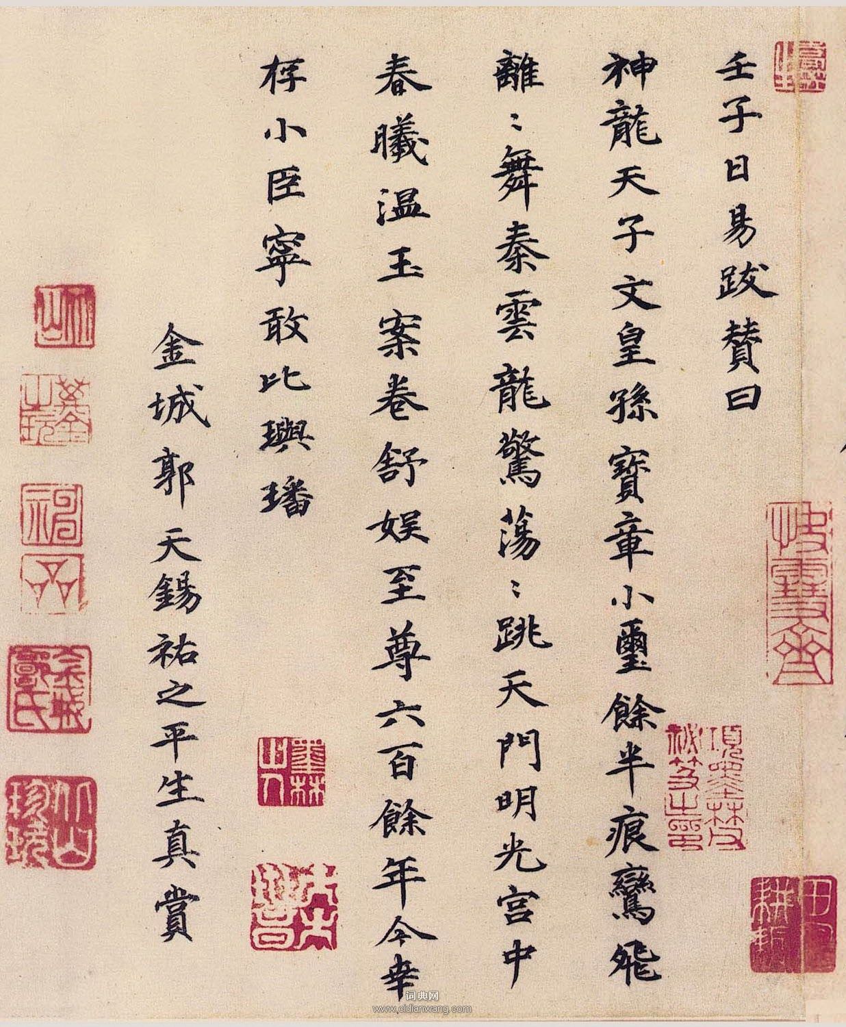 書法欣賞魏晉書法唐朝書法宋朝書法元朝書法明朝書法清朝書法近現代書法字典網>> 歷代書法>> 遼金元>> 郭天錫·跋《神龍蘭亭序》正文 郭天錫·跋《神龍蘭亭序》作者:郭天錫 書體:楷書 郭天錫跋《神龍蘭亭序》,楷書,縱24.5cm,北京故宮博物院藏。1 2 下一頁 尾 頁郭天錫的相關書法作品:郭天錫小楷《王獻之保母帖跋》 郭天錫·跋《神龍蘭亭序》 郭天錫·跋歐陽詢《仲尼夢奠帖》 相關文章:梁昇卿隸書《御史台精舍碑》 (隸書)梁昇卿生卒不詳,初仕奉天縣尉,後官至廣州都督,太子右庶子,約天寶初年卒。與張九齡...不會選帖?楷行草臨習絕竅一、關於草書的臨習 1、草書分為兩類:一是章草,即隸之草;二是今草,即楷之草,理...董小宛《小楷秋閨詞自作七言詩十一首扇面》 (小楷)董小宛《小楷秋閨詞自作七言詩十一首扇面》金箋紙楷書 18.5×51.4cm 吉...蘇軾楷書《豐樂亭記》 (楷書)蘇軾《豐樂亭記》,北宋拓本(成都古籍書店出版)《豐樂亭記》,歐陽修撰文,蘇軾楷書...王鐸草書《為葆光張老親翁書》詩卷 (草書)王鐸草書《為葆光張老親翁書》詩卷 1065年作 縱30厘米 橫364.5厘米 北...趙孟頫小楷《高上大洞玉經》 (小楷)趙孟頫小楷《高上大洞玉經》元代至元二十八年八月,三十八歲的趙孟俯在北京為友人民瞻...褚遂良·大字陰符經 (楷書)“大字陰符經”墨跡本,96行,461字,傳唐代褚遂良書。世傳褚遂良楷書有“雁塔聖...沈尹默行書《歐陽修寶劍詩軸》 (行書)沈尹默《行書歐陽修寶劍詩軸》紙本行書【資料來源】《海派代表書家系列作品集——沈尹...張瑞圖小楷《王無功答馮子華書》冊 (小楷)張瑞圖《小楷王無功答馮子華書》冊 灑金箋本 23.5×14.6厘米×15 崇...了庵清欲·法文 (行書)《法文》,紙本,行書,27.7×73.3cm。日本東京國立博物館藏(松平直亮氏...