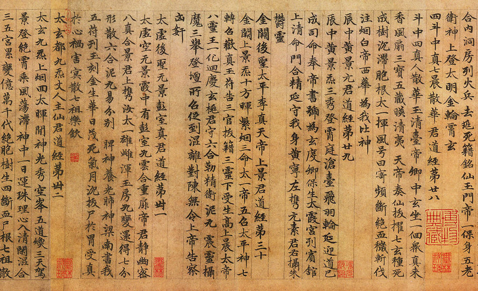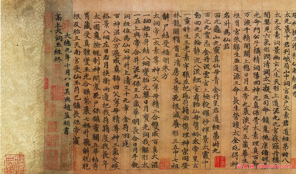 這件《高上大洞玉經》書於大德九年。全卷近4700字,無一筆懈怠,其結體妍麗,用筆遒勁,神彩飄逸。書寫此卷時,書家年已五十有二,正值壯年,加之其虔心向佛,此書誠是一件傳世精品之作。這捲紙本墨跡,縱29.7厘米,橫457厘米。現藏於天津藝術博物館。