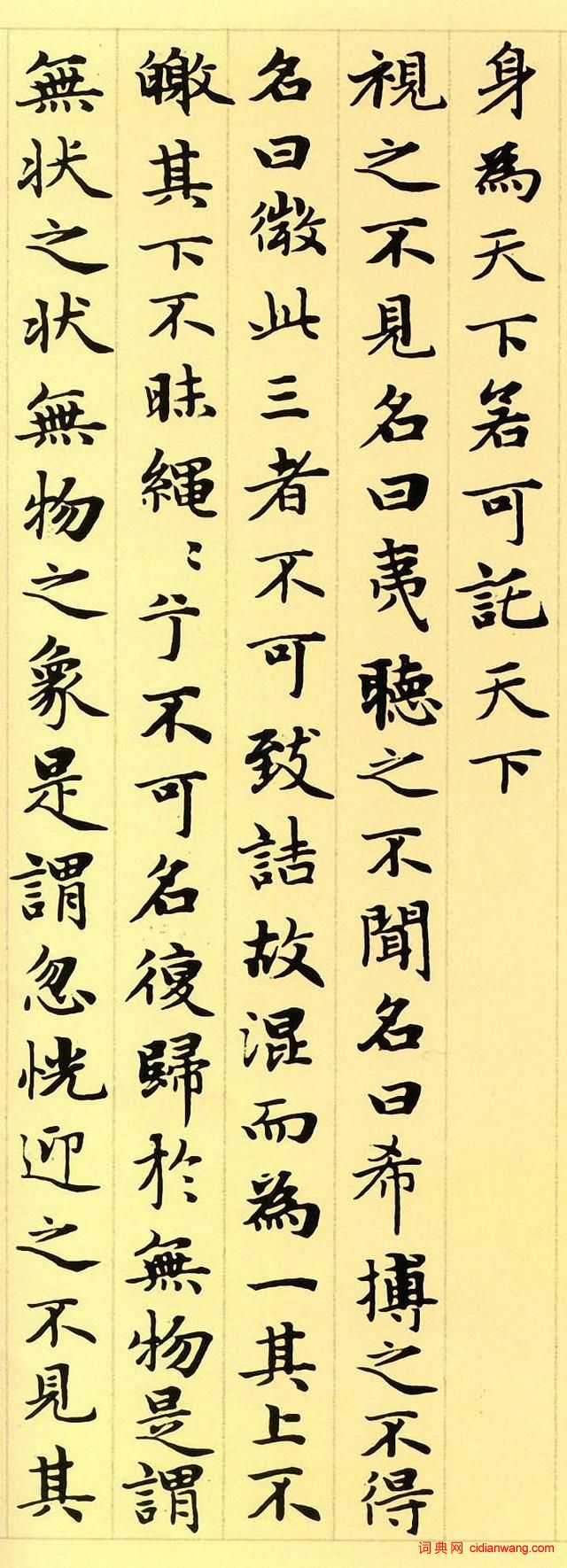 書法欣賞魏晉書法唐朝書法宋朝書法元朝書法明朝書法清朝書法近現代書法字典網>> 歷代書法>> 遼金元>> 趙孟頫小楷《道德經》高清版(6)正文 趙孟頫小楷《道德經》高清版(6)作者:趙孟頫 書體:小楷 首 頁 上一頁 2 3 4 5 6 7 8 9 10 11 下一頁 尾 頁趙孟頫的相關書法作品:趙孟頫《行草陶淵明五言詩頁》 趙孟頫《行書十札卷》拓本 趙孟頫《蘭亭序十三跋》殘本 趙孟頫《真草千字文》 趙孟頫《閒居賦》 趙孟頫行草《宗陽宮帖》 趙孟頫行書《山上帖》 趙孟頫·跋王羲之《大道帖卷》 趙孟頫行草《王羲之軼事卷》 相關文章:祝允明草書《摸魚兒詞》 (草書)草書摸魚兒詞一首 紙本 縱72.2厘米 橫26.3厘米。 中國嘉德2005秋季拍...黃庭堅草書《花氣薰人帖》 (草書)黃庭堅《花氣薰人帖》 紙本草書 30.7×43.2cm,台北故宮博物院藏釋文:...邢侗《行書臨柳公權論筆帖》 (行書)邢侗《行書臨柳公權論筆帖》 上海博物館藏 【資料...張即之行書《棐茗帖》 (行書)張即之《棐茗帖》紙本行書 26.8×23.6cm 釋文:棐茗皆山中珍品拜貺感銘...文徵明《行草口號十首卷》 (行草)明代文徵明書法作品欣賞《行草口號十首卷》紙本,高28.5厘米,縱310.6厘米,...東漢隸書《幽州書佐秦君石闕》 (隸書)《幽州書佐秦君石闕》拓片 此石1964年出土於北京西郊石景山。無年月,存陽文“漢...黃庭堅行書《小子相帖》 (行書)黃庭堅行書小子相帖 紙本 縱31.3厘米 橫33.3厘米上海博物館藏此帖行書七行...趙孟頫《吳興賦》 (行書)趙孟頫墨跡《吳興賦》,手卷,絹本,縱25.2、橫282.3厘米,首題“吳興賦”,...張旭《心經》 (草書)張旭的《草書心經》最早見於《碑刻拔萃》,其《唐草心經》碑目下寫明張旭,此前碑林中...文徵明《草書七律立軸》 (草書)草書七律立軸 見於中國嘉德國際拍賣有限公司2005春季拍賣會中國古代書畫專場尺 ...