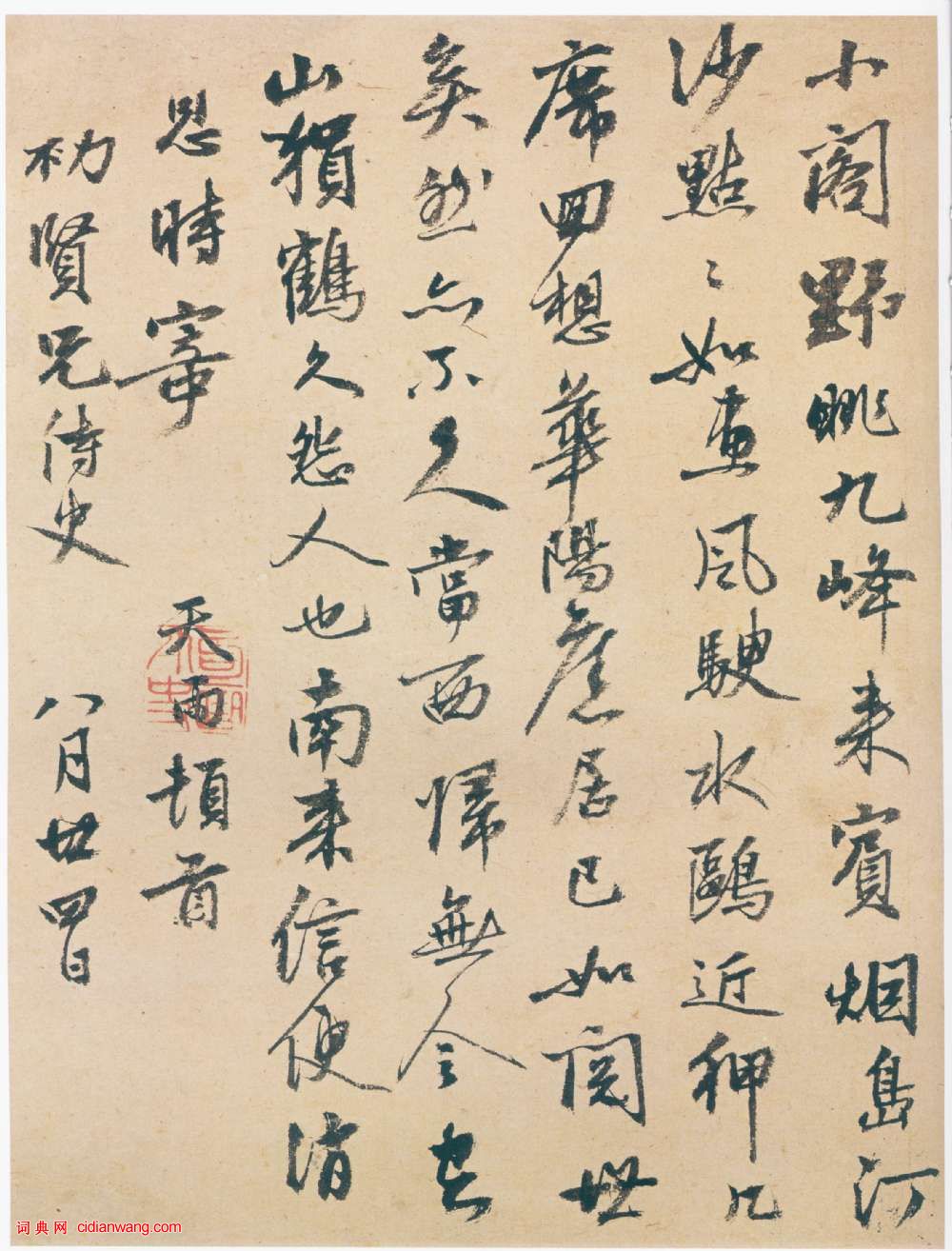 書法欣賞魏晉書法唐朝書法宋朝書法元朝書法明朝書法清朝書法近現代書法字典網>> 歷代書法>> 遼金元>> 張雨行書《澱湖社集尺牘》(2)正文 張雨行書《澱湖社集尺牘》(2)作者:張雨 書體:行書 【資料來源】台北故宮博物院網站 故-書-000258-00004《中國書法全集》第45卷(榮寶齋) 首 頁 上一頁 1 2 張雨的相關書法作品:張雨行書《自書雜詩冊》 張雨行書《跋褚遂良摹蘭亭序卷》 張雨行書《次韻天鏡上人送柑詩帖》 張雨行書《自書詩冊》 張雨《寄彝齋、雲林諸公五言詩札》 張雨·次韻天鏡上人送柑詩帖 張雨行書《登高詩札》 張雨行楷《鐵琴詩卷》 張雨行書《登南峰絕頂七言律詩軸》 相關文章:9對王羲之最美集字對聯 (行書)王羲之(303年—361年,一作321年—379年),字逸少,漢族,東晉時期著名...徐渭草書《李太白詩卷》 (草書)徐渭《草書李太白詩卷》 紙本草書 30×383cm 王已千舊藏釋文:(尋山僧...黃道周行草《讀倪鴻寶疏五律詩軸》 (行草)黃道周《讀倪鴻寶疏五律詩軸》綾本 行草書 166×55cm 天津市博物館藏釋文...張雨行書《致方鳳札》 (行書)天曆元年(1328) 張雨《致方鳳札》紙本 24.5×22.5cm 美國程可庵...邢慈靜《行書五言詩》 (行書)邢慈靜生卒年代不詳。臨邑(今屬山東)人。邢侗之妹。號蒲團主人、蘭雪齋主。貴州左布...沈度·敬齋箴冊 (小楷)沈度《敬齋箴冊》,楷書,縱23.8cm,橫49.4cm。北京故宮博物院藏。款署“...吳昌碩《篆書雪廬橫幅》 (篆書)吳昌碩《篆書雪廬橫幅》紙本篆書 34×104cm 1923年 西泠印社藏 釋文...蘇軾小楷《養生論》 (小楷)蘇軾小楷欣賞《養生論》拓本,出自萬曆31年董其昌編輯《戲滿堂法帖》。紹聖二年四月...奚岡《草書軸》 (草書)奚岡《草書軸》紙本草書 167.2×44.8cm 湖北省博物館藏 釋文:五湖春...應均《行書看劍論文七言聯》 (行書)應均《行書看劍論文七言聯》紙本行書 1938年 浙江永康萬泰美術館釋文: 看劍拂...