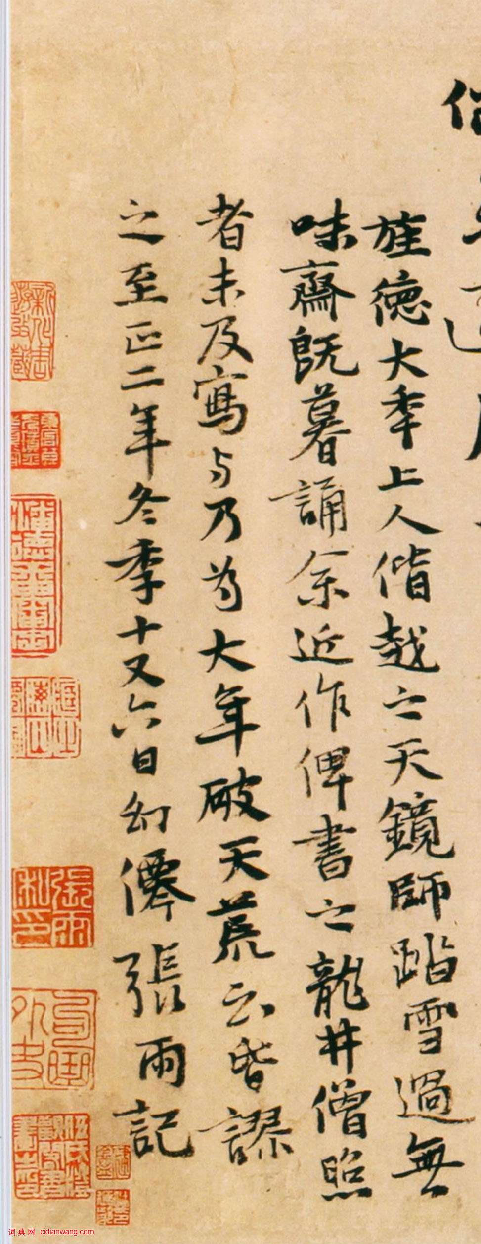 資源下載魏晉書法唐朝書法宋朝書法元朝書法明朝書法清朝書法近現代書法字典網>> 歷代書法>> 遼金元>> 張雨《獨游龍井方圓庵行書詩卷》(4)正文 張雨《獨游龍井方圓庵行書詩卷》(4)作者:張雨 書體:行書 首 頁 上一頁 1 2 3 4張雨的相關書法作品:張雨行楷《鐵琴詩卷》 張雨行書《上閒止詩卷》 張雨行書《登南峰絕頂七言律詩軸》 張雨行書《跋褚遂良摹蘭亭序卷》 張雨行書《澱湖社集尺牘》 張雨行書《論書帖》 張雨·發蛻庵詩札 張雨行書《次韻天鏡上人送柑詩帖》 張雨《寄彝齋、雲林諸公五言詩札》 相關文章:米芾·聞張都大宣德尺牘 (行草)【釋文】聞張都大宣德,權提舉榆柳局在杞者。儻蒙明公薦此職,為成此河事致薄效何如。...熊廷弼·致友人手札 (草書)熊廷弼不以書法名世,但其人格、其才能為後世所仰,如傅山就有一段有關熊的記載,崇禎...歐陽詢《夢奠帖》 (行書)【釋文】仲尼夢奠,七十有二。周王九齡,具不滿百。彭祖資以導養,樊重任性,裁過盈數...鄭孝胥《自言敢辱七言聯》 (行書)《自言敢辱七言聯》釋文:自言愛此萬仞水 敢辱報之金裊啼鄭孝胥《行書對聯》,184...黃庭堅行書《白鶴梁題字》 (行書)黃庭堅《白鶴梁題字》石刻 白鶴梁是位於重慶市涪陵區城北長江江心西側的一段天然石樑...張瑞圖《行草書杜甫詩冊》 (行草)張瑞圖《行草書杜甫詩冊》天啟四年(1624) 朵雲軒藏 【釋文】知歸俗可忽,取適...東漢隸書《石門頌》 (隸書)《石門頌》全稱《漢司隸校尉楗為楊君頌》。又稱《楊孟文頌》。東漢建和二年(148年...王鐸行書《寄金陵天目老衲詩》 (行書)王鐸《行書寄金陵天目老衲詩》立軸 設色綾本 231×51cm 順治三年(16...伊秉綬隸書《政成心逸五言聯》 (隸書)伊秉綬《隸書“政成心逸”五言聯》紙本隸書 146×34.7cm×2 北京故宮...龜甲占卜文 (甲骨文)甲骨文是龜甲、獸骨文字的簡稱,全稱“龜甲獸骨文字”,也稱“龜甲文”、“卜辭”、“...
