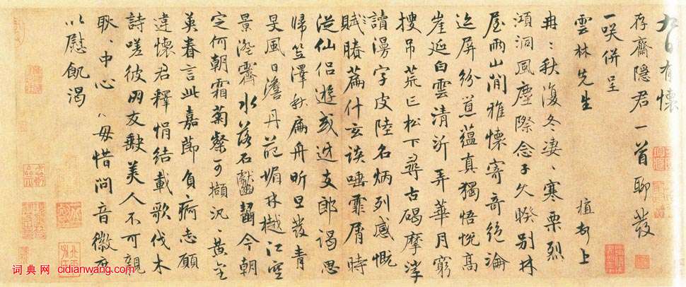 這是陳植寫給"存齋隱君"的一首五言古詩,以詩代柬。"存齋"就是沈右,沈右自署"存存齋",陳基《夷白齋稿》有"存存齋記"一篇,云:"沈君仲說(沈右字仲說),隱居於吳會,耕學於笠澤,廬於陳公之原,而皆名其室曰存存齋"。此詩中亦有"思歸笠澤秋"的句子,與上說正合。另外 在存世的沈右書跡中,也常提及陳植,其中"詩柬帖"即"與叔方詩札並柬"帖,就是給陳植的,可知二人交往頗密。"雲林",即倪瓚,時亦在吳中。