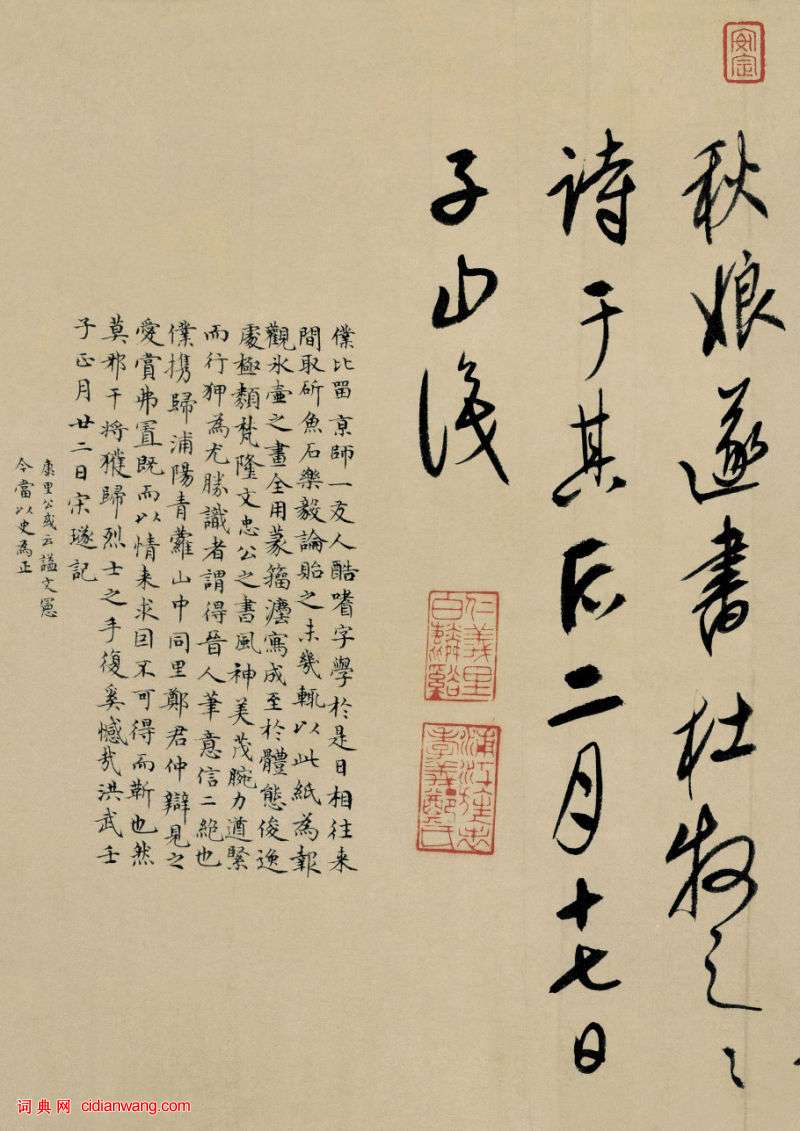 資源下載魏晉書法唐朝書法宋朝書法元朝書法明朝書法清朝書法近現代書法字典網>> 歷代書法>> 遼金元>> 康里巎巎行書題周朗《杜秋娘圖卷》(7)正文 康里巎巎行書題周朗《杜秋娘圖卷》(7)作者:康里巎巎 書體:行書 首 頁 上一頁 1 2 3 4 5 6 7康里巎巎的相關書法作品:康里巎巎草書詩書卷之《唐人絕句六首》 康里巎巎行書題周朗《杜秋娘圖卷》 康里巎巎行書跋趙孟頫《太上老君說常清靜經》 康里巎巎行草《致彥中尺牘》 康里巎巎草書《謫龍說》 康里巎巎跋《任仁發張果老見明皇圖卷》 康里巎巎行書《柳宗元梓人傳》 康里巎巎行書《自作秋夜感懷七言古詩》 康里巎巎《草書張旭筆法卷》 相關文章:方亨鹹《行書七絕詩軸》 (行書)方亨鹹《行書七絕詩軸》紙本行書 189.5×54.4cm 安徽省博物館藏釋文:...陳基《賢郎帖》 (行草)元 陳基 《賢郎帖》 紙本,北京故宮博物院藏。 陳基(1314—1370年),字...宋克《唐張懷瓘論用筆十法》 (行草)宋克書《唐張懷瓘論用筆十法》,紙本。此作今已一分為二,前半部分為《張懷瓘論用筆十...李瑞清《楷書虛室清歌五言聯》 (楷書)李瑞清《楷書虛室清歌五言聯》 177×46cm×2 紙本 1919年 上...趙孟頫行書 《煙江疊嶂圖》 (行書)《煙江疊嶂圖》是宋代大畫家王冼的作品,蘇東坡在欣賞王冼的這件作品之後寫下了《書王...龍門二十品之太妃侯造像題記 (楷書)龍門二十品之《太妃侯造像題記》,全稱《廣川王祖母太妃侯造像題記》。景明四(503...清代梁同書手札絹本 (行草)梁同書以行草見長,結字端嚴穩妥,用筆嫻靜流暢、平和自然、從容灑脫,那種溫文而雅的...倪元璐行草《劉鉅溟過訪行草書札》 (行草)倪元璐《劉鉅溟過訪行草書札》行草書 藏處不詳釋文:江右新解頭劉鉅溟弟,丁卯所拔,...米芾·褚臨黃絹本蘭亭序跋贊 (行書)【釋文】右唐中書令河南公褚遂良字登善臨晉右將軍王羲之蘭亭宴集序,本朝丞相王文惠公...徐霖·篆書四言詩卷 (篆書)【釋文】蘅從圜方,剖分玄黃。日月懸象,著明陰陽。人參兩儀,身為己岡。貌言視聽,內...
