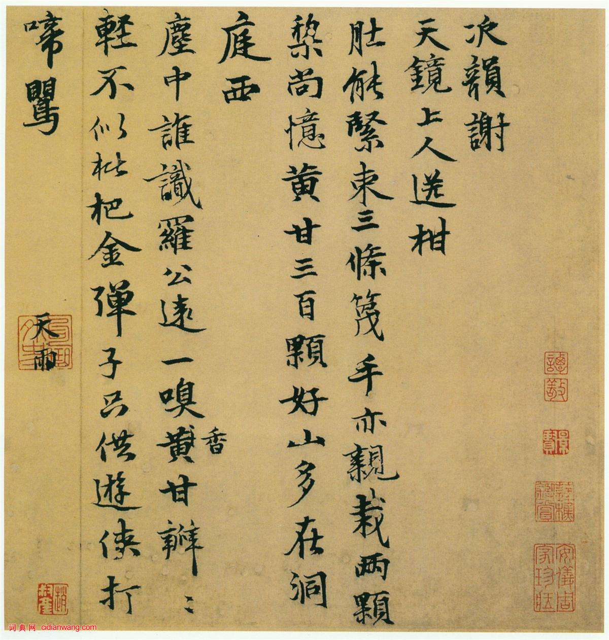 書錄“次韻謝天鏡上人送柑"詩。 “天鏡上人”,是杭州靈隱寺僧圓瀞。此帖結體精緊確有歐書的規模,但是棄其險勁而師法趙書的清和閒雅,風格又有李邕書的剛勁峻拔,同時又得趙書的道媚俊逸。當然,張雨的識見才學和修養,使他的字並不為一家所囿,而有其本身的藝術特徵,這就是結體方正,用筆精緊,戈勾特長,遒逸清新。
