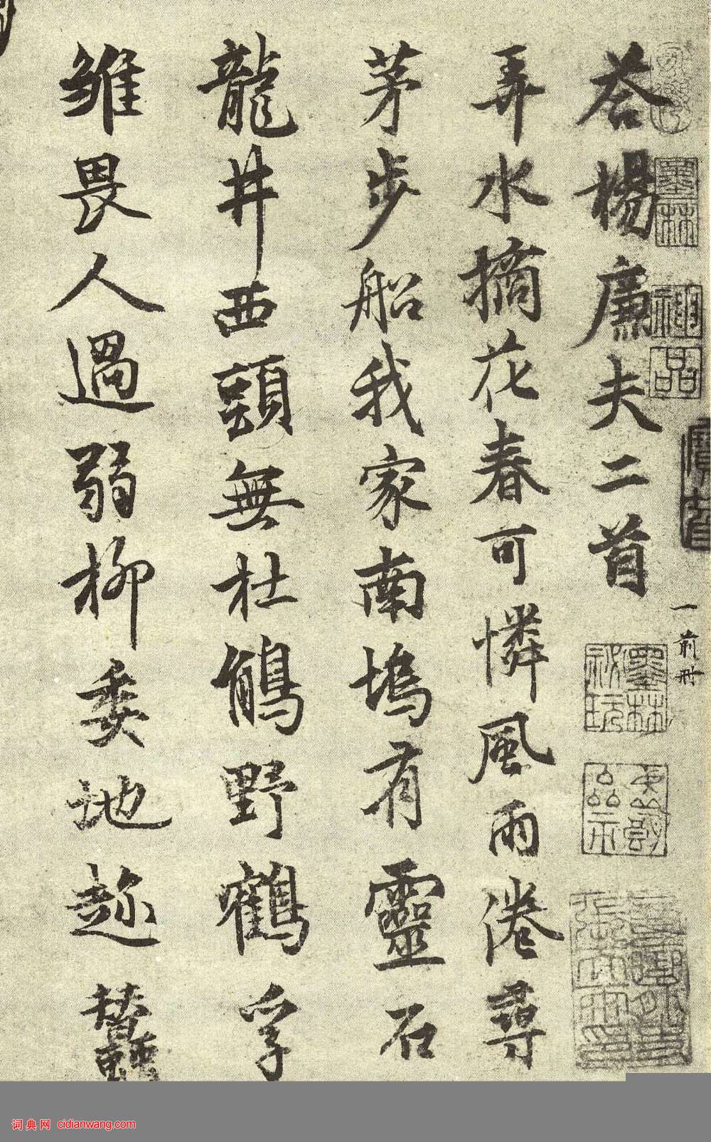 張雨《自書詩冊》書於至正五年(1345年),粉花箋本。行楷書,凡143行,計1276字。據冊內明項元汴小楷所註:全帙正文總計六十二頁(三十一開),原裝為前後二冊,後連名人題跋一冊,計三十人。此詩冊今已分散,上海博物館收藏第一至八頁、第四十七至六十二頁,合計二十四頁。此為所失之《趙伯常運使留題澗阿即席次韻》、《三香圖》、《澗阿對雨二首》、《追寄危太僕》、《寄劉伯溫太監》。此冊書於張雨六十三歲,書後贈袁華,楊維楨在張雨死後一年見詩冊不勝悲愴。云:其首兩章乃此老道人效余鐵雅音也。如《道言》、《清齋》《澗阿》諸詩,皆其道趣中流出。吁!道人仙去已一紀矣,鐵錐之友屬何人?開卷愴然,不勝山陽之感雲。此詩冊是張雨春徂夏在陰雨連綿的澗阿幽篁中書成,神怡氣閒,殊不經意,隨詠寫志。故寫得自然清新,無做作修飾之態。