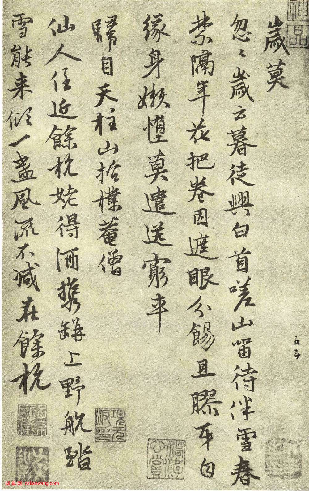 書法欣賞魏晉書法唐朝書法宋朝書法元朝書法明朝書法清朝書法近現代書法字典網>> 歷代書法>> 遼金元>> 張雨行書《自書詩冊》(9)正文 張雨行書《自書詩冊》(9)作者:張雨 書體:行書 首 頁 上一頁 5 6 7 8 9 10 11 12 13 14 下一頁 尾 頁 全文2016-7-26 12:54:35 張雨的相關書法作品:張雨《唐摹萬歲通天帖小楷題跋》 張雨行書《澱湖社集尺牘》 張雨《獨游龍井方圓庵行書詩卷》 張雨·跋《褚摹蘭亭序》 張雨行書《題張彥輔畫詩卷》 張雨《九鎖山小楷詩卷》 張雨·次韻天鏡上人送柑詩帖 張雨行書《登高詩札》 張雨·澱湖社集尺牘 相關文章:弘仁行書《風雹雨作扇面》 (行書)弘仁《行書風雹雨作扇面》 上海博物館藏釋文:青空一瞬墨雲成,馳鶩騰驤幻突冥。谷里...蘇軾行書《答謝民師論文帖卷》 (行書)蘇軾 《行書答謝民師論文帖卷》紙本 縱27厘米 橫96.5厘米,上海博物館藏。此...楊法《篆書五言聯》 (篆書)楊法《篆書五言聯》90.3×21.8cm×2 浙江省博物館藏 轉自浙江省博物...王士禎行書《舊作二首》 (行書)王士禎《行書舊作二首》紙本行書 100×51cm 遼寧省博物館藏釋文:宮柳煙含...蔣傑·行草登岱詩 (行草)釋文《登岱作》。千盤鳥道轉高峰,玉輦曾經過六龍。松葉未收秦日雨,雲光常護漢時封。...李鱓《行書羅隱七言詩聯》 (行書)李鱓《行書羅隱七言詩聯》紙本行書 126×27cm×2 中國國家博物館藏 釋...于右任《草書杜甫前出塞之五詩軸 》 (草書)于右任《草書杜甫前出塞之五詩軸 》紙本草書 86×45cm 南京市博物館藏釋文...左宗棠行書《野廬青山七言聯》 (行書)左宗棠《行書“野廬青山”七言聯》紙本行書 176.4×37.6cm×2 台北...張雨《賦聽泉亭詩札》 (行書)【釋文】句曲外史賦聽泉亭絕句。疊石為山小結亭。亭皋白水浸空青。要知魚鳥忘情地。卻...王冕題《南枝春早圖》 (楷書)《南枝春早圖》軸,絹本,墨筆,縱141.3厘米,橫53.9厘米。王冕晚期代表作,...