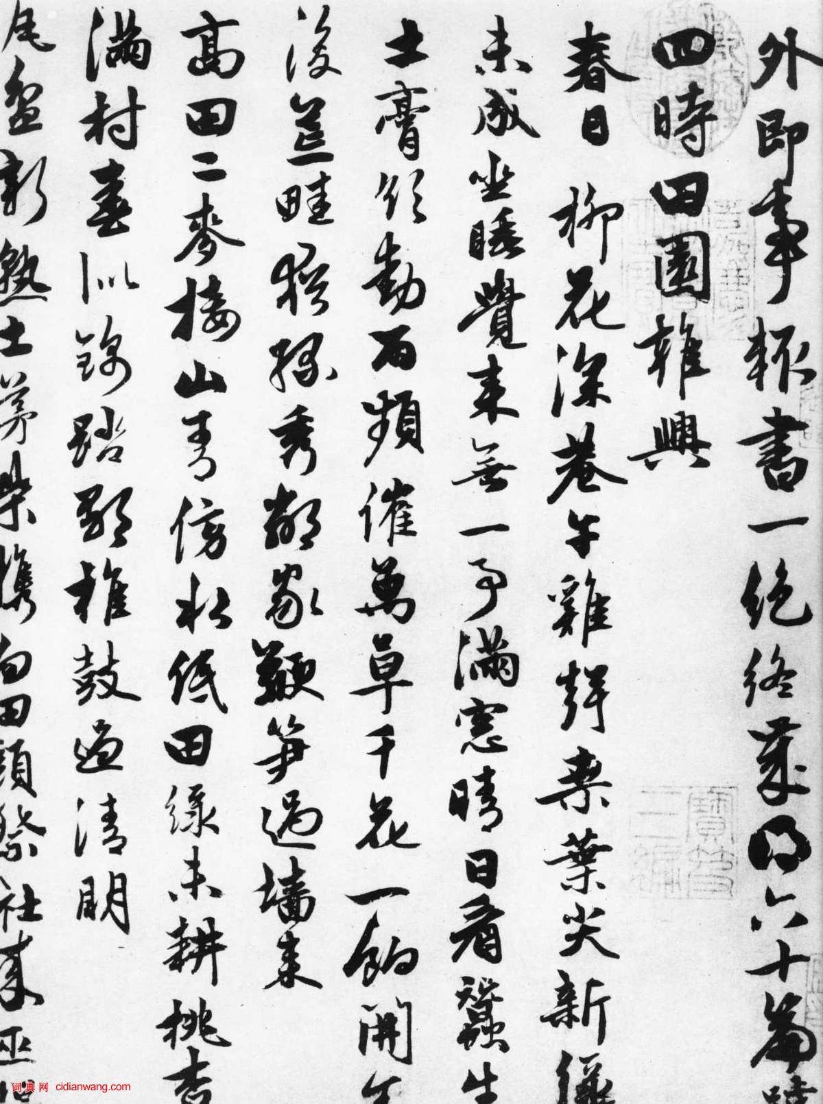 書法欣賞魏晉書法唐朝書法宋朝書法元朝書法明朝書法清朝書法近現代書法字典網>> 歷代書法>> 遼金元>> 朱德潤行書《范成大四時田園雜興卷》(2)正文 朱德潤行書《范成大四時田園雜興卷》(2)作者:朱德潤 書體:行書 朱德潤《范成大四時田園雜興卷》(局部) 紙本 31.1X205.2cm 上海博物館藏圖片由可嘉提供 首 頁 上一頁 1 2 朱德潤的相關書法作品:朱德潤行書《致吳季實教諭尺牘》 朱德潤行書《范成大四時田園雜興卷》 朱德潤·跋黃宗道《獲鹿圖》 相關文章:孩子學書法的好處台灣教育界有句名言,就是“學書法的孩子不會學壞”,根據調查,一般學習書法的孩子學...文徵明行書自作詩卷 (行書)釋文: 三年端笏侍明光,潦倒爭看白髮郎。 咫尺常瞻天北極,分番曾直殿東廊。 紫泥...脫脫木兒·跋張先《十詠圖》 (行書)【釋文】吳興老子會南園,十詠於今只獨傳。瀟灑丹青如一日,風流文彩未千年。情留去燕...何紹基楷書《為樂去古八言聯》 (楷書)何紹基《楷書“為樂去古”八言聯》釋文:為樂及時令德無極,去古不遠直道在斯。蝯叟。...元明清珍藏印章欣賞印章自秦漢以還,距今已有二千多年。秦漢除官印外,多刻姓名、字號,也有少量吉語,至...西周《大克鼎》 (篆體)大克鼎為西周孝王時期器物,又名克鼎和膳夫克鼎,是西周晚期著名的青銅器。1890年...孫星衍《行書題環山小隱圖軸》 (行書)孫星衍《行書題環山小隱圖軸》紙本行書 129.8×60.2cm 浙江省博物館藏...顏真卿楷書《麻姑仙壇記》大字 (楷書)《麻姑仙壇記》顏真卿書於大曆六年(771年)四月,時年六十三歲。拓本。楷書,文一...高鳳翰《草書詠荷詩》 (草書)高鳳翰《草書詠荷詩》 31cm×23cm 揚州市八怪紀念館藏 ...賀知章《草書孝經》 (草書)賀知章《草書孝經》縱26.0厘米橫265.1厘米日本宮內廳三之丸尚藏館本卷以草書...