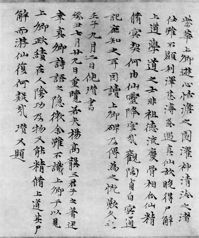 書法欣賞魏晉書法唐朝書法宋朝書法元朝書法明朝書法清朝書法近現代書法字典網>> 歷代書法>> 遼金元>> 倪瓚小楷《題周文英詩志傳》正文 倪瓚小楷《題周文英詩志傳》作者:倪瓚 書體:小楷 倪瓚小楷《題周文英詩志傳》 1372年 縱25.9厘米 橫26.2厘米 遼寧省博物館藏倪瓚的相關書法作品:倪瓚行楷《與袁寓齋書畫卷》 倪瓚小楷《致慎獨有道詩札》 倪瓚小楷題陳惟允《孟郊詩意圖》 倪瓚小楷《呈雲浦詩札》 倪瓚行楷《雲林畫譜冊》 倪瓚楷書題《筠石喬柯圖》 倪瓚小楷《題周文英詩志傳》 倪瓚楷書《呈寓齋詩帖》 倪瓚行書題《虞山林壑圖軸》 相關文章:米芾·竹前槐後詩卷 (行書)【釋文】芾非才當劇,咫尺音敬*然,比想慶侍,為道增勝,小詩因以奉寄。希聲吾英友。...宋璲《敬覆帖》 (草書)【釋文】璲敬覆別來數日便覺鄙陋頓生第未知何時可見昨日會令姪叔高還伏審候納福為慰潛...北魏楷書《崔敬邕墓誌》 (楷書)《崔敬邕墓誌》(費念慈舊藏本) 全稱《魏故持節龍驤將軍督營州諸軍事營州刺史征虜將...姚虞琴 跋蔣傑《登岱詩冊》 (行書)姚虞琴跋蔣傑《登岱詩冊》,行書。釋文:蔣傑字美若,別署石門居士,貴州普安衛,官籍...宋濂·跋虞世南《摹蘭亭序》 (楷書)宋濂跋虞世南《摹蘭亭序》,縱24.5厘米。現藏於北京故宮博物院。何紹基行書《小池隙地七言聯》 (行書)何紹基《“小池隙地”七言聯》蠟箋行書 123×30cm×2 常州博物館藏釋文...李斯《嶧山刻石》全文 (篆書)刻石呈豎長方形,水成岩石質,四面刻字。碑高1.9米,寬0.48米,四面皆同。正面...倪瓚楷書《致葉城諸詩札》 (楷書)倪瓚《致葉城諸詩札》 楷書,紙本,香港中文大學藏伊秉綬《行書七言詩軸》 (行書)伊秉綬《行書七言詩軸》 釋文:雪晴雲散北...孔尚任行書《題仲景小照卷》 (行書)孔尚任《行書題仲景小照卷》 縱34厘米,橫38厘米,紙本,中國國家博物館藏。題仲...