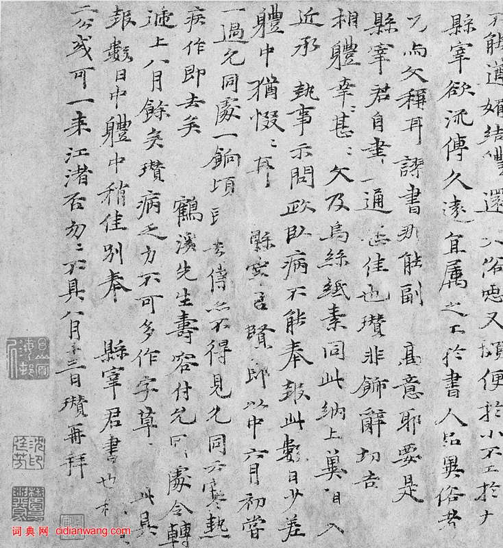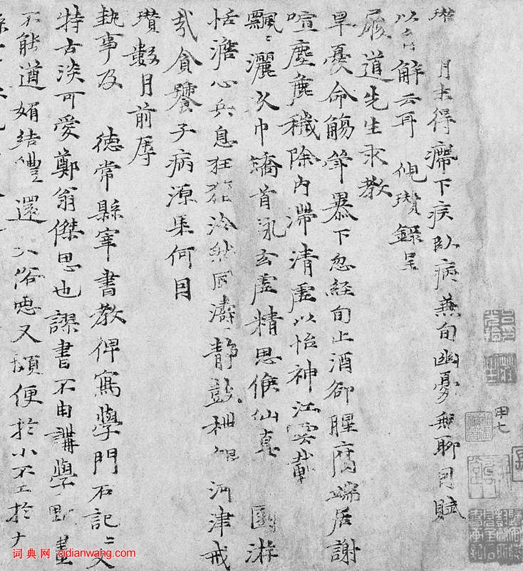 (七)瓚□,月末得■下疾,臥病兼旬。幽夏無聊,因賦□以自解雲耳。倪瓚錄呈履道先生(周砥)求教。早夏命觴■,暴下忽經旬。止酒卻腥腐,端居謝喧塵。粗移除內滯,清虛以怡神。江雲載□□,飄飄灑衣巾。矯首詠玄虛,精思候仙真。□園游恬澹,心兵息狂狷,冷然風濤靜,鼓枻銀河津。戒哉貪饕子,病源果何因。瓚數月前辱執事及德常(張經)縣宰書教,俾寫學門石記。記文特古淡可愛,鄭翁(鄭元祐)傑思也。謬書不由講學,點畫不能遒媚,結體還□俗惡,又頗便於小,不工於大。縣宰欲流傳久遠,宜屬之工於書,人品異俗者,乃與文稱耳。謬書那能副高意耶。要是縣宰君自書一通,甚佳也。瓚非飾辭,切告相體,幸甚幸甚。文及烏絲紙素同此納上,冀□入。近承執事示問,政臥病,不能奉報。此數日小差,體中猶惙惙耳。縣宰君賢郎以中(張以中,張德常子),六月初嘗一過允同處,一餉頃即去,仆亦不得。允同云:寒熱疾作,郎去矣。鶴溪先生(張監,張德常父)壽容付允同處,令轉遞上八月余矣。瓚病乏力,不可多作,字草草。□此具報。數日中體中稍佳,別奉縣宰君書也。□□二公,或可一來江渚否,匆匆不具。八月十三日瓚再拜。