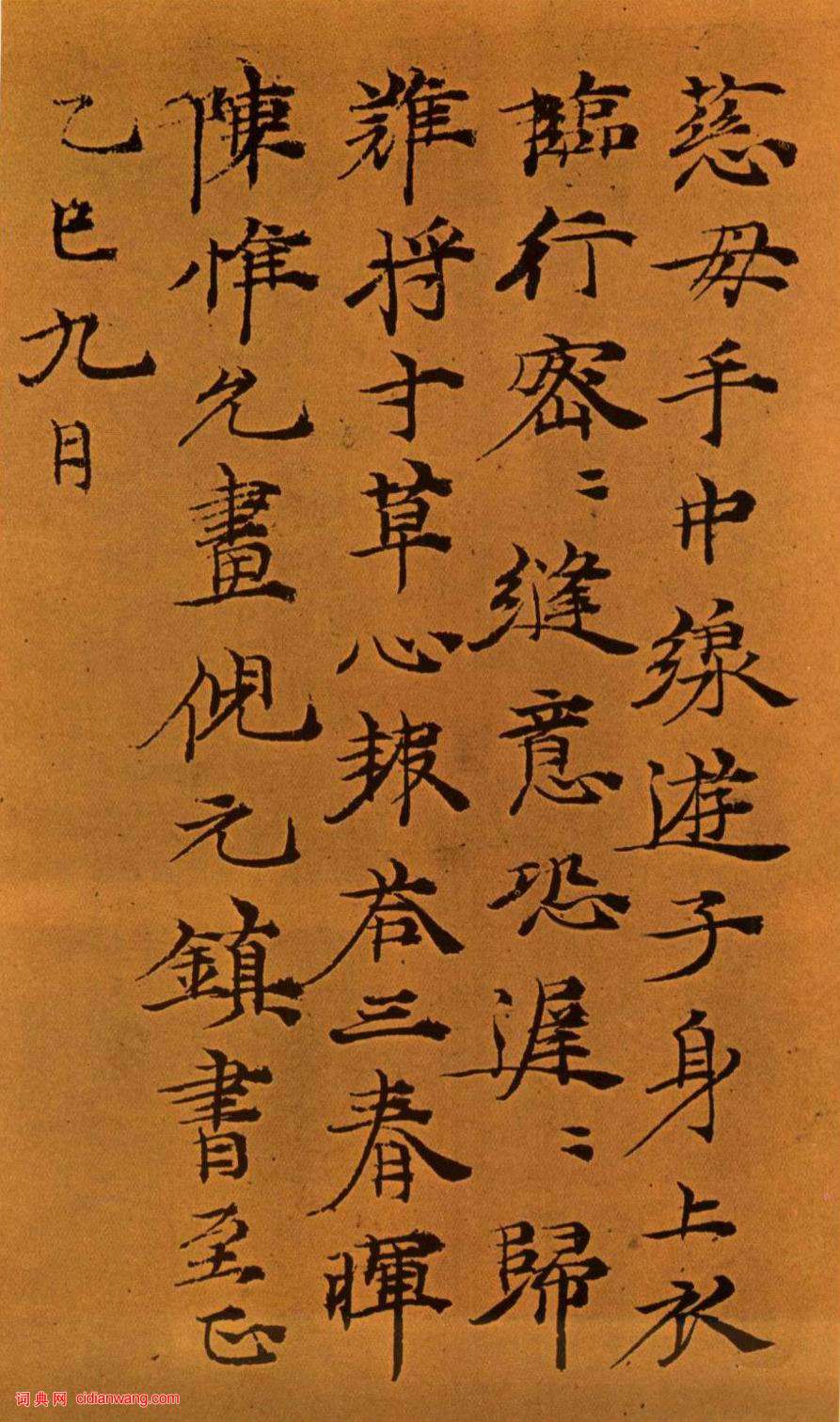 書法欣賞魏晉書法唐朝書法宋朝書法元朝書法明朝書法清朝書法近現代書法字典網>> 歷代書法>> 遼金元>> 倪瓚小楷題陳惟允《孟郊詩意圖》正文 倪瓚小楷題陳惟允《孟郊詩意圖》作者:倪瓚 書體:小楷 題陳惟允《孟郊詩意圖》1365 台北故宮博物院藏釋文:慈母手中線,遊子身上衣。臨行密密縫,意恐遲遲歸。誰言寸草心,報得三春暉。陳惟允畫倪元鎮書至正乙已九日倪瓚的相關書法作品:倪瓚楷書《題漁莊秋霽圖》 倪瓚楷書《致葉城諸詩札》 倪瓚楷書《呈寓齋詩帖》 倪瓚小楷《致慎獨有道詩札》 倪瓚楷書《呈履道先生詩札》 倪瓚楷書題《筠石喬柯圖》 倪瓚行楷《與袁寓齋書畫卷》 倪瓚行書題《虞山林壑圖軸》 倪瓚小楷《呈雲浦詩札》 相關文章:朱元璋《大軍帖》 (行書)【釋文】大軍自下山東,所過去處,得到迤北省院官員甚多。吾見二將軍留此等於軍中,甚...黃若舟怎樣練好鋼筆字,實用鋼筆草書字帖 (草書)黃若舟的怎樣練好鋼筆字,鋼筆草書字帖,經典實用!80年代初期出版過,對書法愛好者...傅山草書臨王羲之《闊轉久帖》 (草書)《草書臨帖》軸,北京故宮博物院藏,綾本,縱162.2cm,橫44cm。此軸為傅山...王守仁《楷書客座私祝冊》 (楷書)王守仁《楷書客座私祝冊》楷書 44.0.5×36.5cm×20 嘉靖六年(1...王世鏜章草《草訣歌》 (草書)王世鏜,近代著名書法家,字魯生,自號積鐵子,晚號積鐵老人。祖籍河北天津。生於清同...吳大澂行書《致大兄書札》 (行書)吳大澂《致大兄書札》轉自中華博物網釋文:大兄大人尊前:正月初七、十六兩次寄書,計...陳洪綬《行草書詩》扇面 (行草)陳洪綬《行草書詩》扇面 金箋 23.5×51cm 約順治七年(約1650)浙江...米芾大字行書《研山帖》 (行書)釋文:研山銘。五色水,浮崑崙。潭在頂,出黑雲。掛龍怪,爍電痕。下震霆,澤厚坤。極...張旭《肚痛帖》 (草書)《肚痛帖》:單刻帖。無款。此帖用筆頓挫使轉,剛柔相濟,千變萬化,神彩飄逸。全帖僅...于右任《草書呂子語軸 》 (草書)于右任《草書呂子語軸 》紙本草書 138×34cm 南京市博物館藏釋文:無愧於...