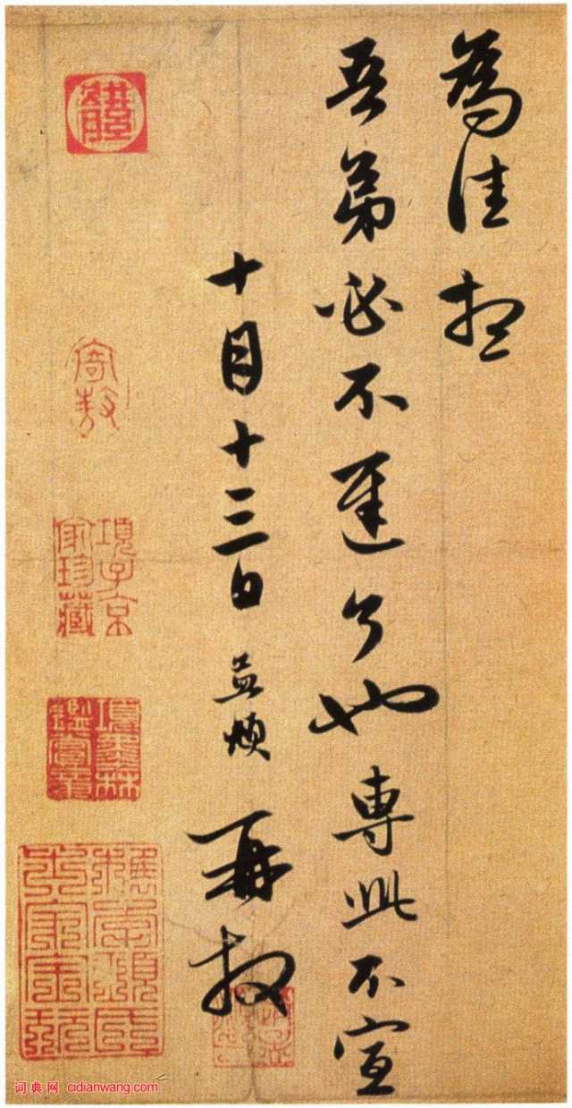 書法欣賞魏晉書法唐朝書法宋朝書法元朝書法明朝書法清朝書法近現代書法字典網>> 歷代書法>> 遼金元>> 趙孟頫行草《宗陽宮帖》正文 趙孟頫行草《宗陽宮帖》作者:趙孟頫 書體:行草 釋文:孟頫記事再拜。彥明郎中鄉弟足下。前者所言宗陽宮借房。請任先生開講。今已借得門西屋兩間。彥明疾早擇日收拾生徒為佳。想吾弟必不遲了也。專此不宣。十月十三日。孟頫再拜。 此帖是趙氏任江浙儒學提舉時寫給屬吏之信札。據方家 評介,此札筆力厚重,筆法精美,當是趙氏五十歲左右時書寫。趙孟頫的相關書法作品:趙孟頫《雪岩和尚拄杖歌卷》 趙孟頫行楷跋楊凝式《夏熱帖》 趙孟頫·續千字文卷 趙孟頫·前赤壁賦 趙孟頫《行書杜甫詩軸》 趙孟頫行草《宗陽宮帖》 趙孟頫行草《寄題杜尊師白雲庵瓊秀亭》二首 趙孟頫·跋王羲之《大道帖卷》 趙孟頫 《近來吳門帖》 相關文章:戴熙《行書論書軸》 (行書)戴熙《行書論書軸》 絹本行書 152×74cm 安徽省博物館藏釋文:宋室名書輒...八大山人草書《題畫詩一首》 (草書)八大山人《題畫詩一首》軸 草書 167.4×70.8cm 日本東京國立博物館...王鐸草書《臨王曇首昨服散帖》 (草書)王鐸《臨王曇首昨服散帖》草書絹本, 227×47cm 順治三年(1646) 廣...吳昌碩《隸書村里家中五言聯》 (隸書)吳昌碩《隸書村里家中五言聯》紙本隸書 127.9×33.5cm×2 1924...總結顏體書法結構16種一、疏、密、大、小字形的布勢1、疏筆畫少的字必疏,遇到撇捺的字,撇短捺長顯示字的...吳玉如小楷《臨樂毅論》 (小楷)吳玉如《臨樂毅論》小楷 1931年作 釋文:略 款識:辛未前三日臨。 鈐印:吳家...吳大澂篆書《臨段敦(簋)》 (篆書)吳大澂《臨段敦(簋)》釋文:唯王十又四祀,十又一月丁卯,王真畢,烝。戊辰,曾(贈...沈尹默行書《魯迅詩聯句》 (行書)沈尹默《行書魯迅詩聯句》紙本行書 上海市文史研究館藏 釋文:橫眉冷對千夫指,俯首...吳熙載隸書《求珠倚杵七言聯》 (隸書)吳熙載《隸書“求珠倚杵”七言聯》紙本隸書 131.6×29.4cm×2 北京...蘇軾小楷《般若波羅密多心經》 (小楷)宋代蘇軾蘇東坡書法《般若波羅密多心經》拓本:釋文:觀自在菩薩,行深般若波羅蜜多時...