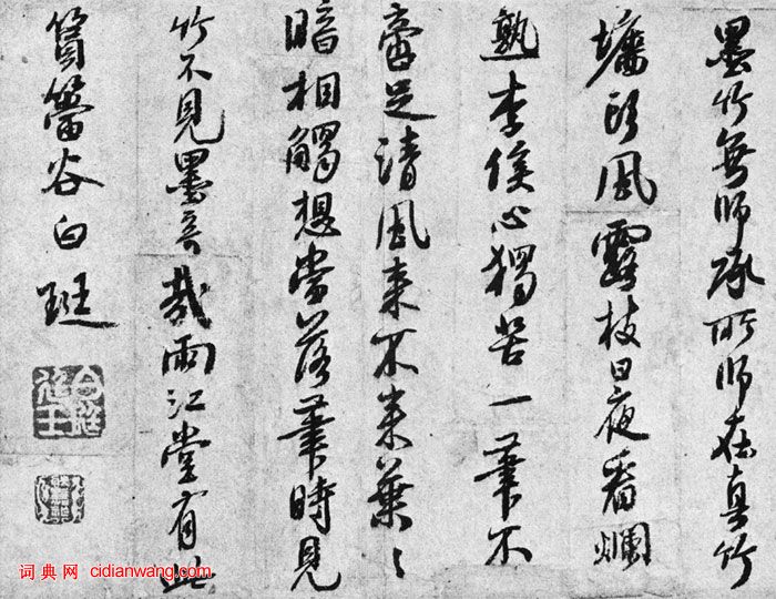 墨竹無師承。所師在真竹。牆頭風露枝。日夜看爛熟。李侯心獨苦。一筆不啻足。清風來不來。葉葉暗相觸。想當落筆時。見竹不見墨。寄哉雨江堂。有此篔簹谷。白珽。